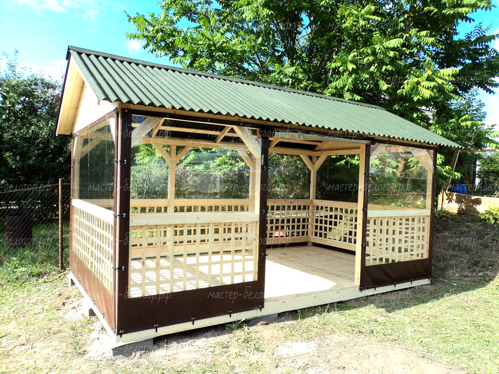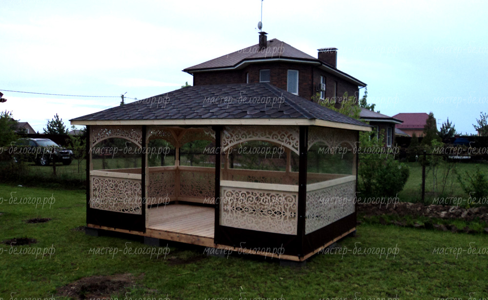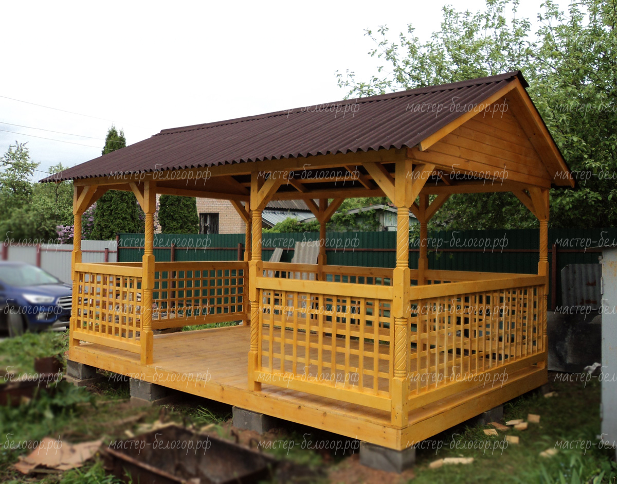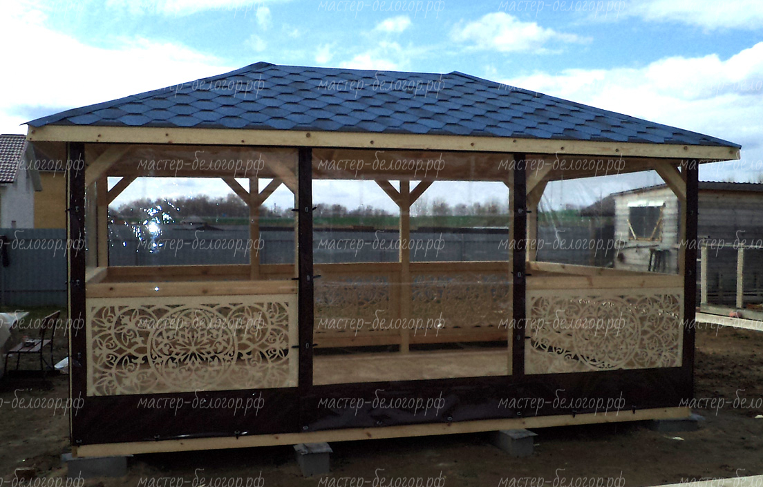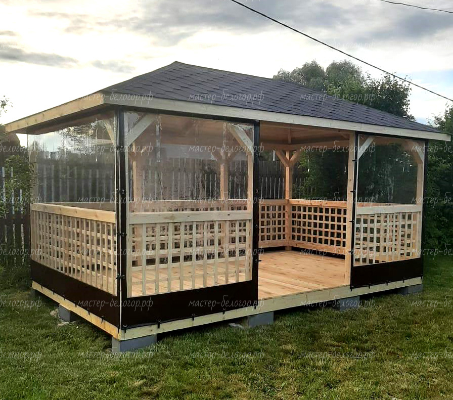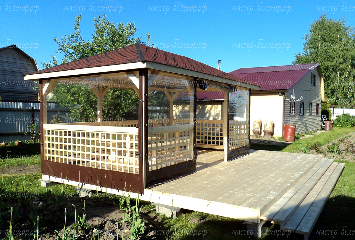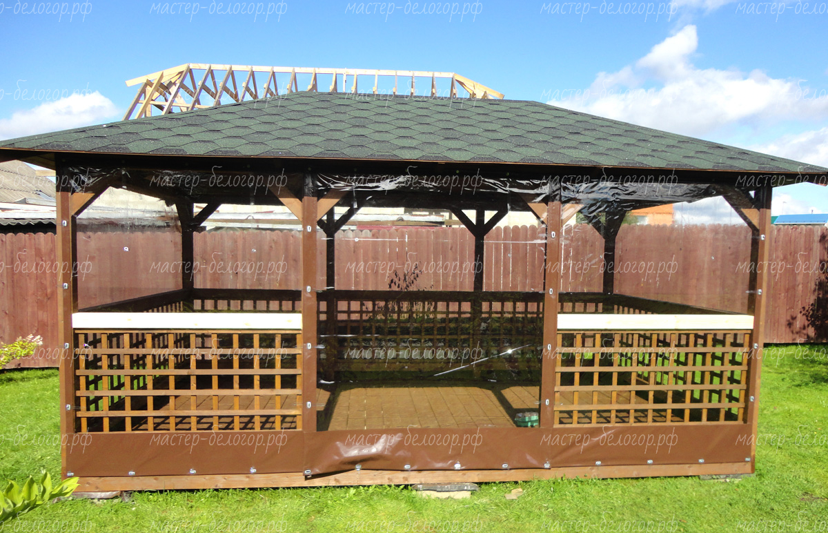 Крыша-ондулин,металлопрофиль или мягкая кровля(в зависимости от модели беседки).Цвет на выбор:красный,коричневый,зеленый