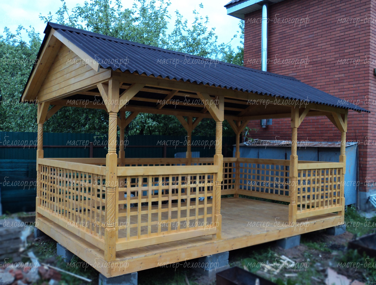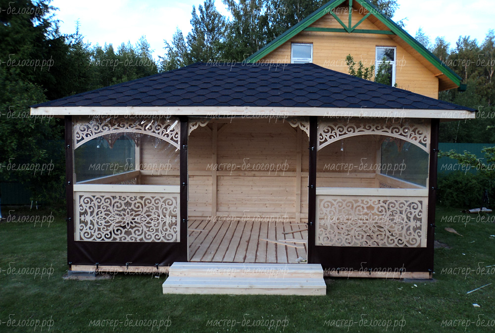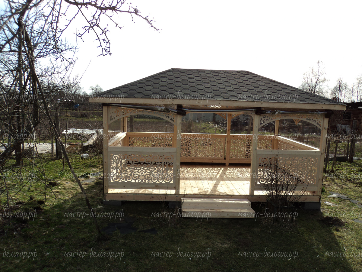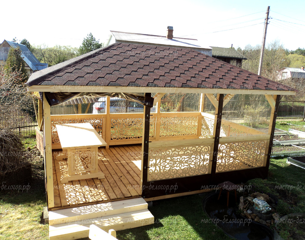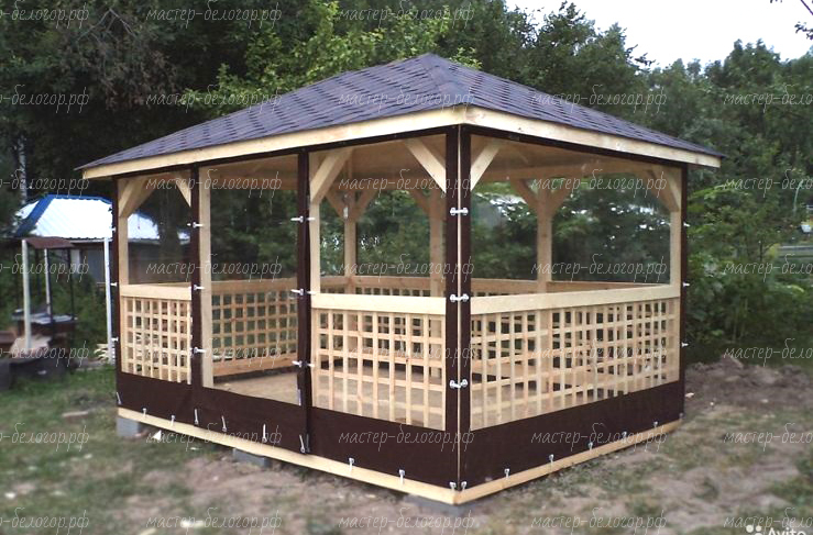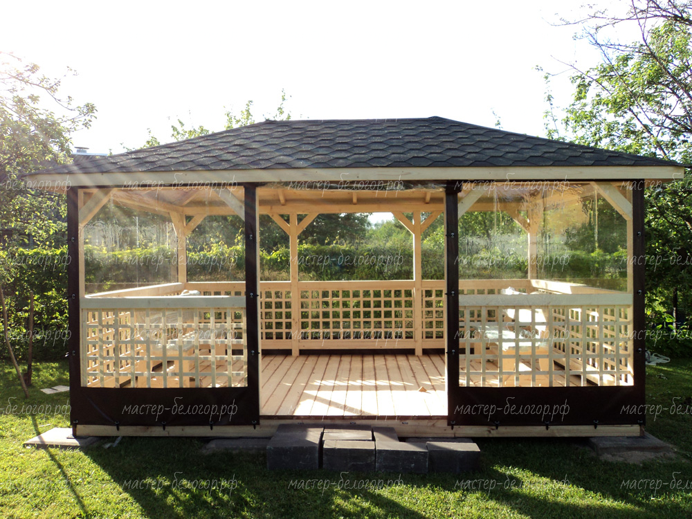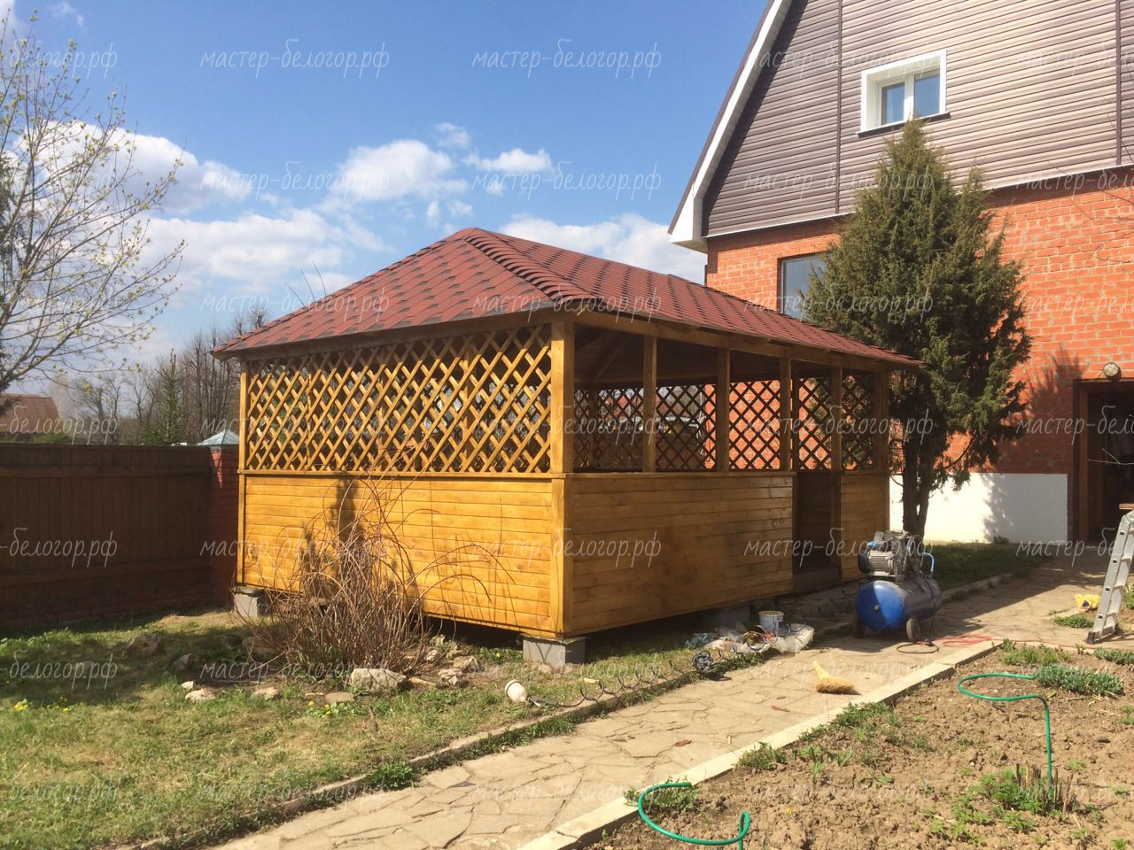 Крыша-ондулин,металлопрофиль или мягкая кровля(в зависимости от модели беседки).Цвет на выбор:красный,коричневый,зеленый