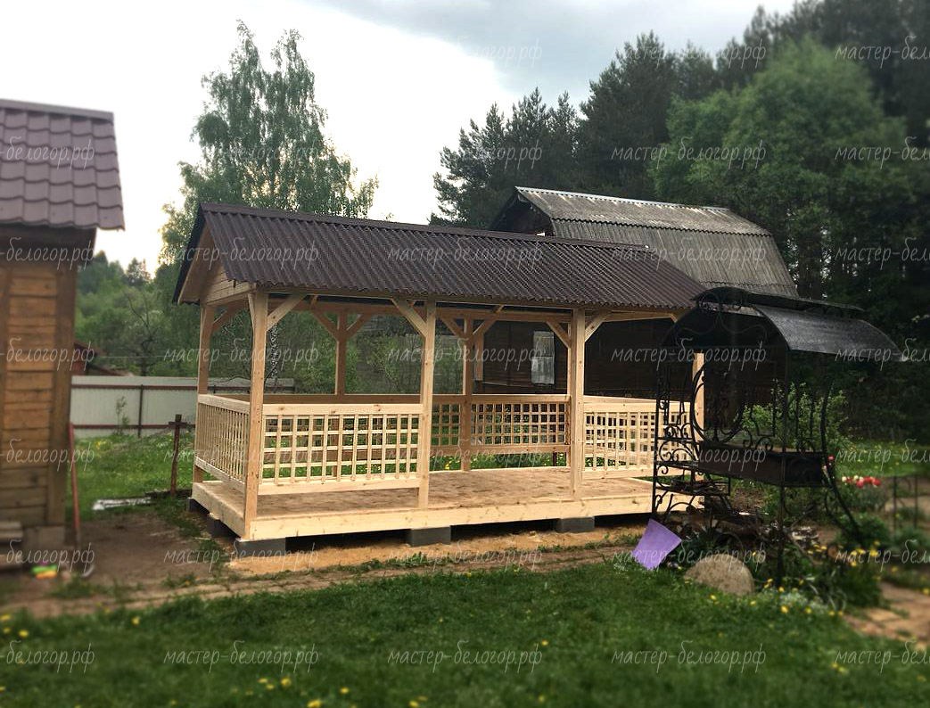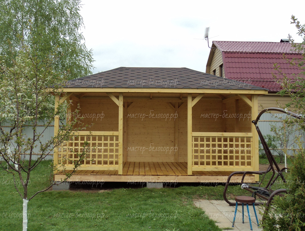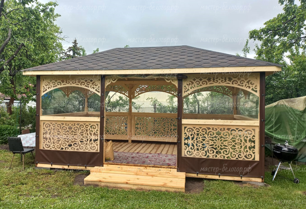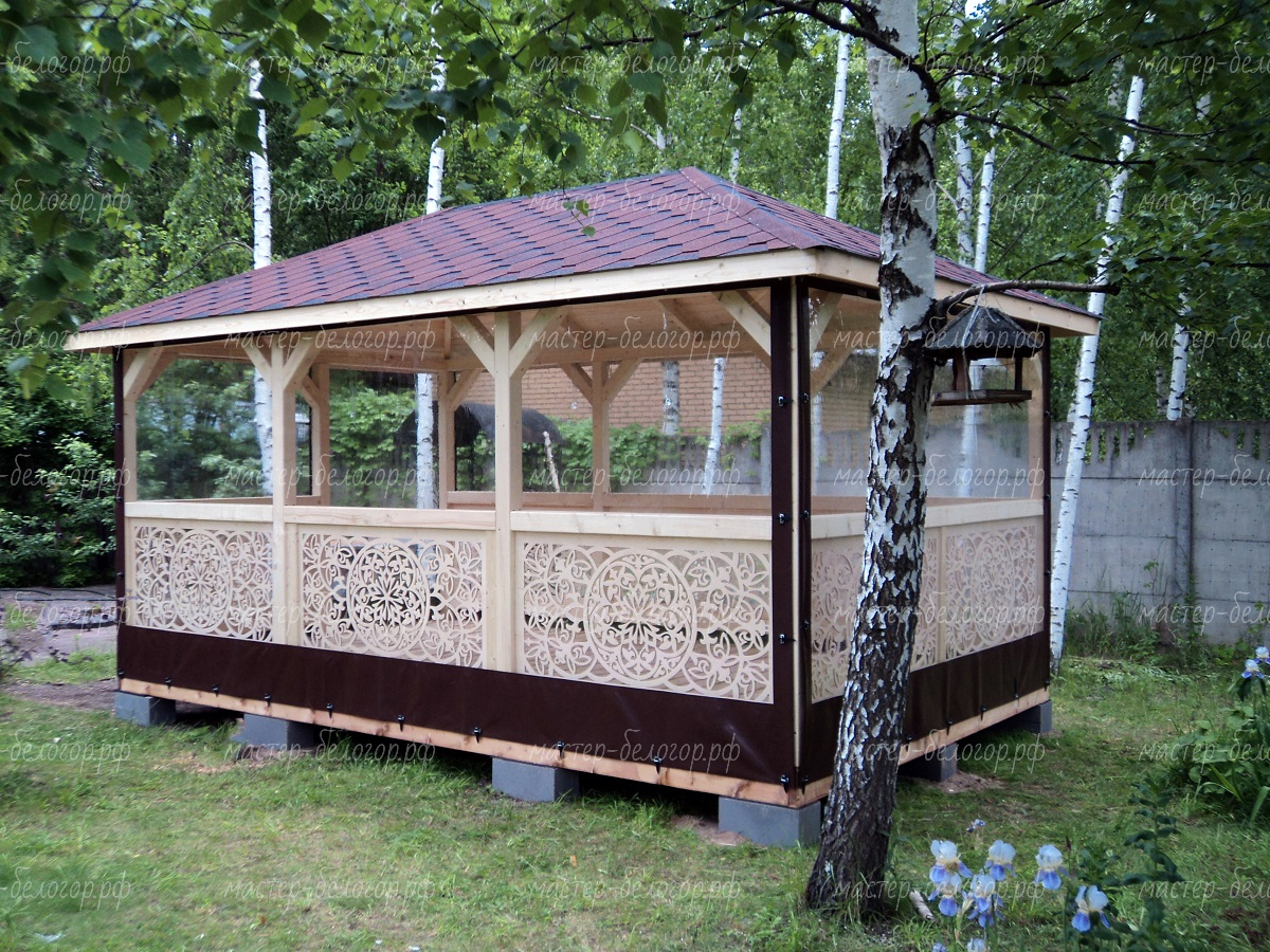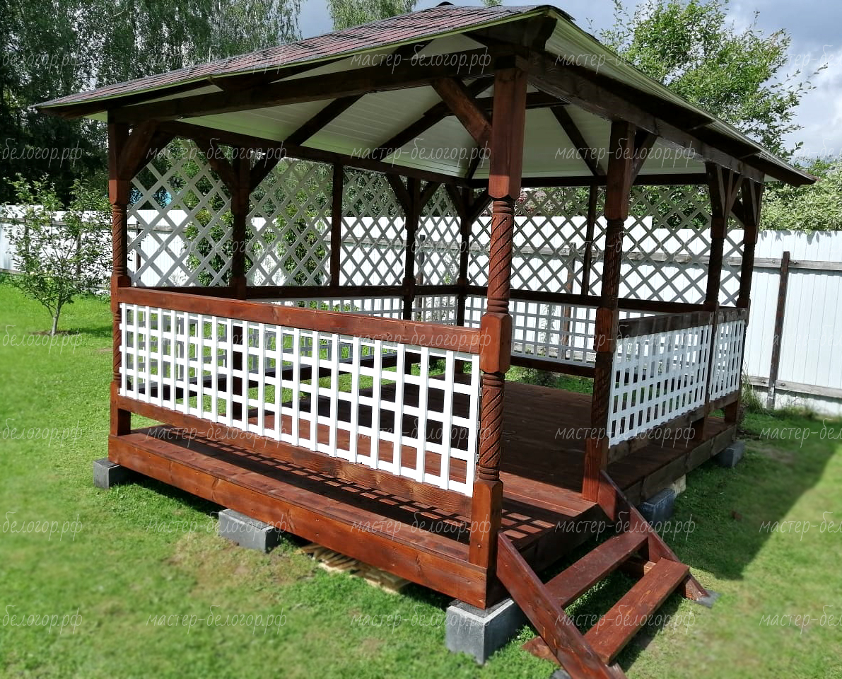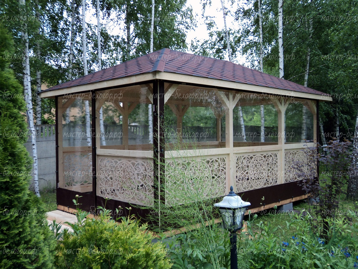 Крыша-ондулин,металлопрофиль или мягкая кровля(в зависимости от модели беседки).Цвет на выбор:красный,коричневый,зеленый