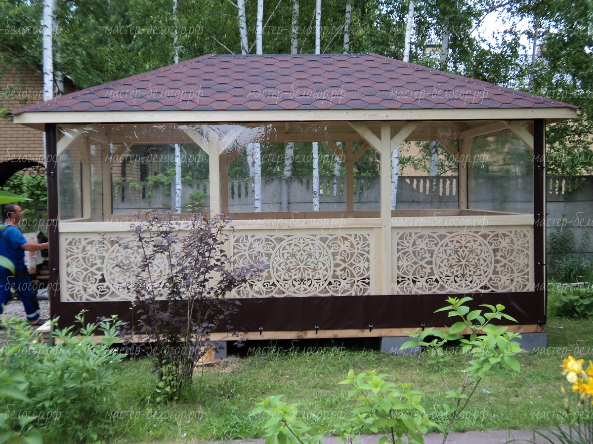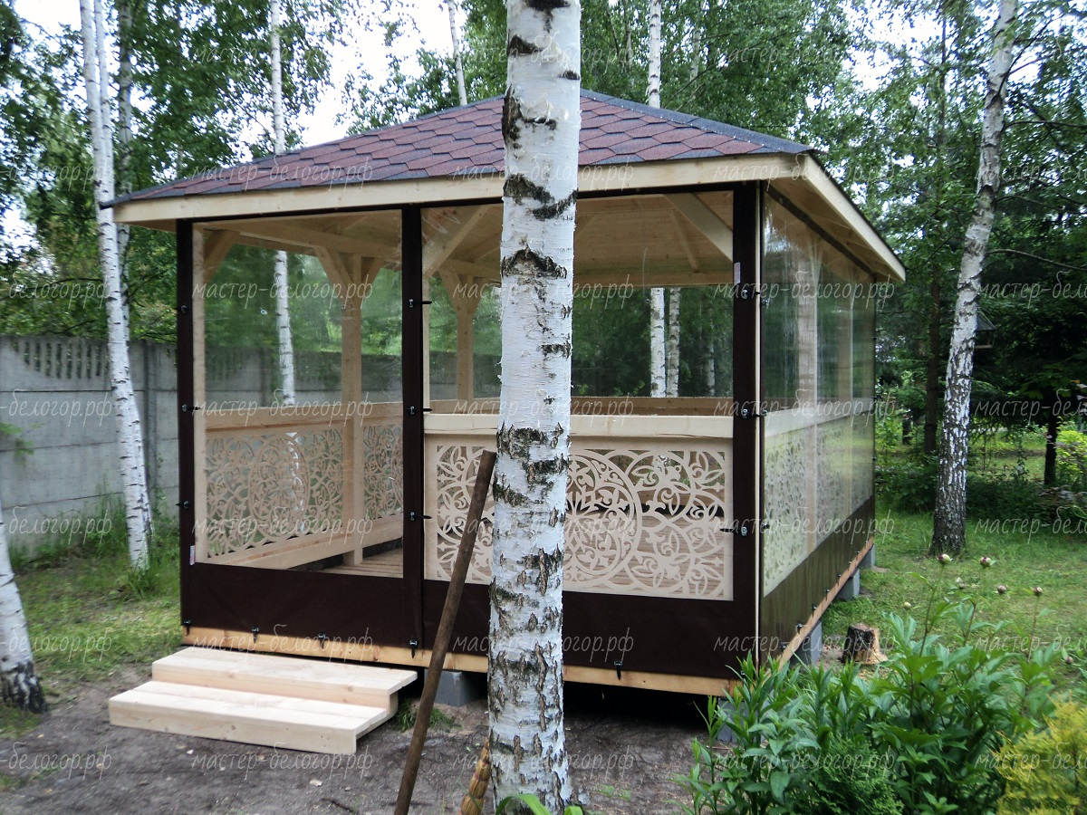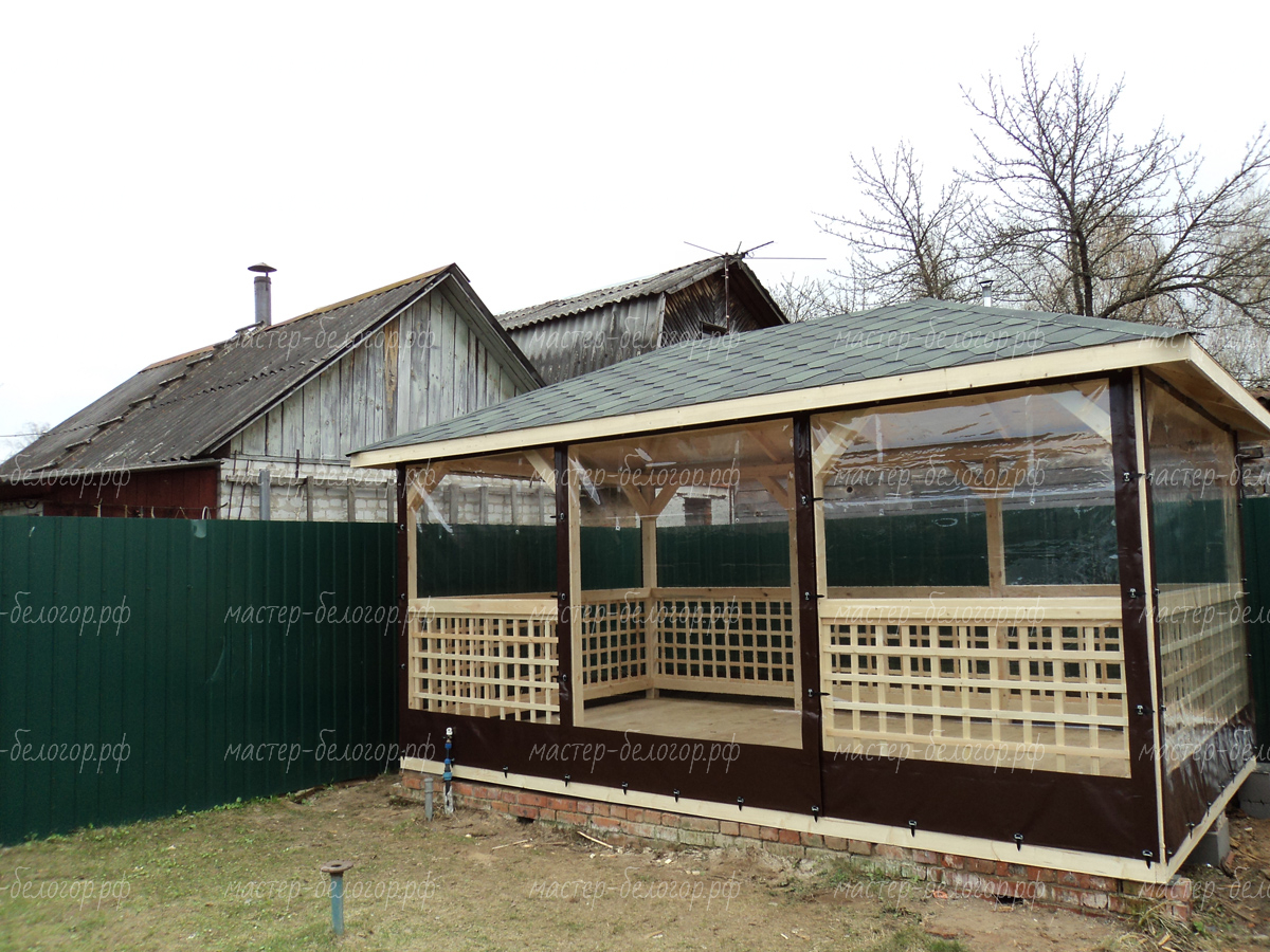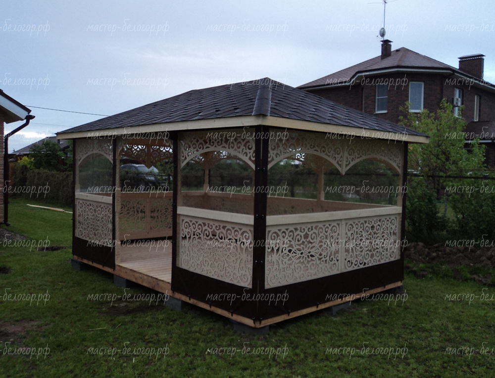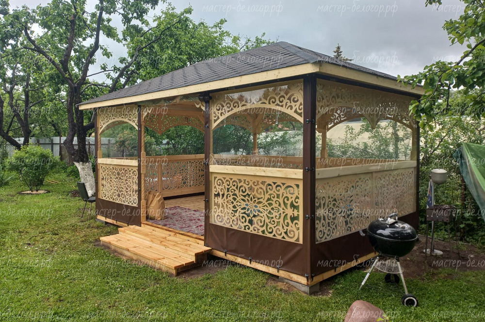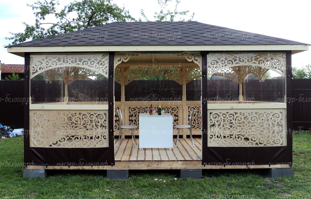 Крыша-ондулин,металлопрофиль или мягкая кровля(в зависимости от модели беседки).Цвет на выбор:красный,коричневый,зеленый