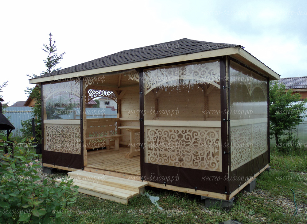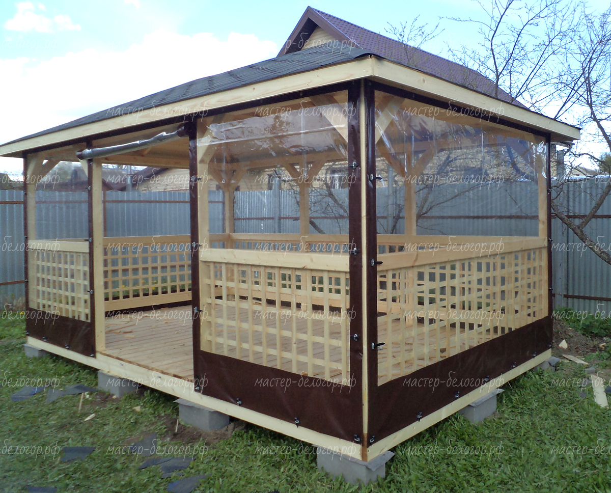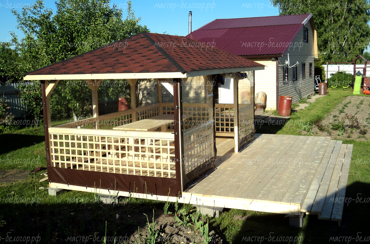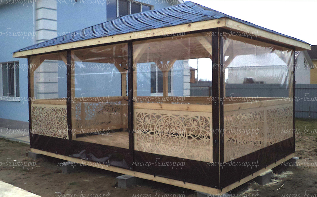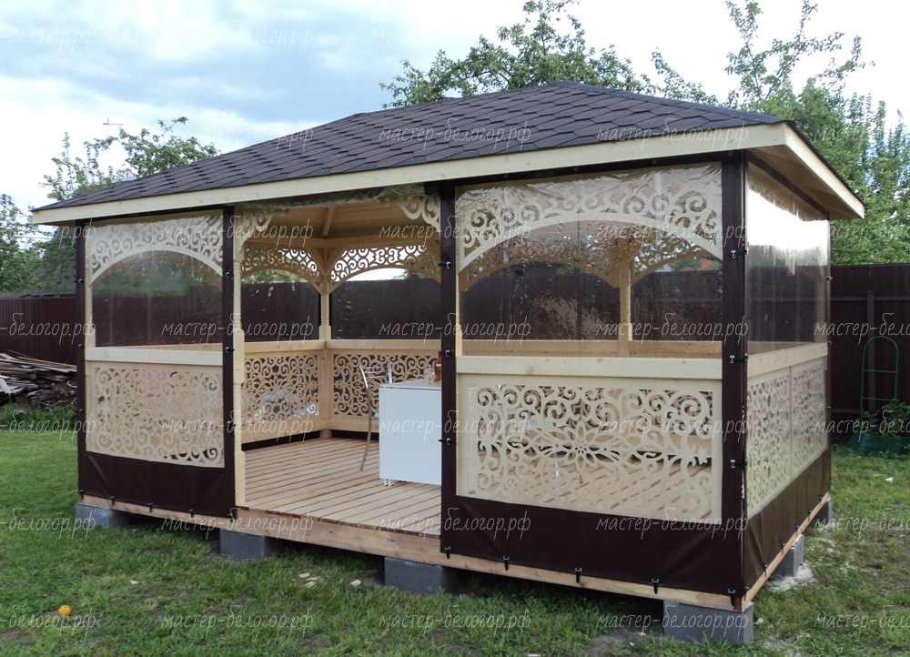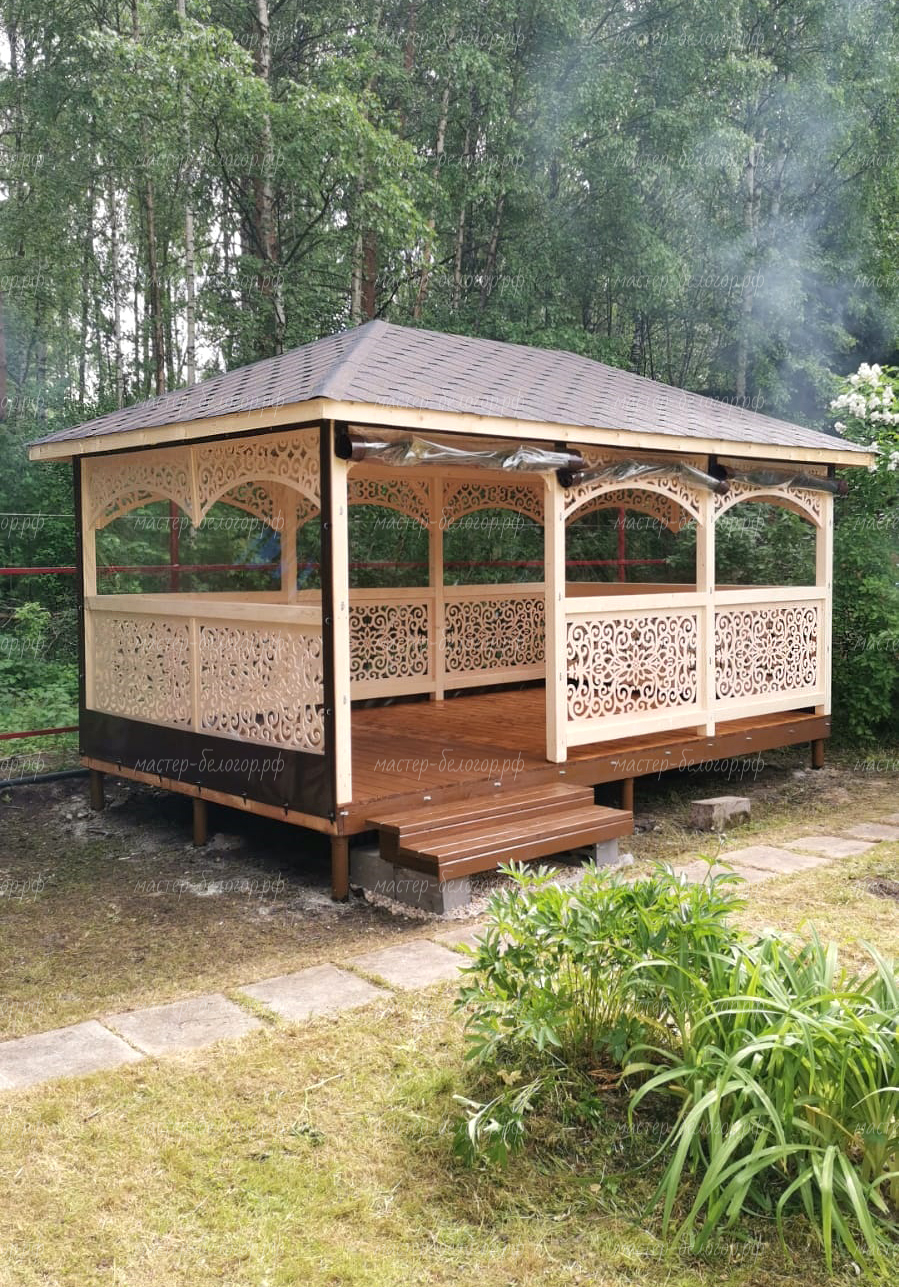 Крыша-ондулин,металлопрофиль или мягкая кровля(в зависимости от модели беседки).Цвет на выбор:красный,коричневый,зеленый