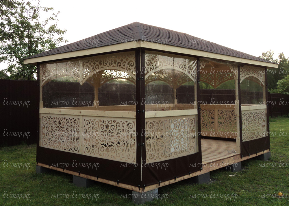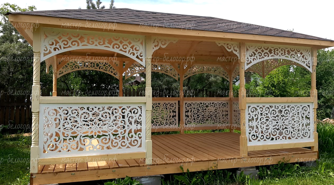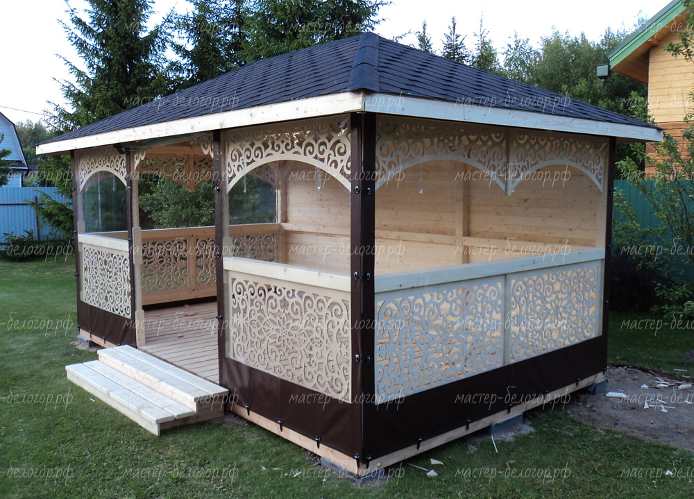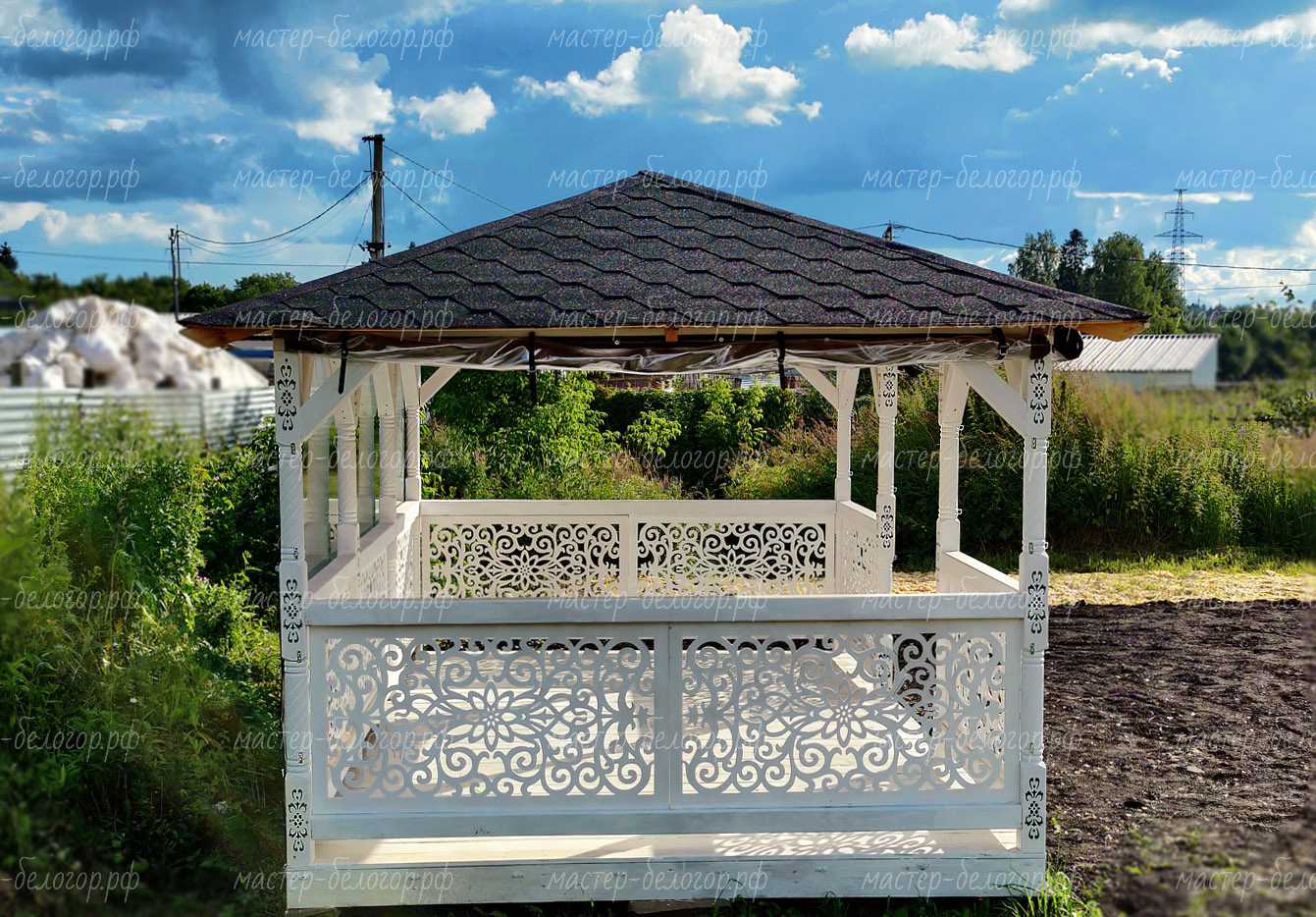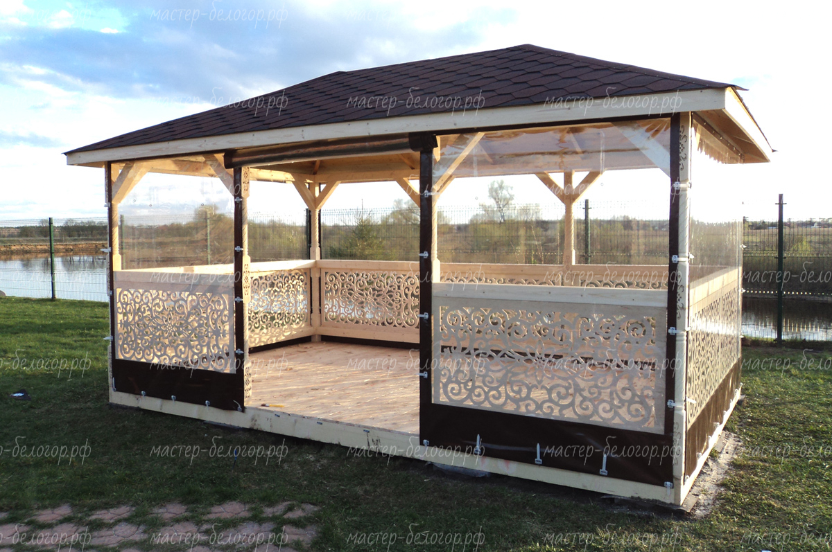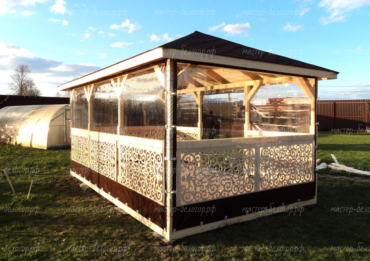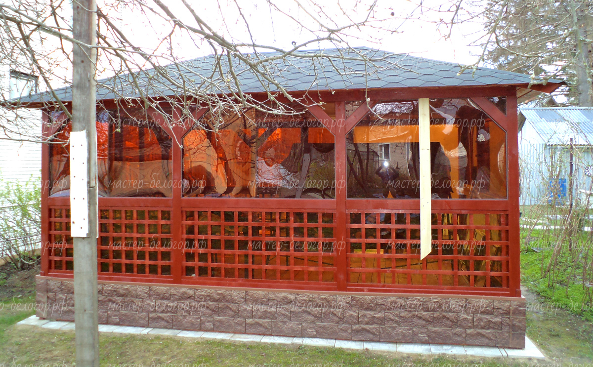 Крыша-ондулин,металлопрофиль или мягкая кровля(в зависимости от модели беседки).Цвет на выбор:красный,коричневый,зеленый
