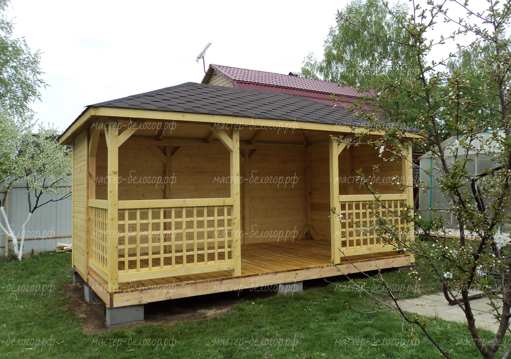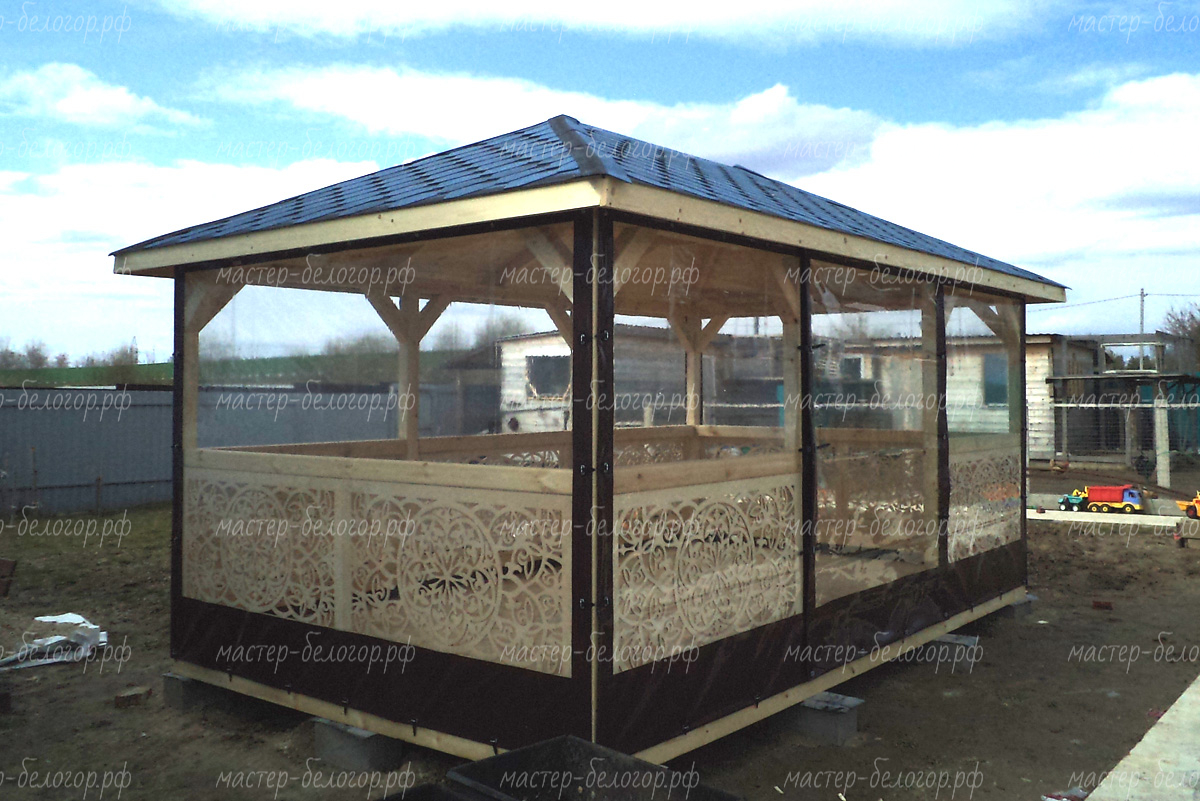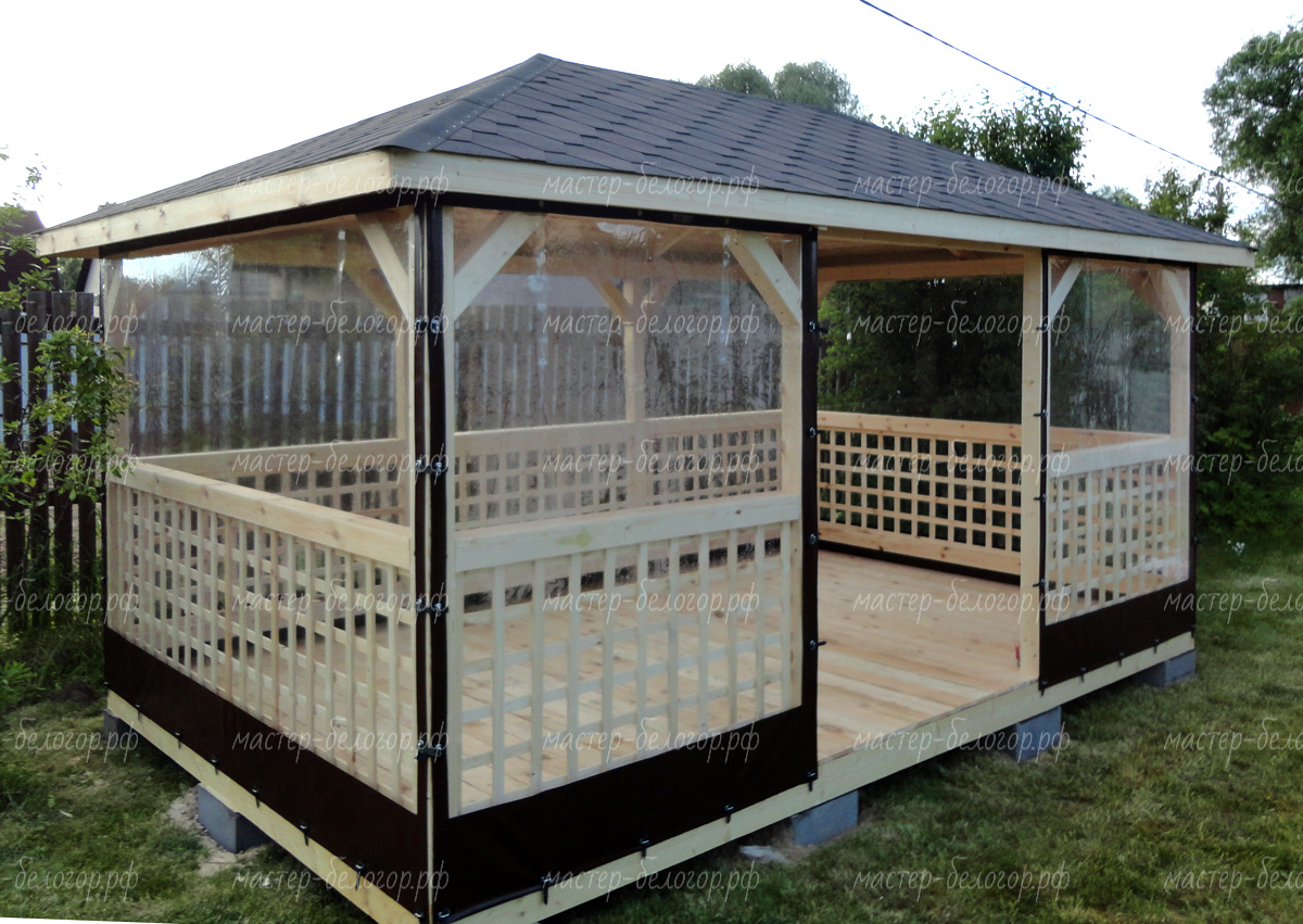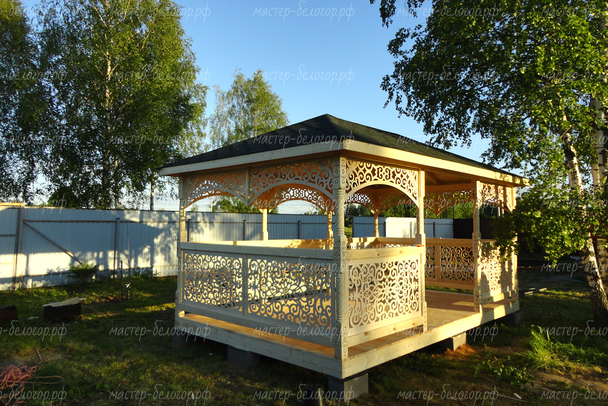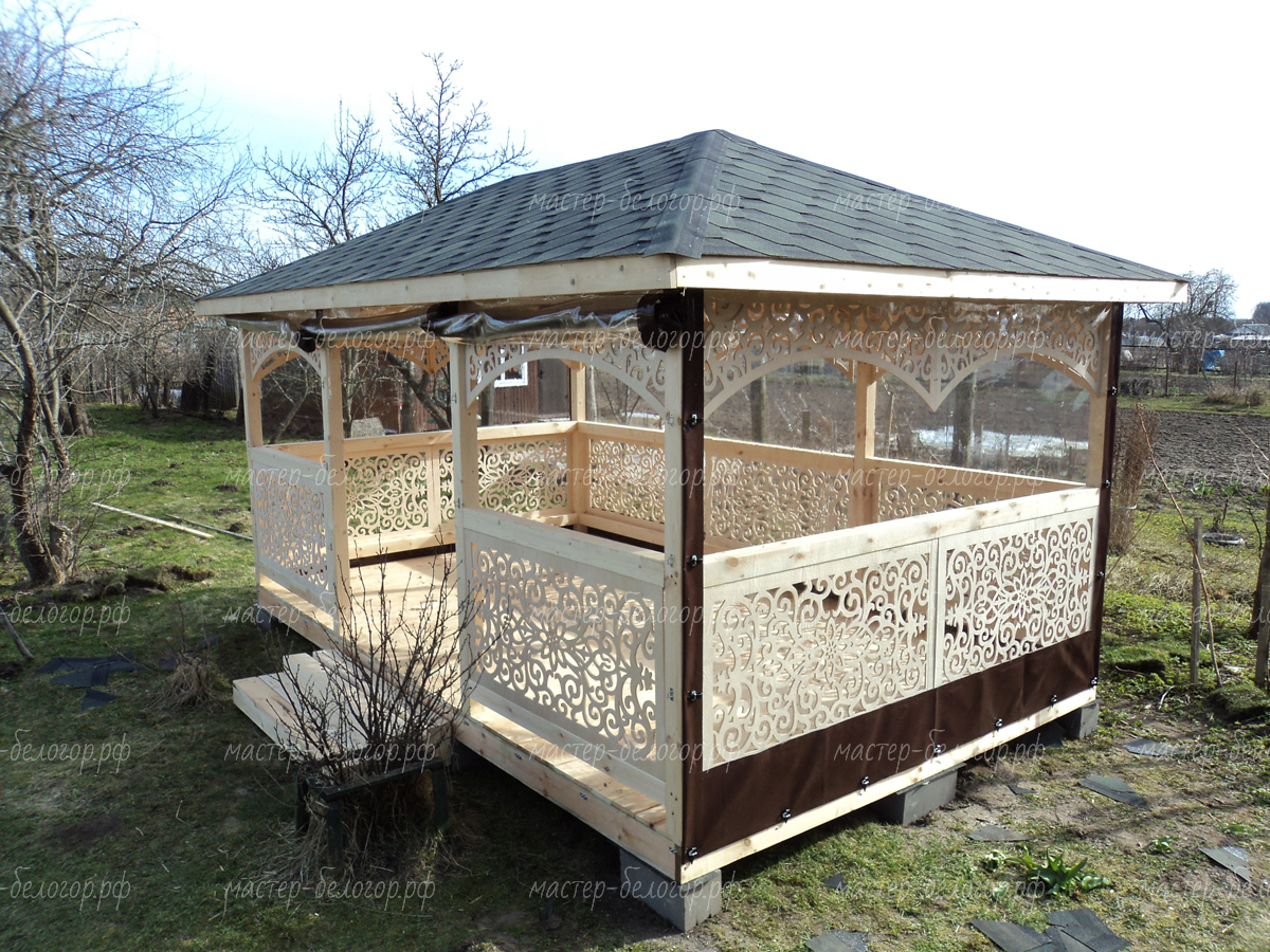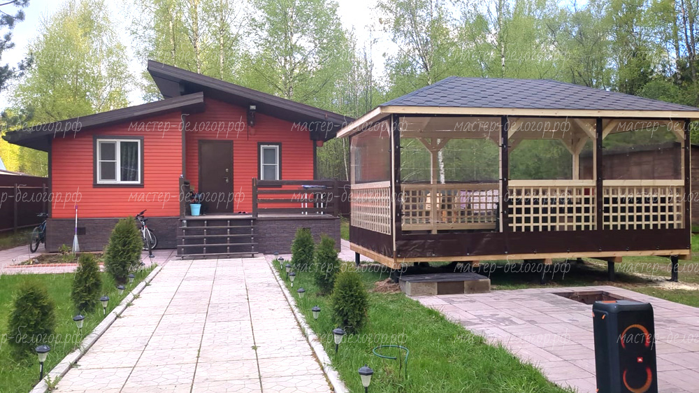Крыша-ондулин,металлопрофиль или мягкая кровля(в зависимости от модели беседки).Цвет на выбор:красный,коричневый,зеленый