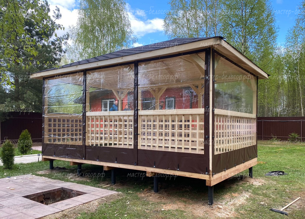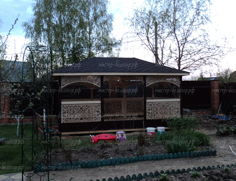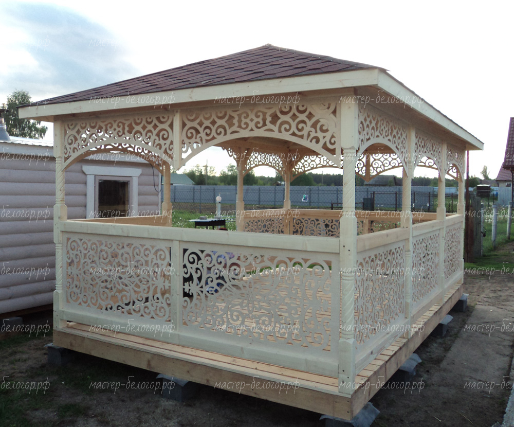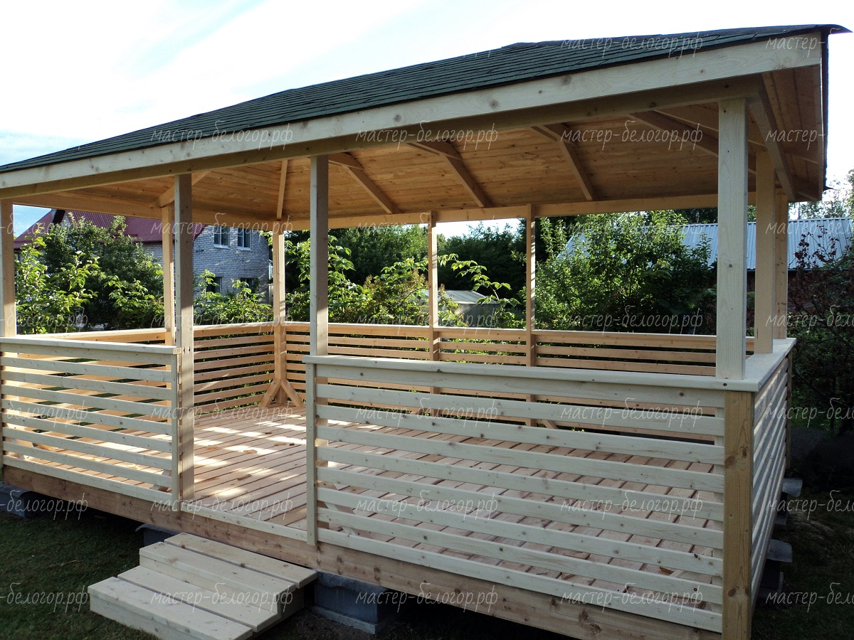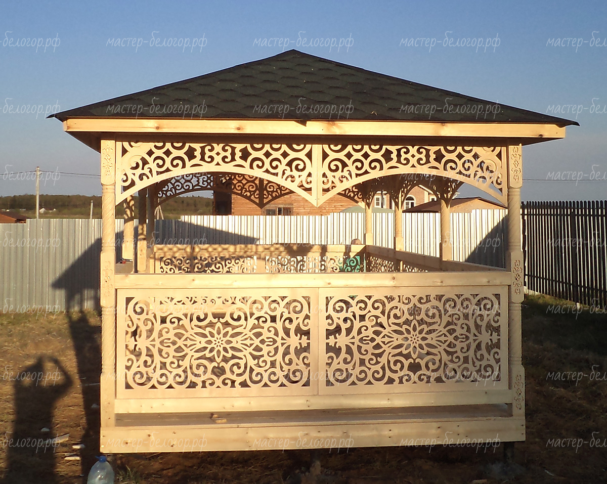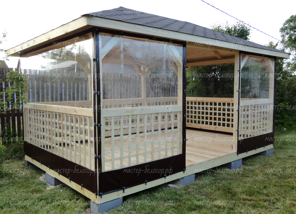 Крыша-ондулин,металлопрофиль или мягкая кровля(в зависимости от модели беседки).Цвет на выбор:красный,коричневый,зеленый