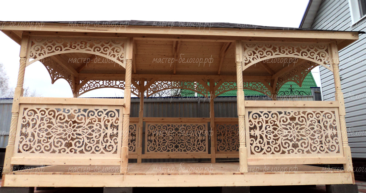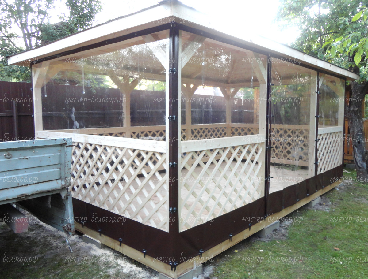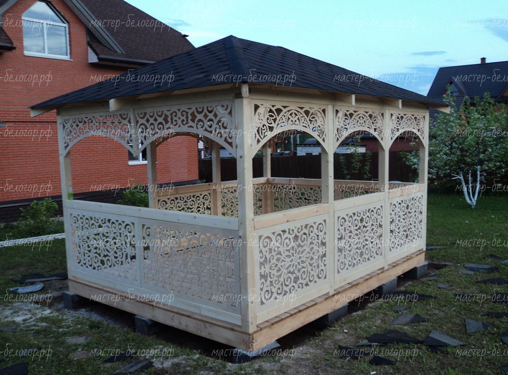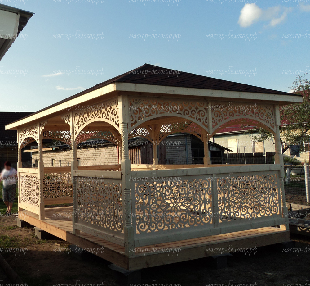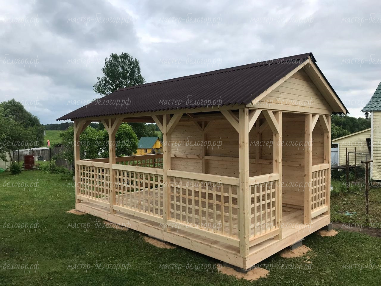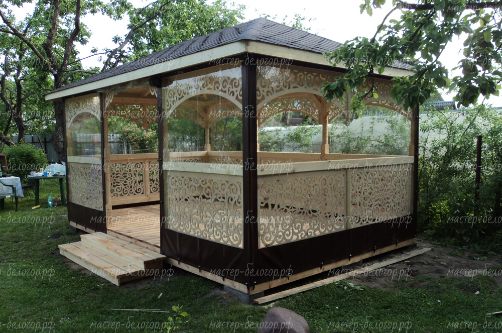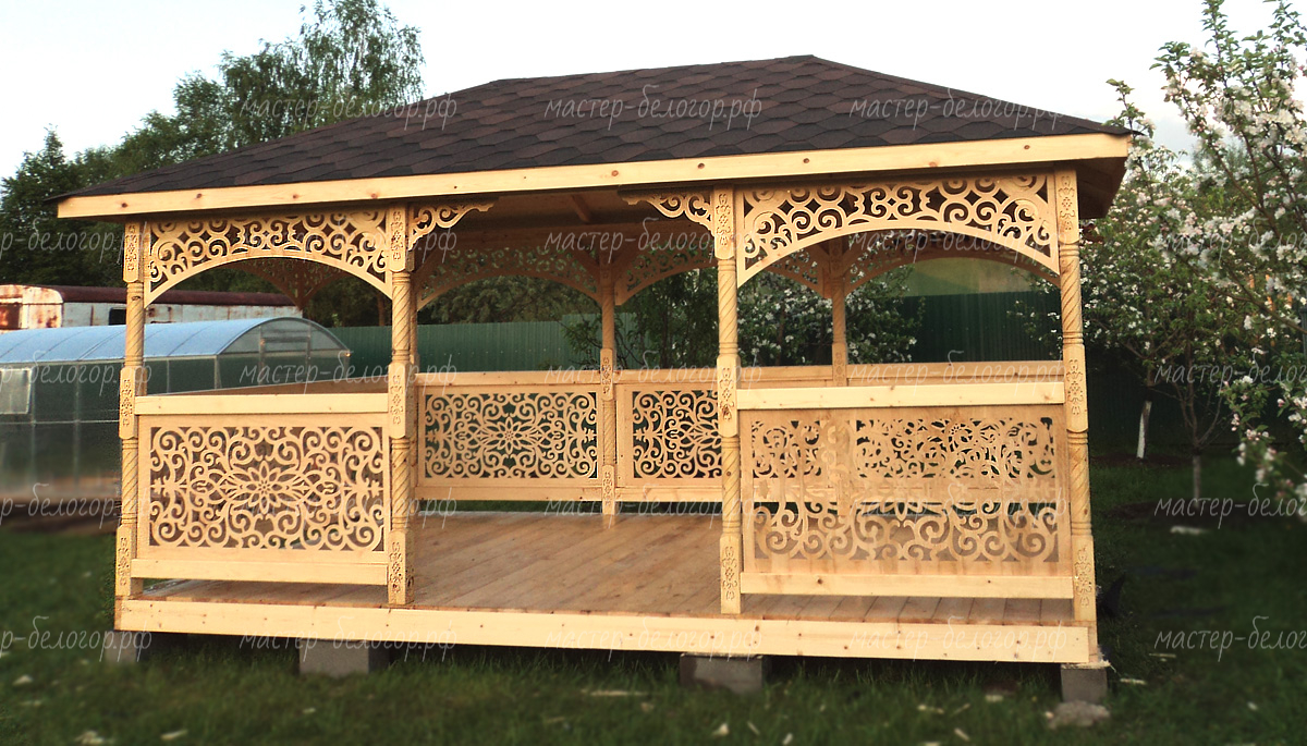 Крыша-ондулин,металлопрофиль или мягкая кровля(в зависимости от модели беседки).Цвет на выбор:красный,коричневый,зеленый