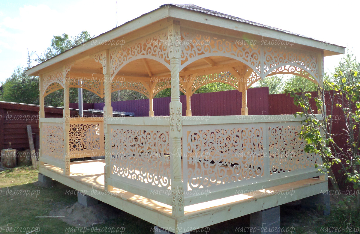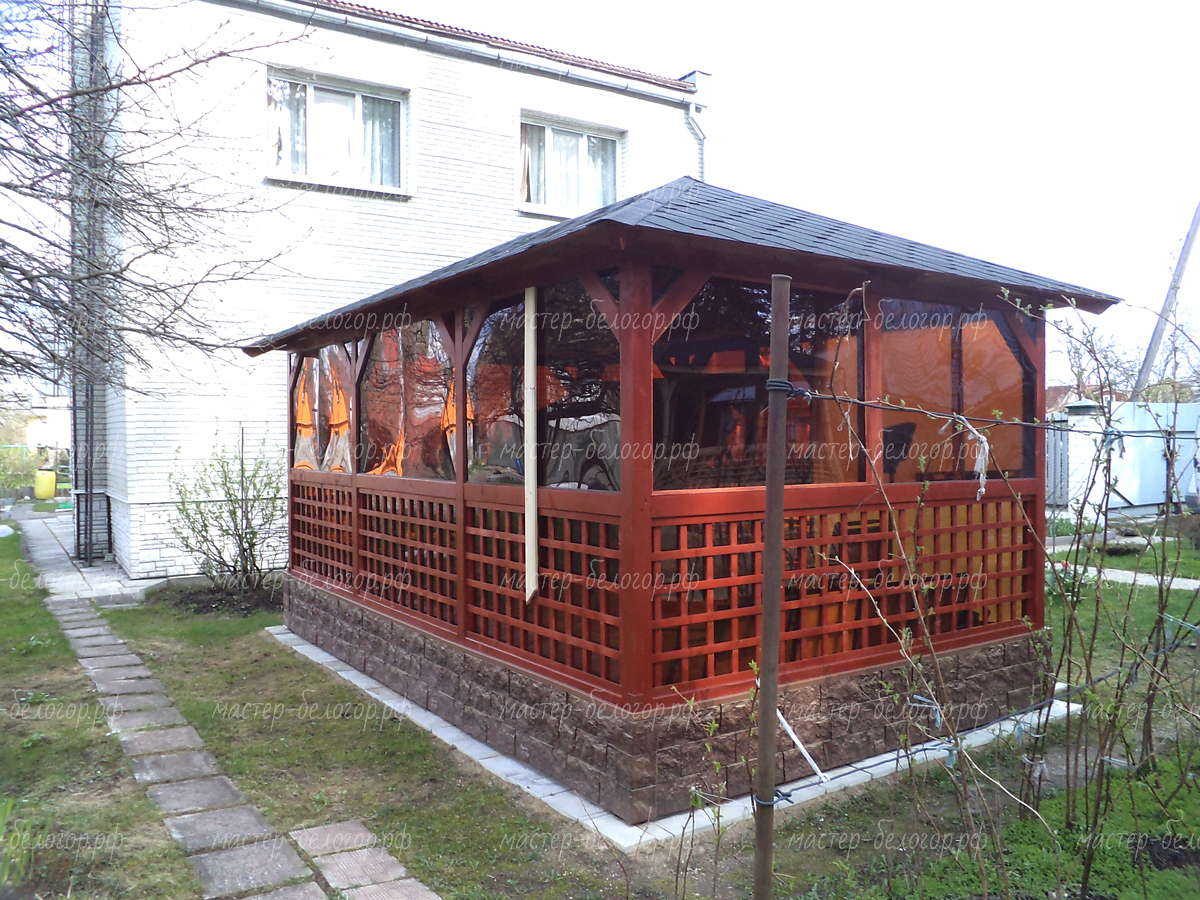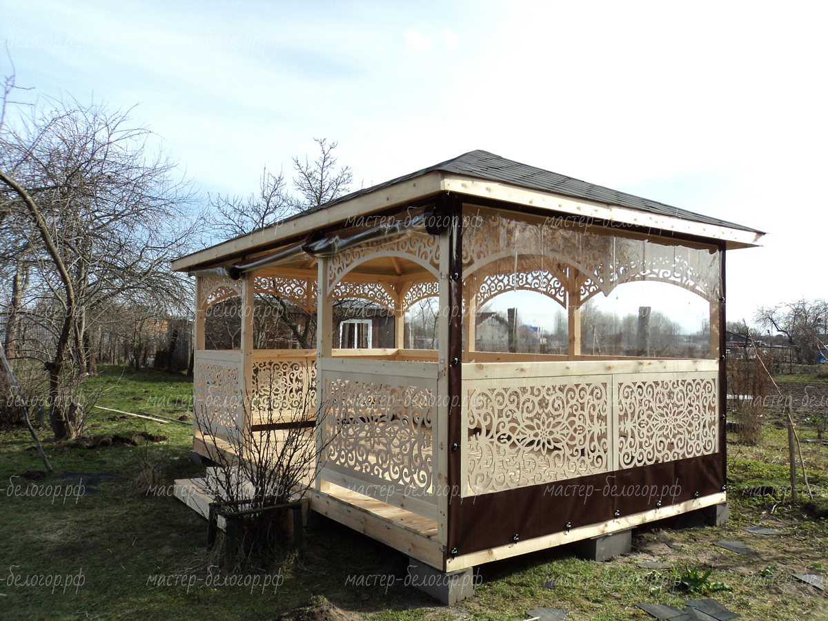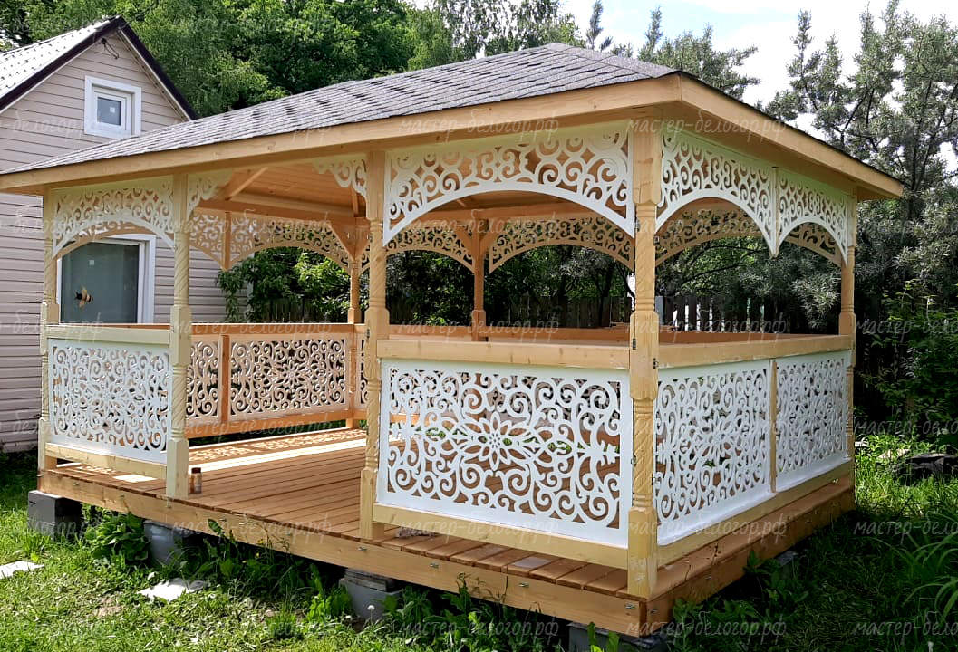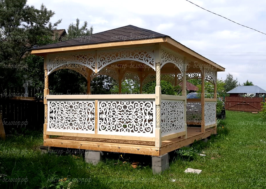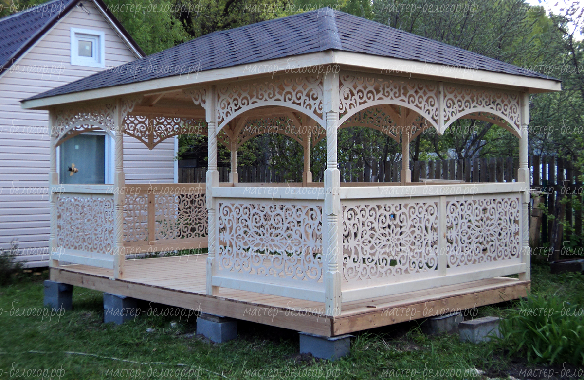 Крыша-ондулин,металлопрофиль или мягкая кровля(в зависимости от модели беседки).Цвет на выбор:красный,коричневый,зеленый
