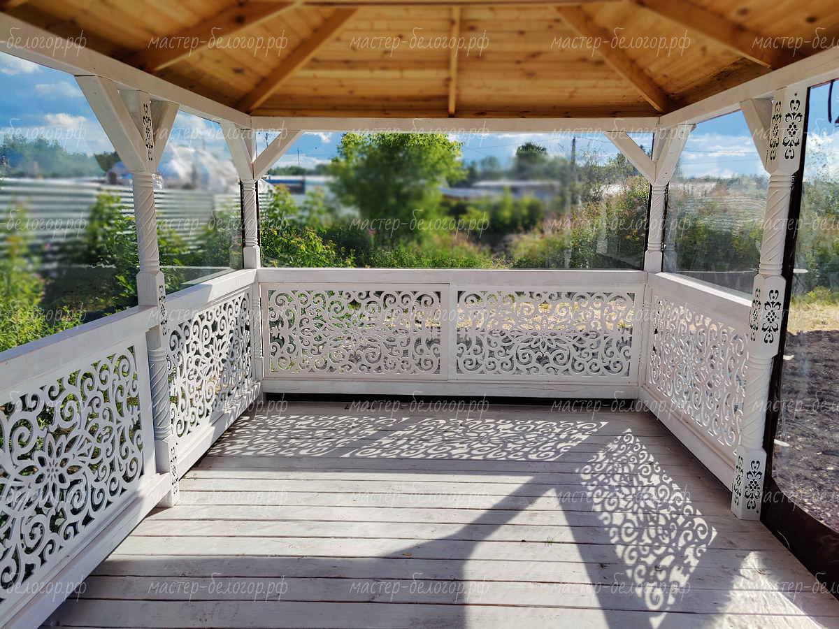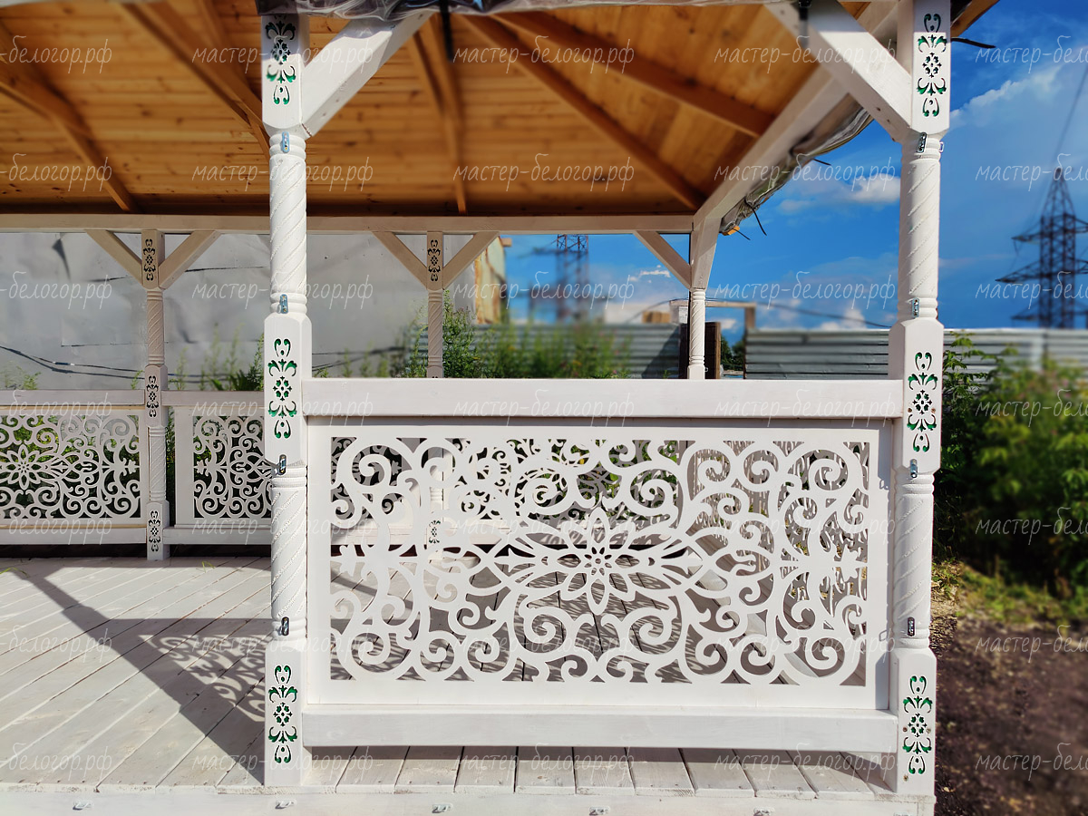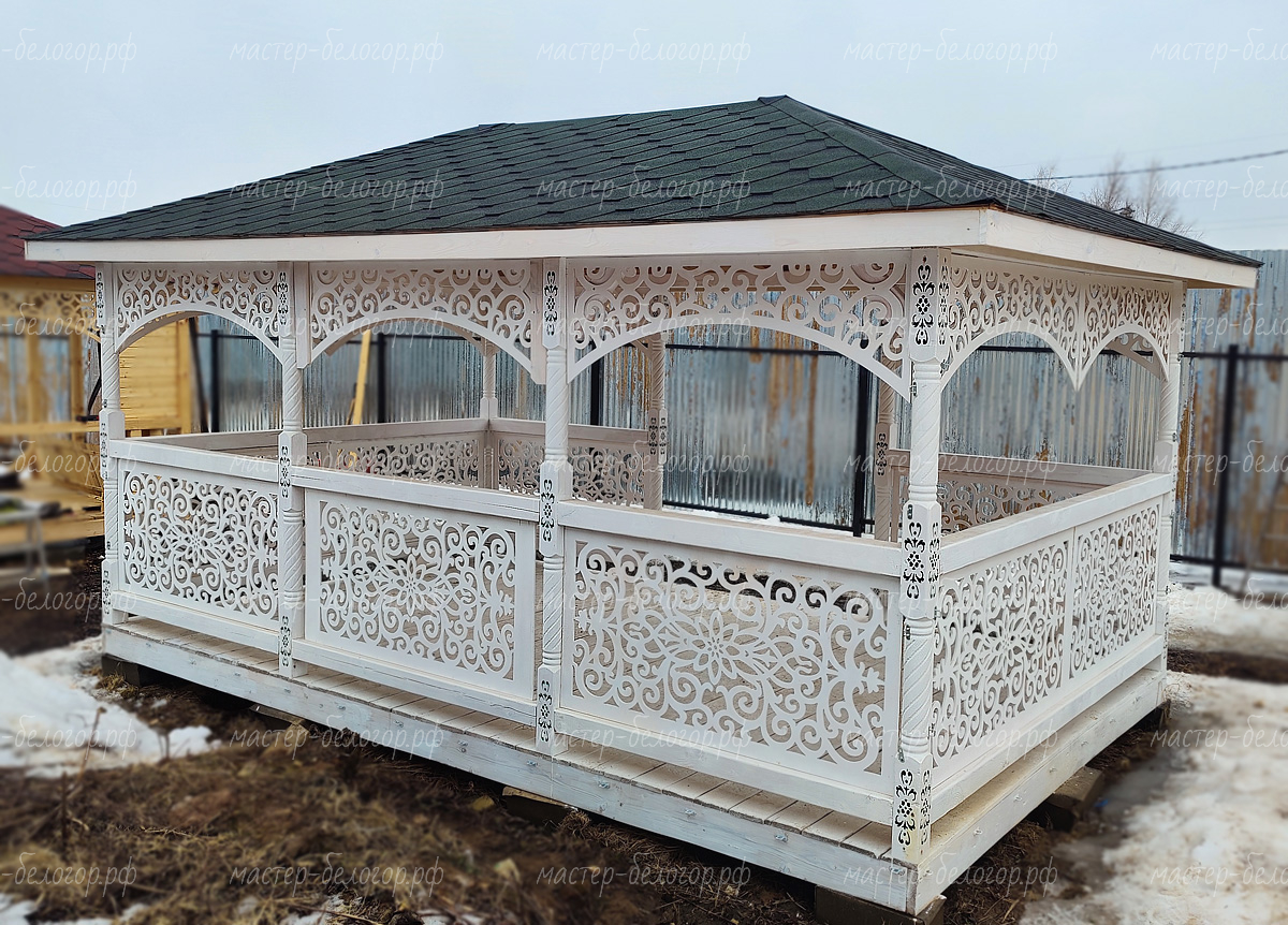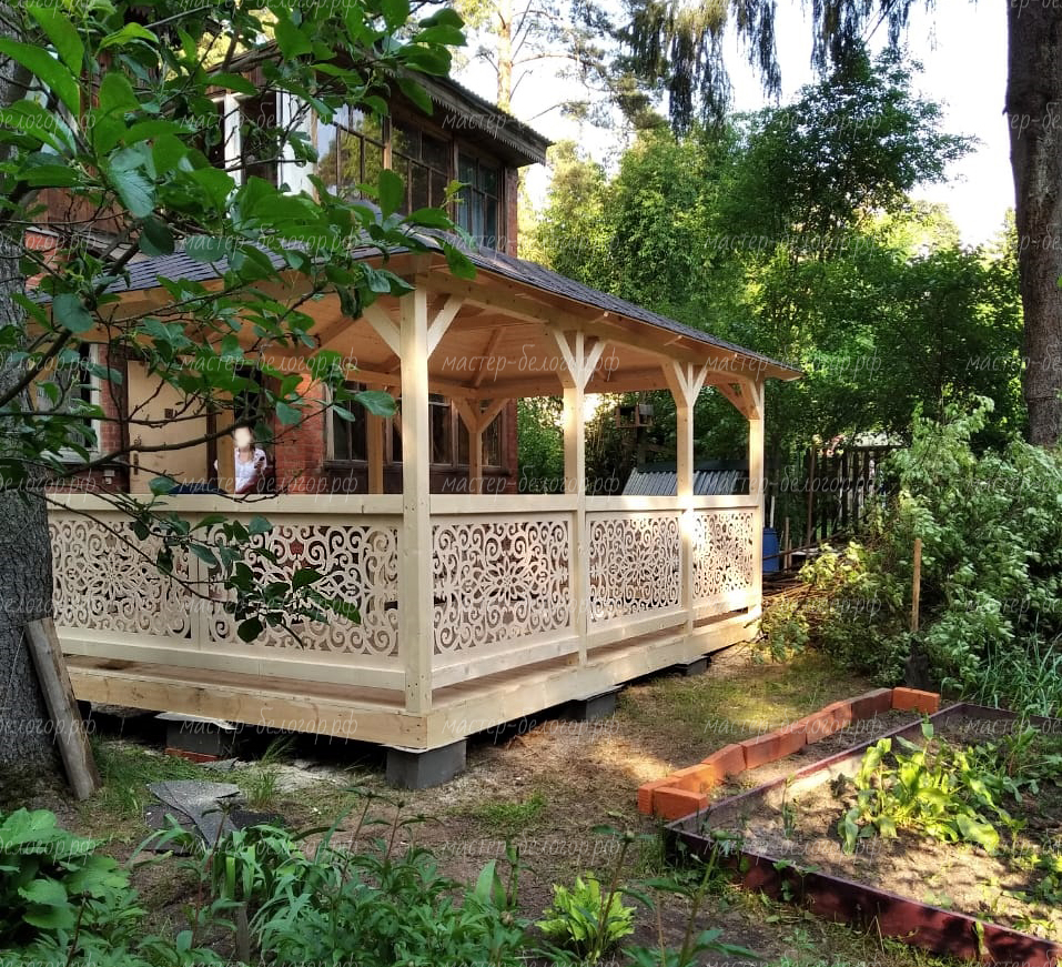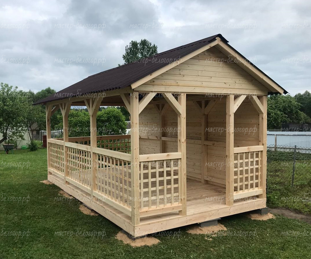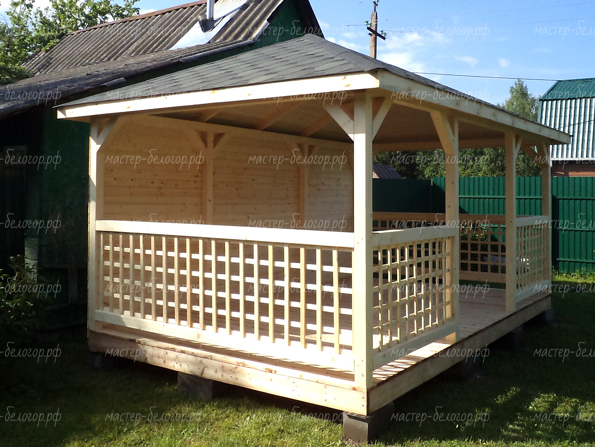 Крыша-ондулин,металлопрофиль или мягкая кровля(в зависимости от модели беседки).Цвет на выбор:красный,коричневый,зеленый