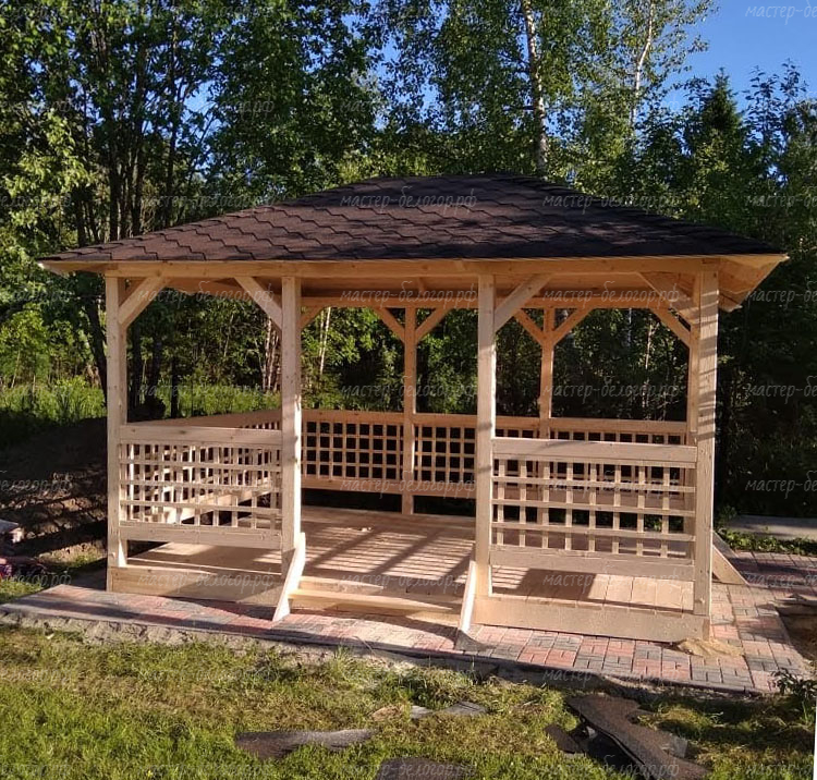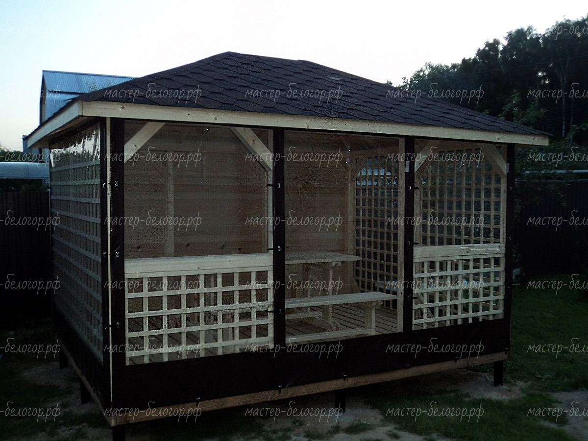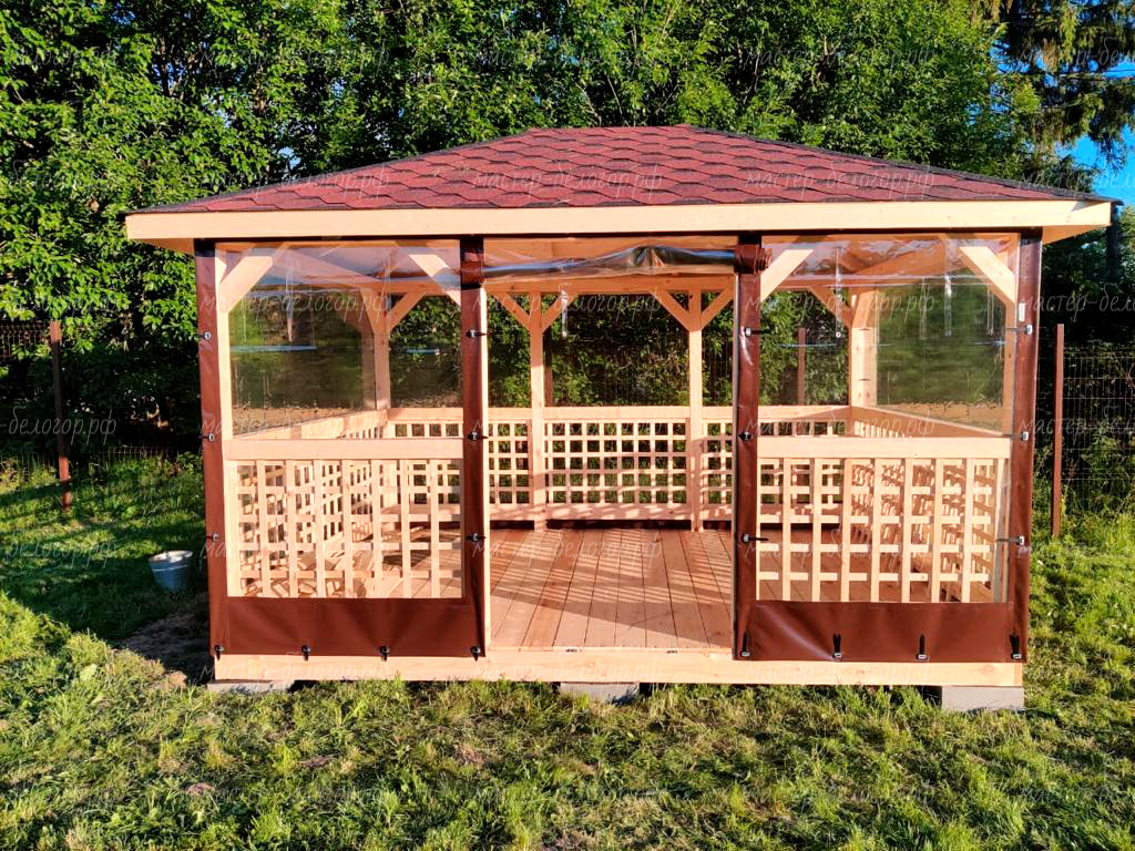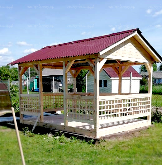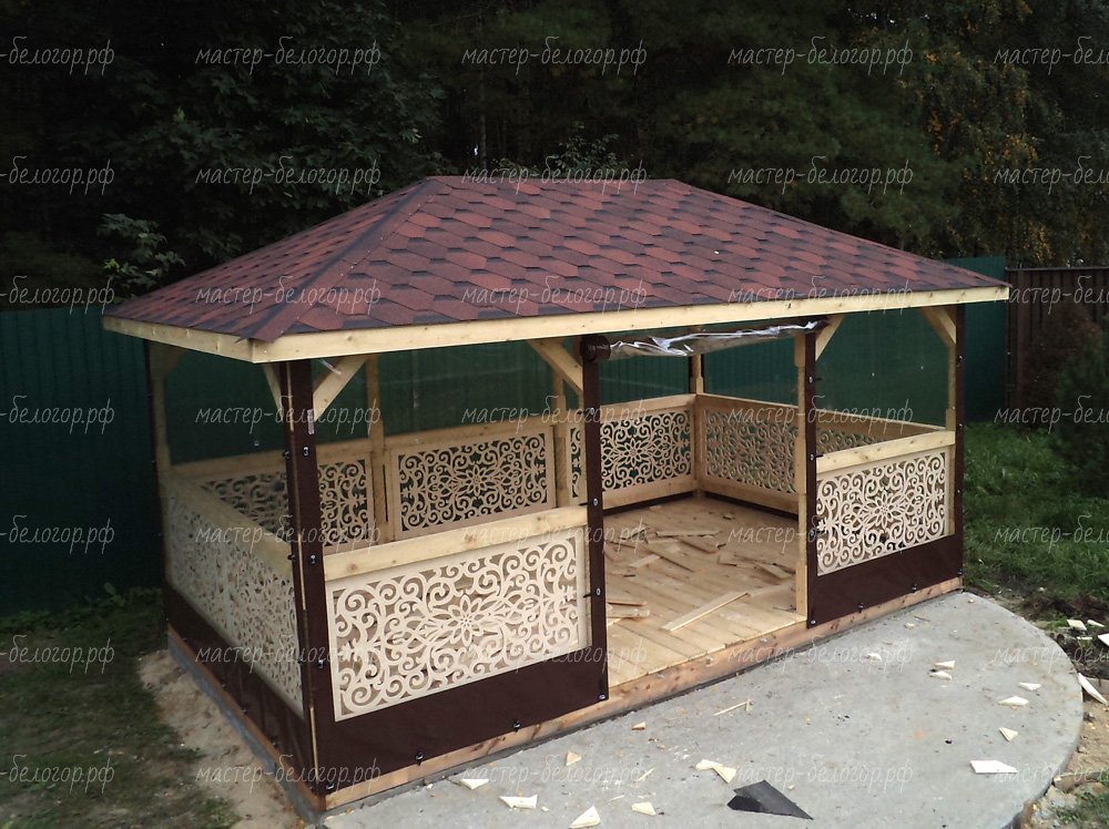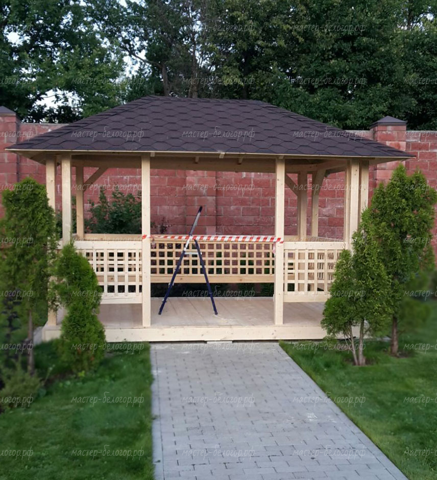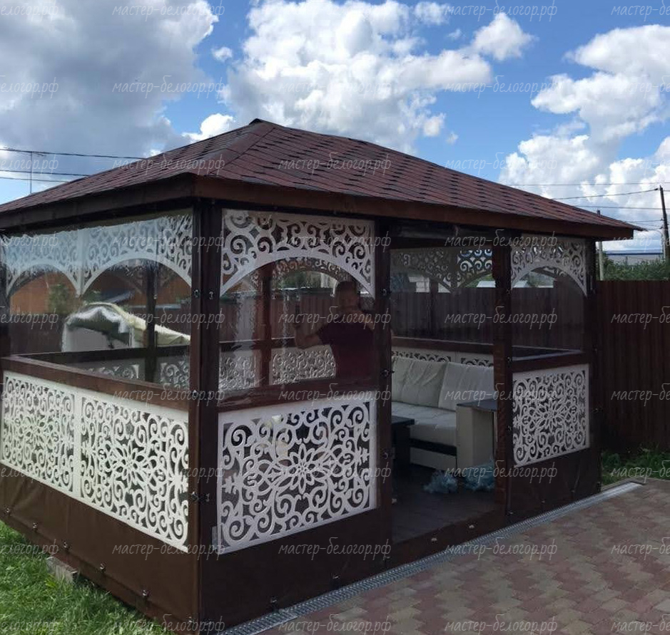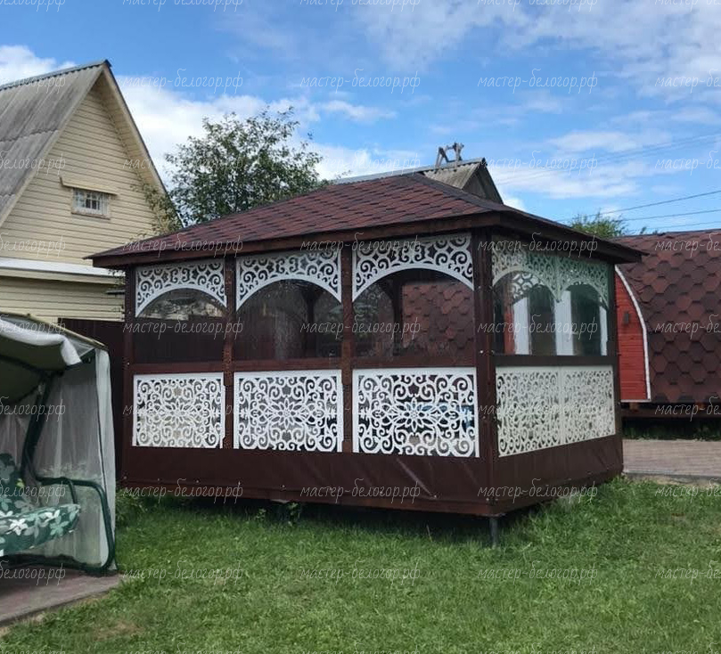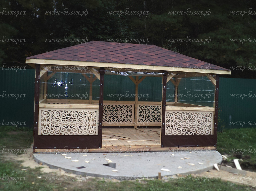 Крыша-ондулин,металлопрофиль или мягкая кровля(в зависимости от модели беседки).Цвет на выбор:красный,коричневый,зеленый.