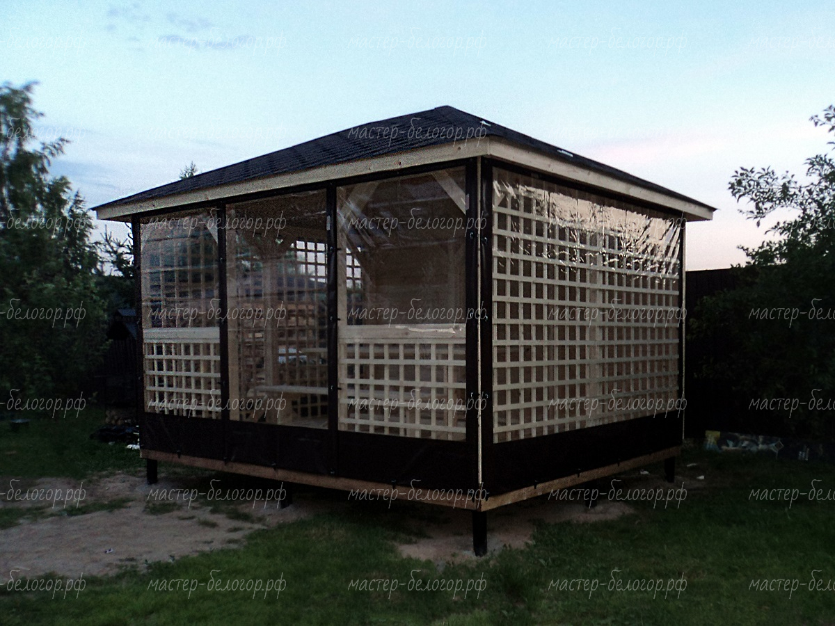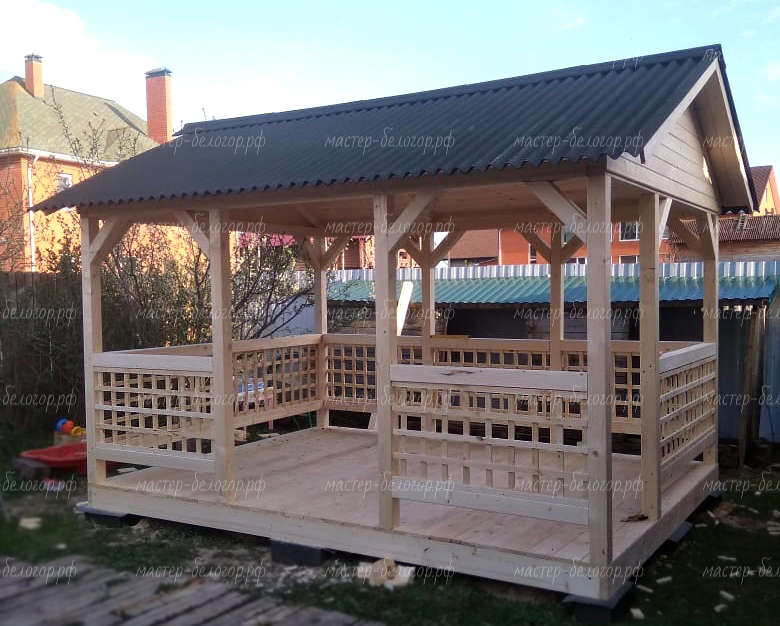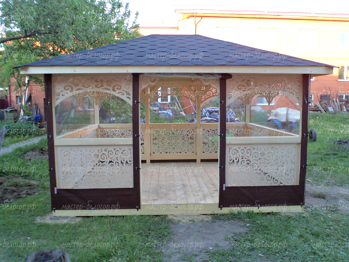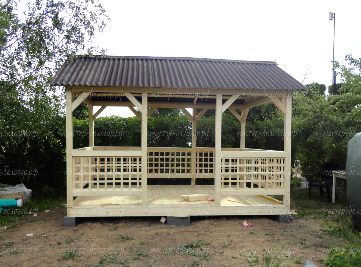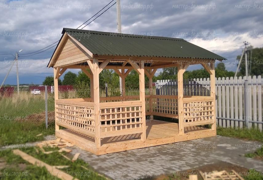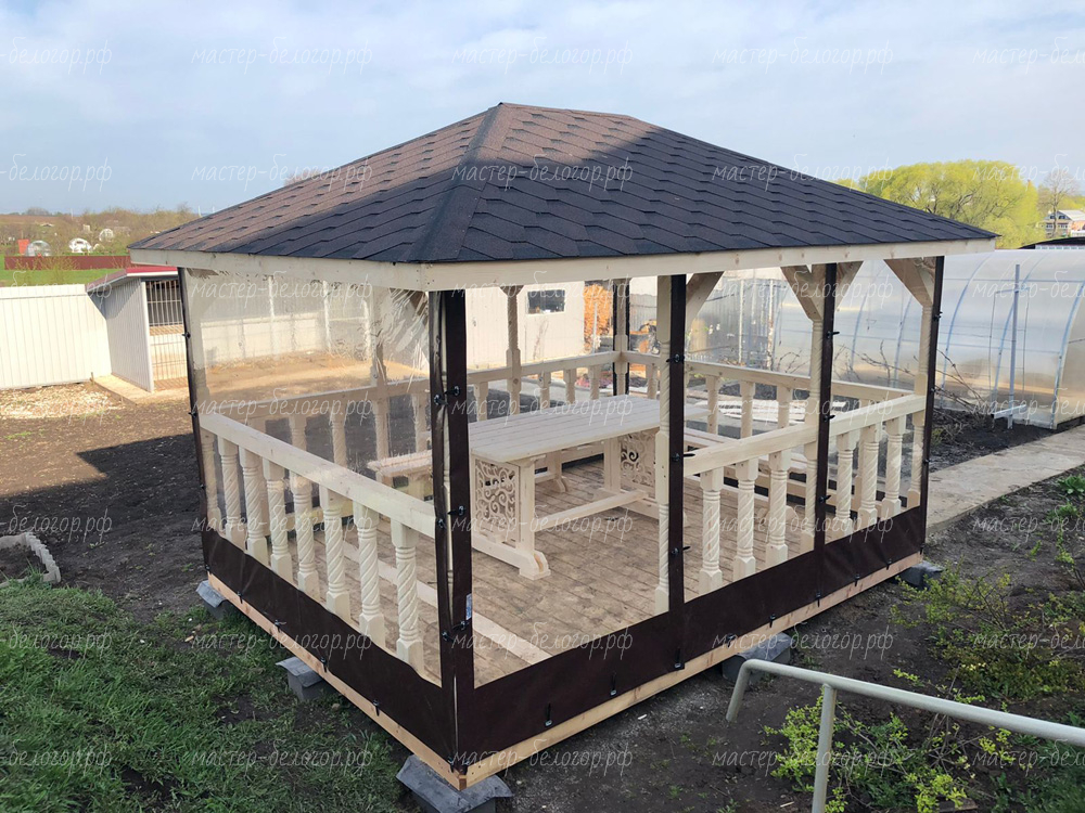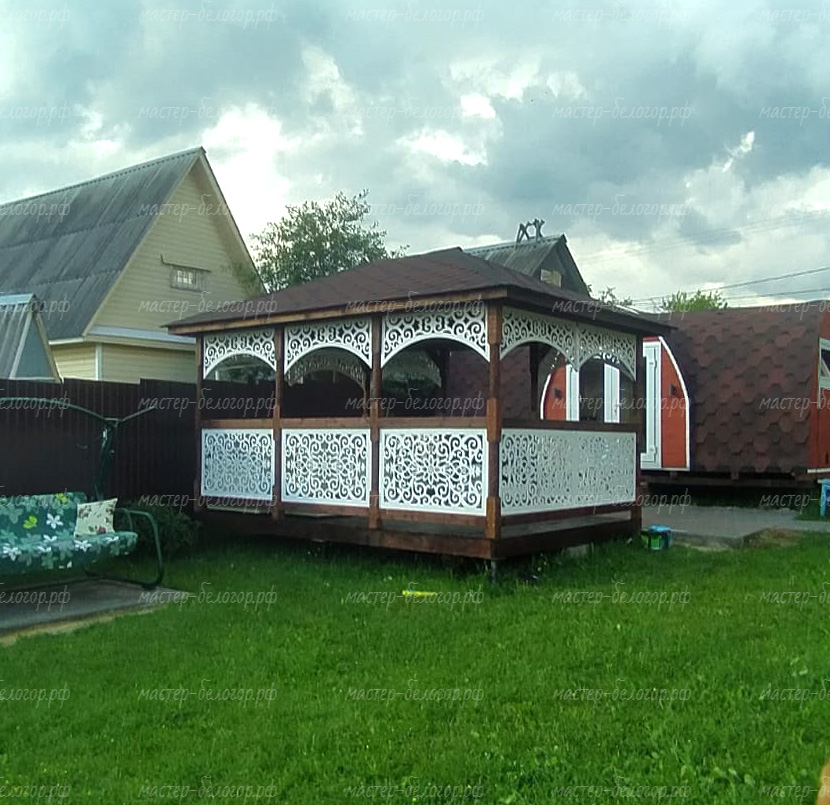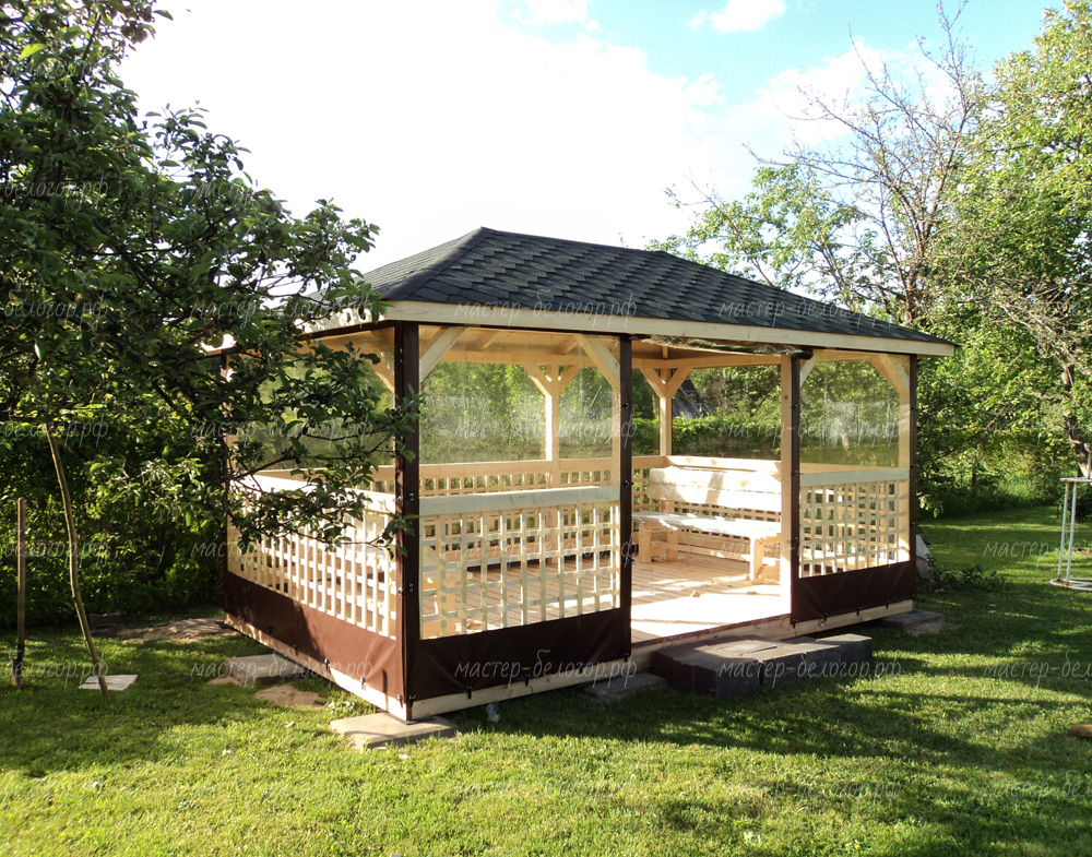 Крыша-ондулин,металлопрофиль или мягкая кровля(в зависимости от модели беседки).Цвет на выбор:красный,коричневый,зеленый.
