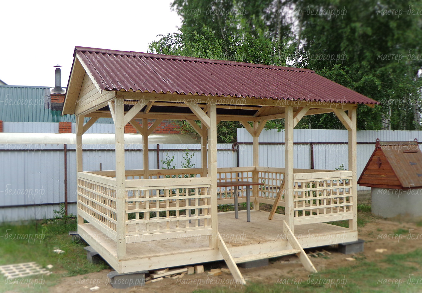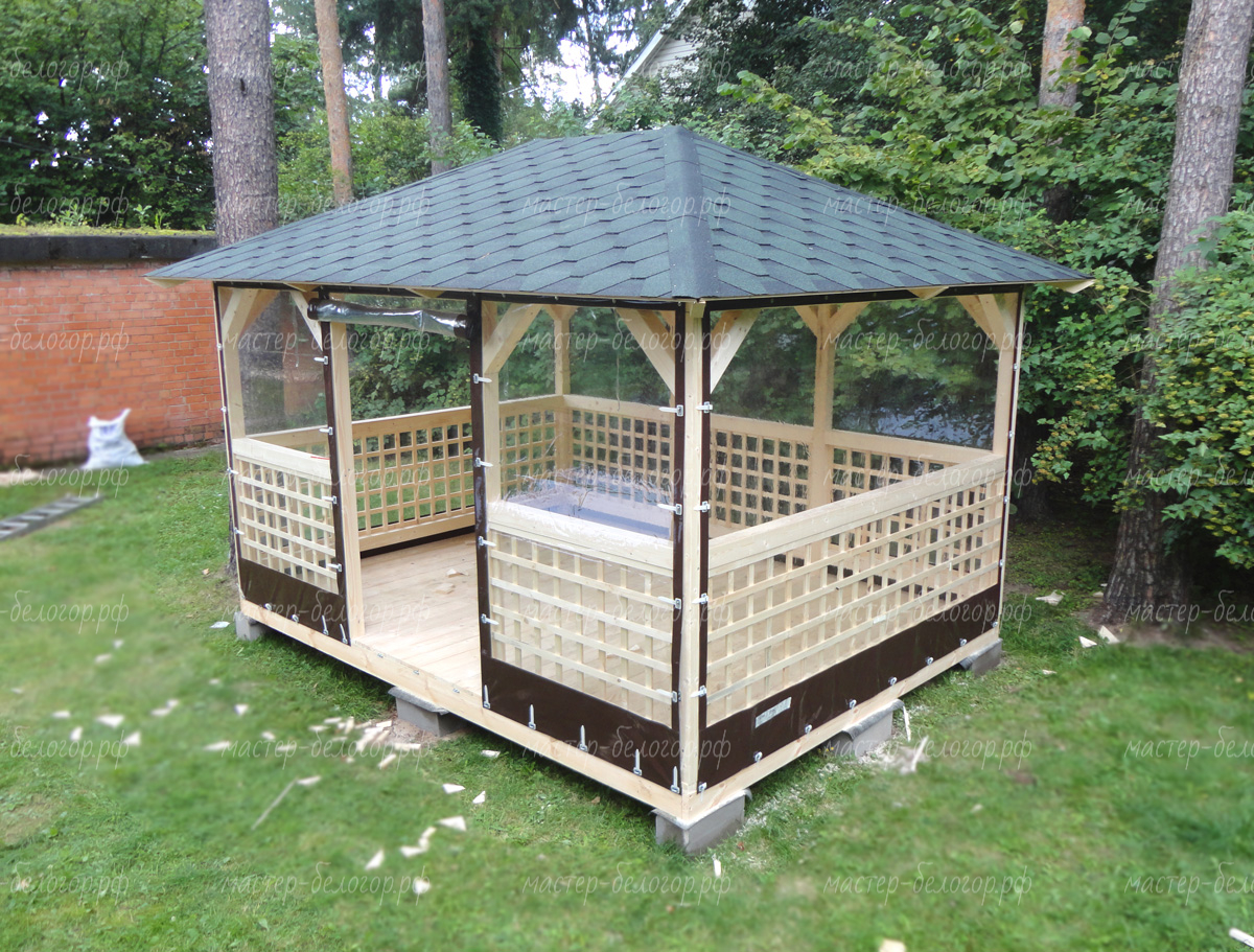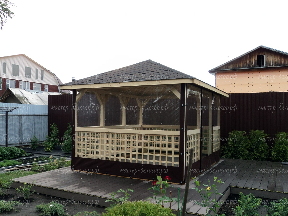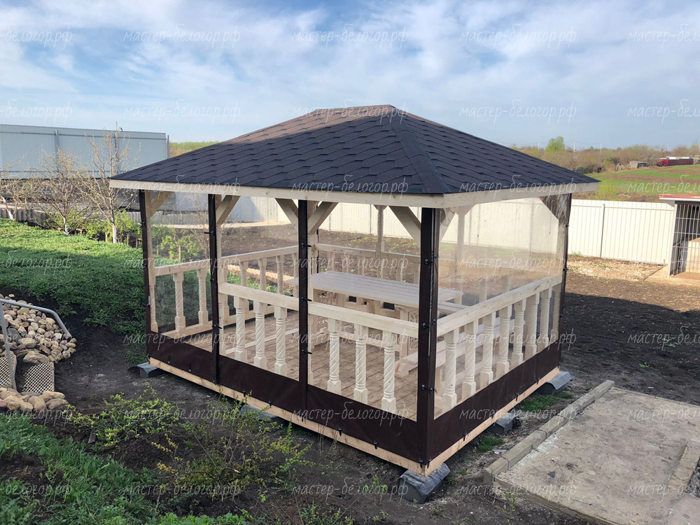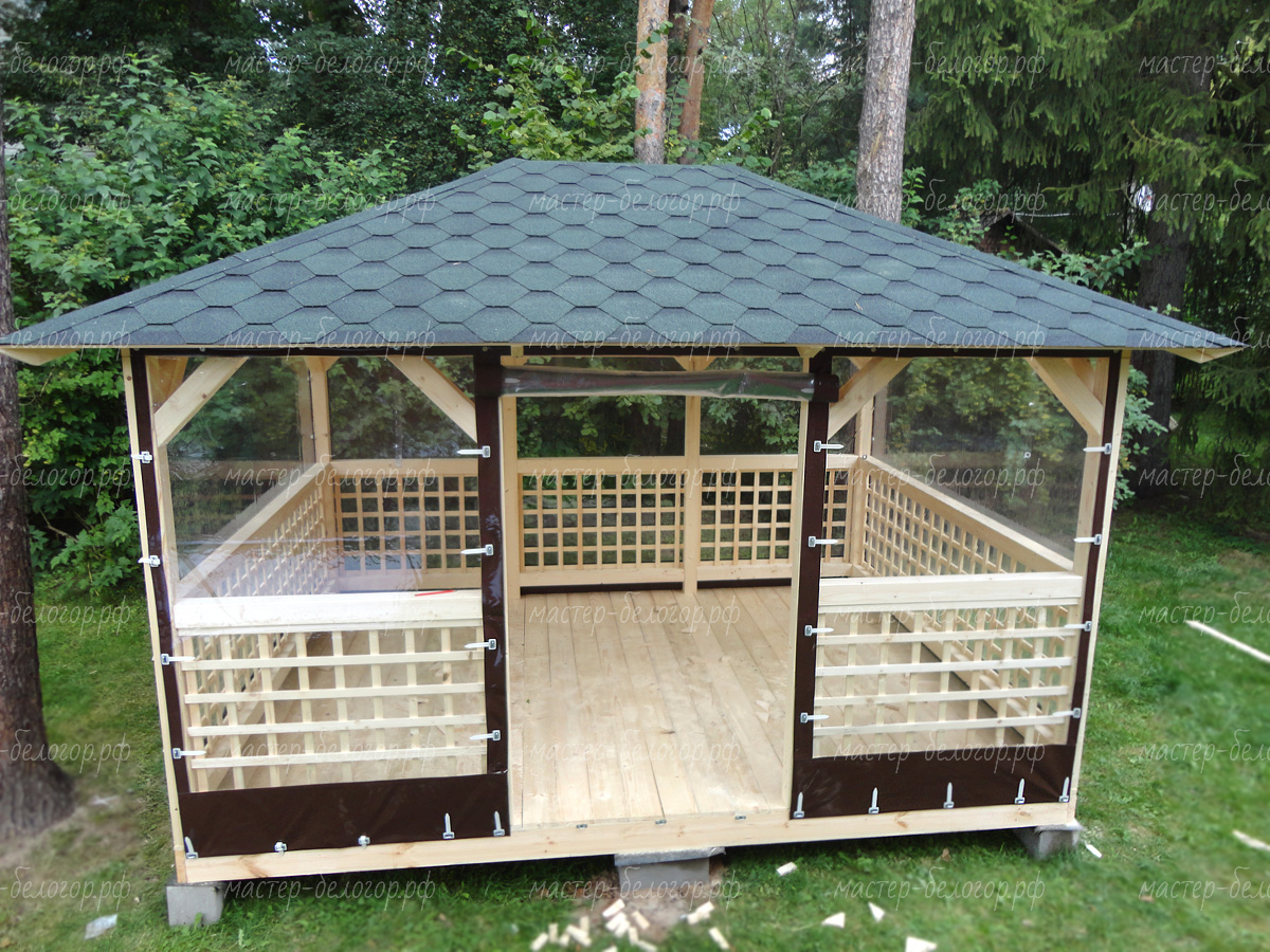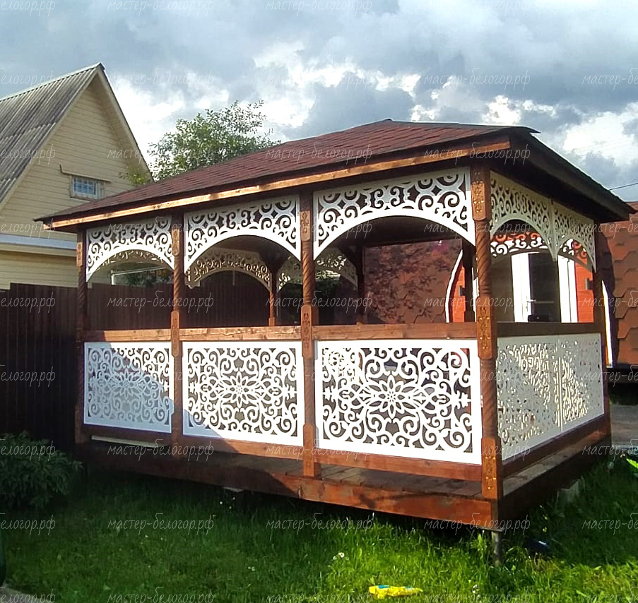 Крыша-ондулин,металлопрофиль или мягкая кровля(в зависимости от модели беседки).Цвет на выбор:красный,коричневый,зеленый.