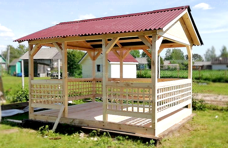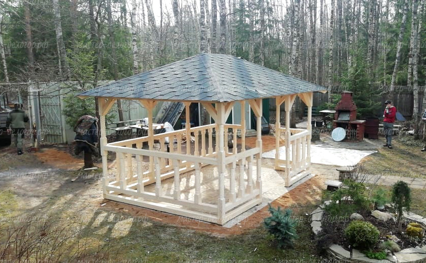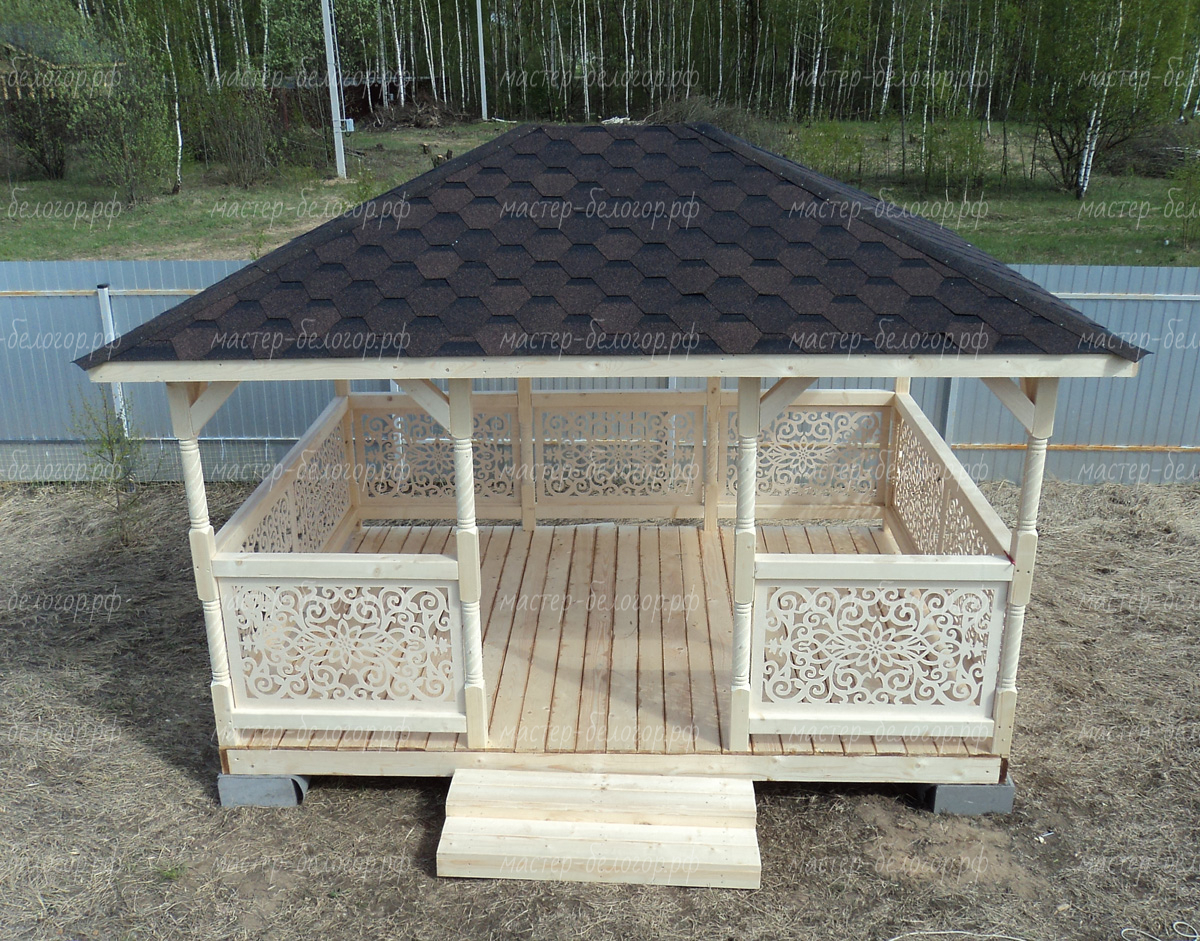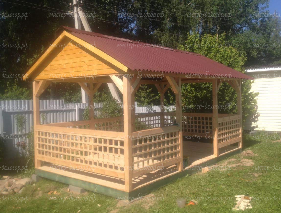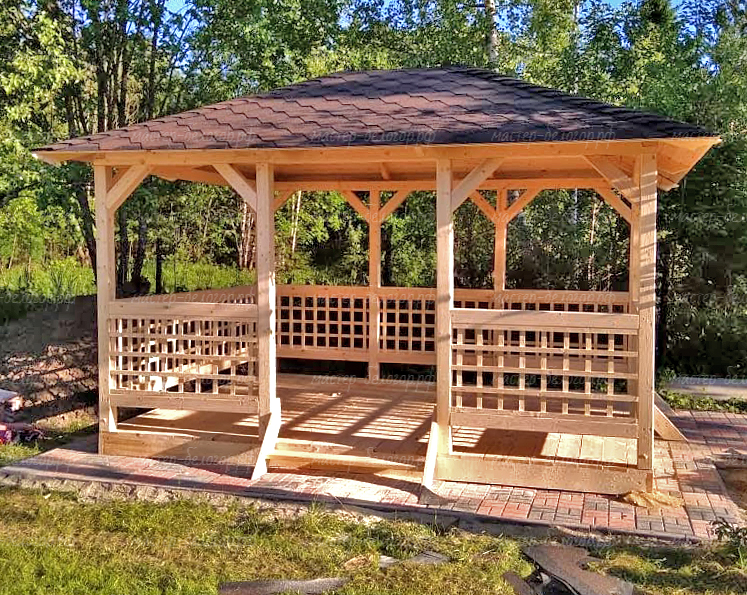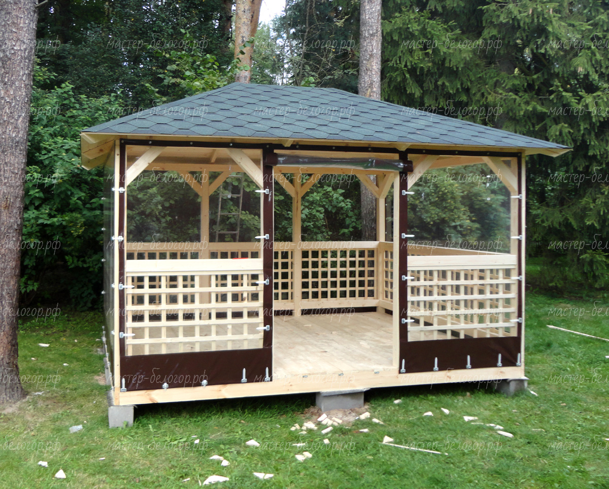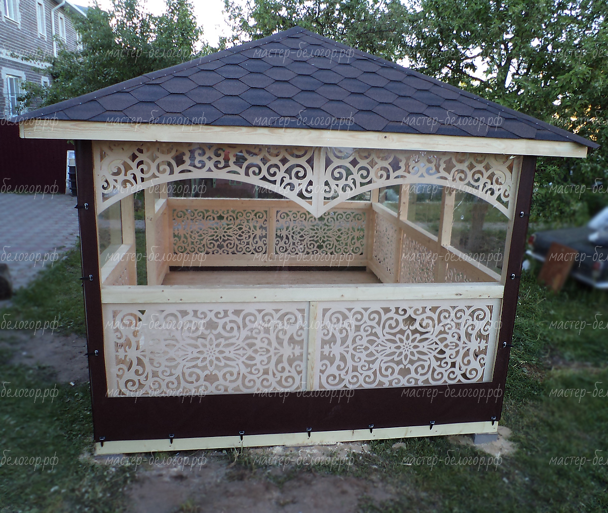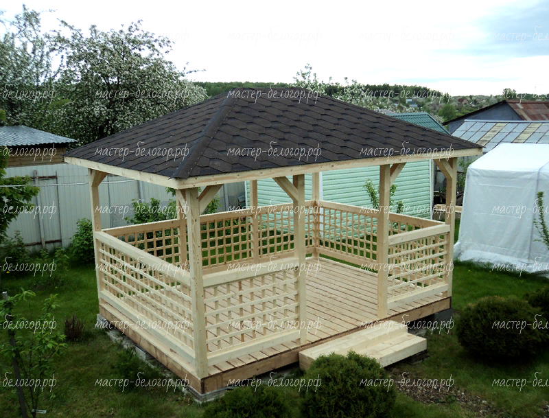 Крыша-ондулин,металлопрофиль или мягкая кровля(в зависимости от модели беседки).Цвет на выбор:красный,коричневый,зеленый.