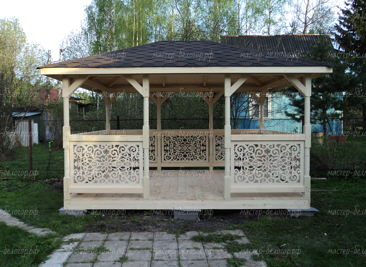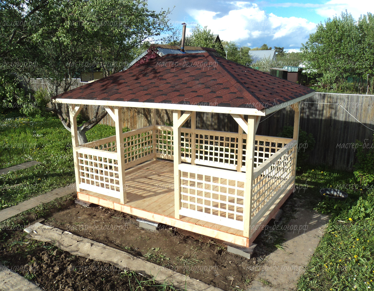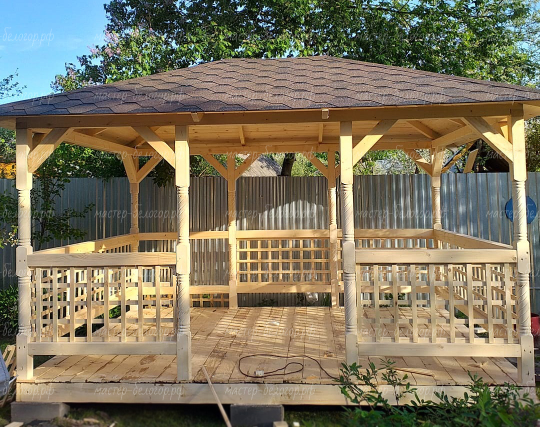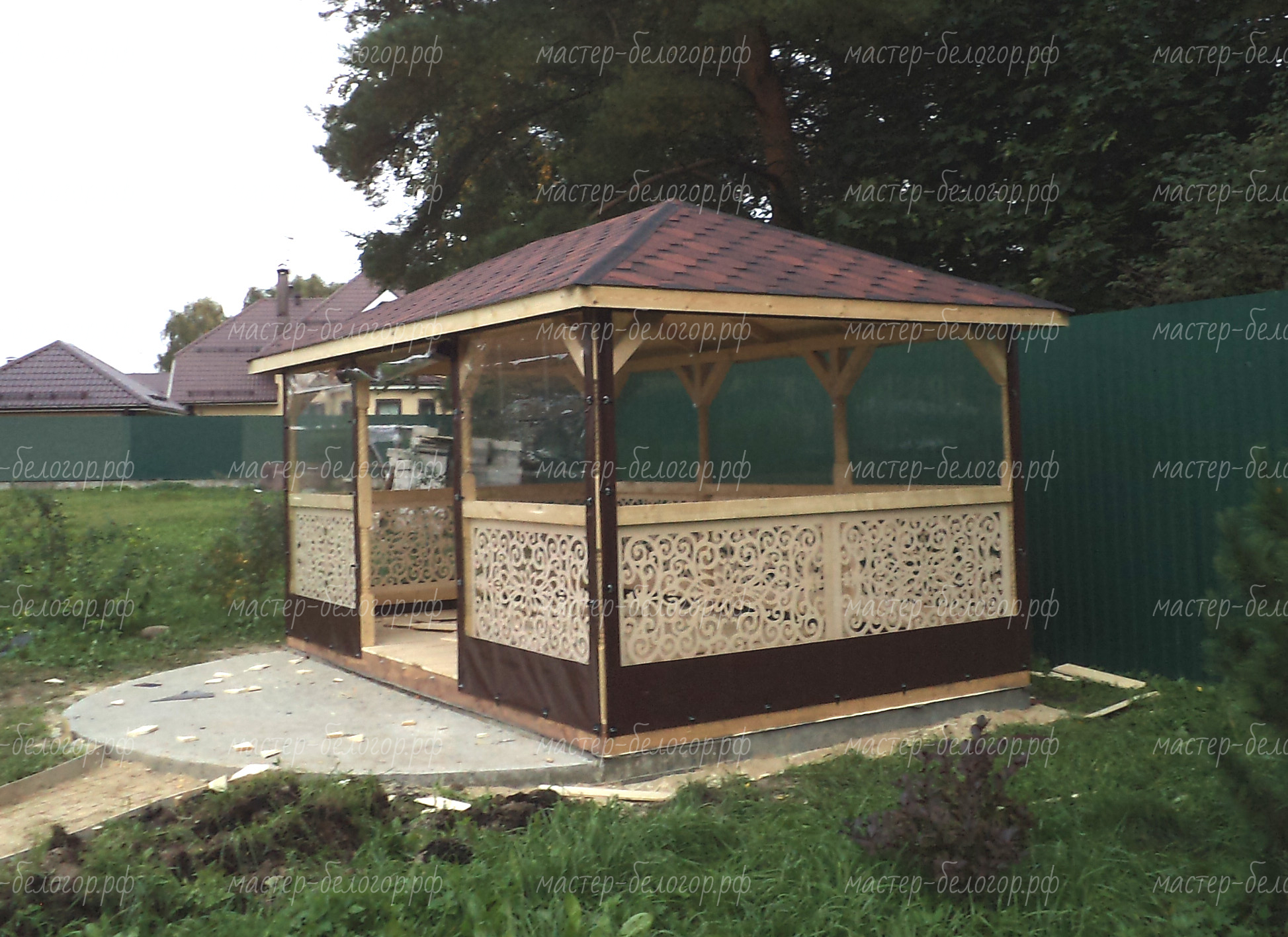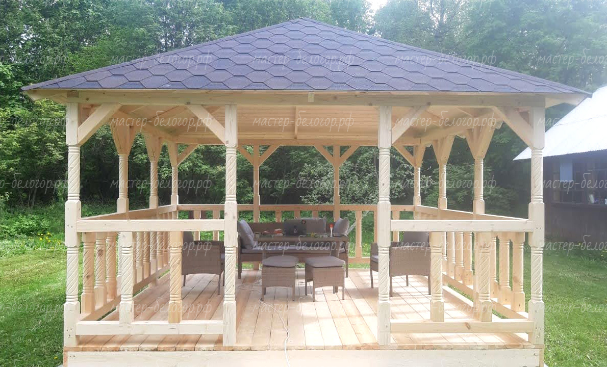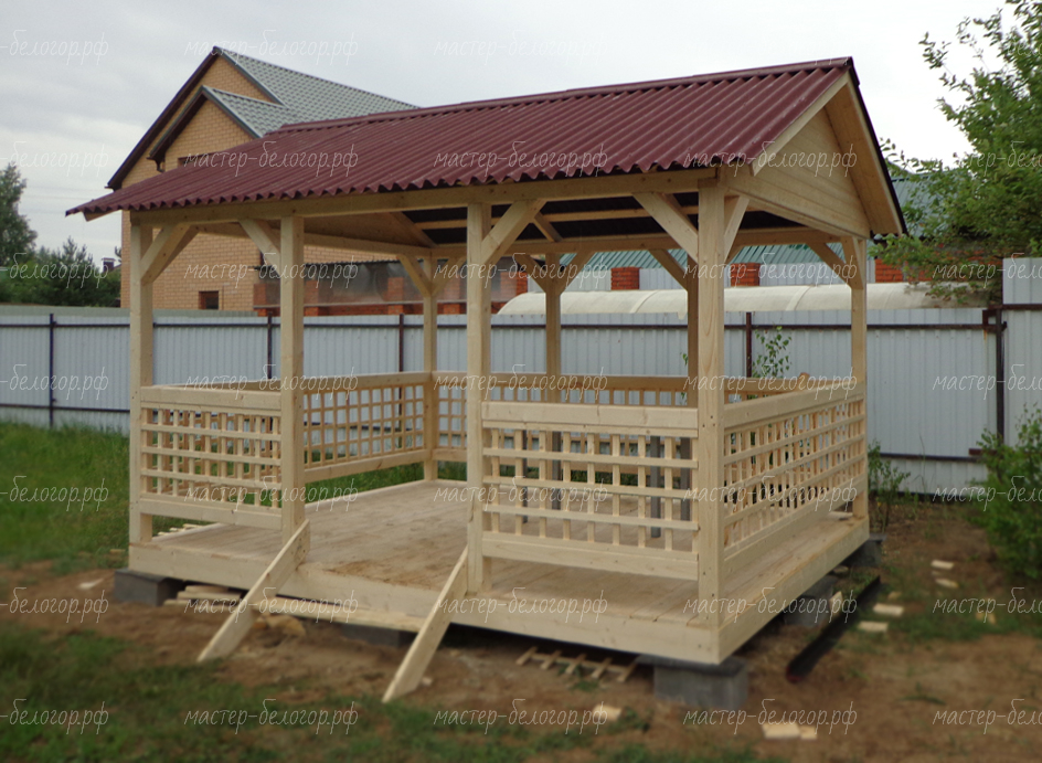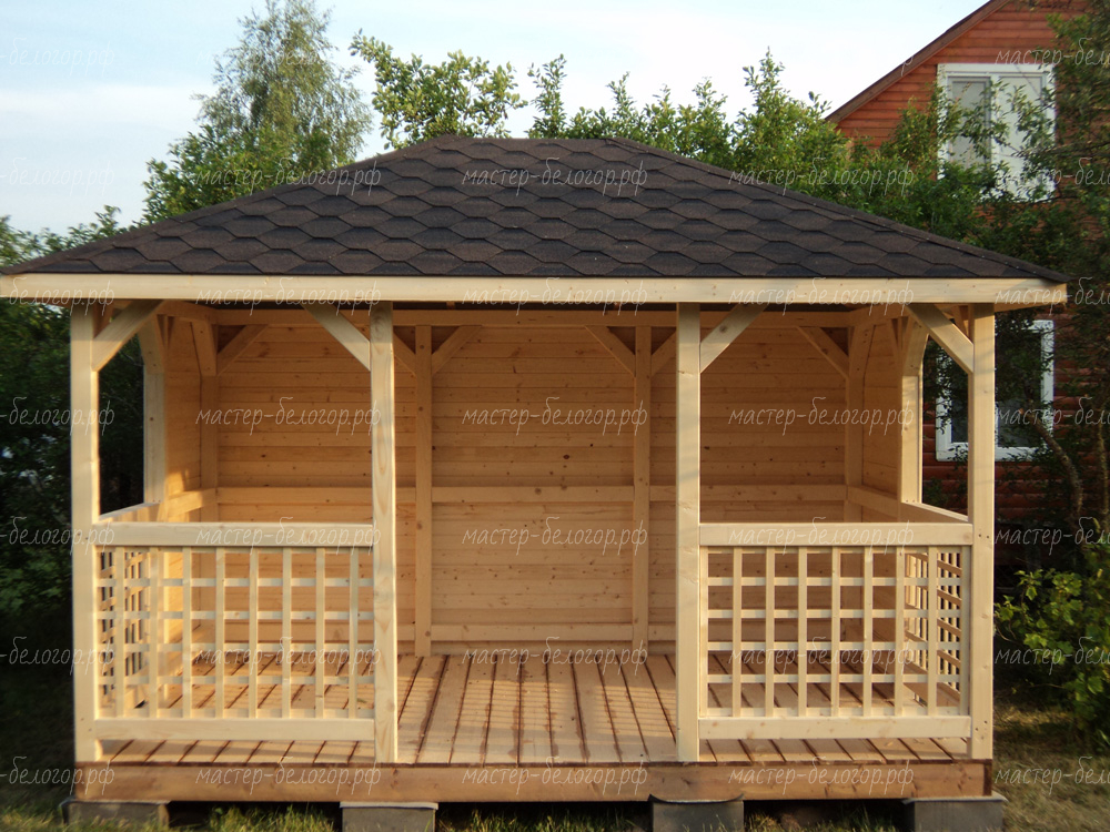 Крыша-ондулин,металлопрофиль или мягкая кровля(в зависимости от модели беседки).Цвет на выбор:красный,коричневый,зеленый.