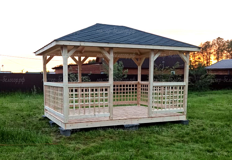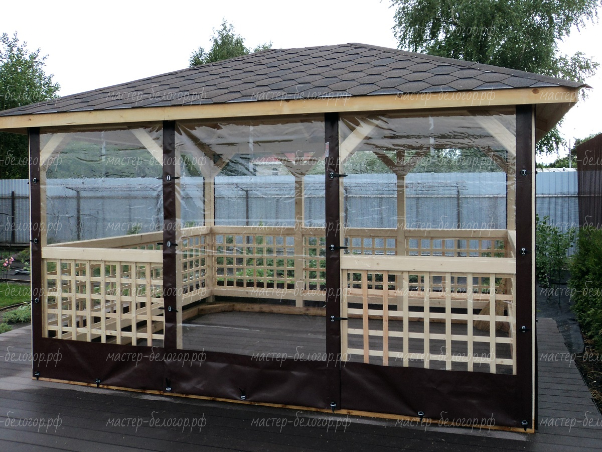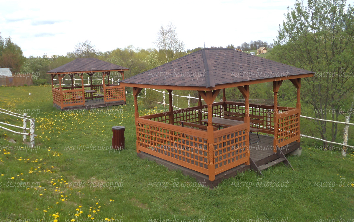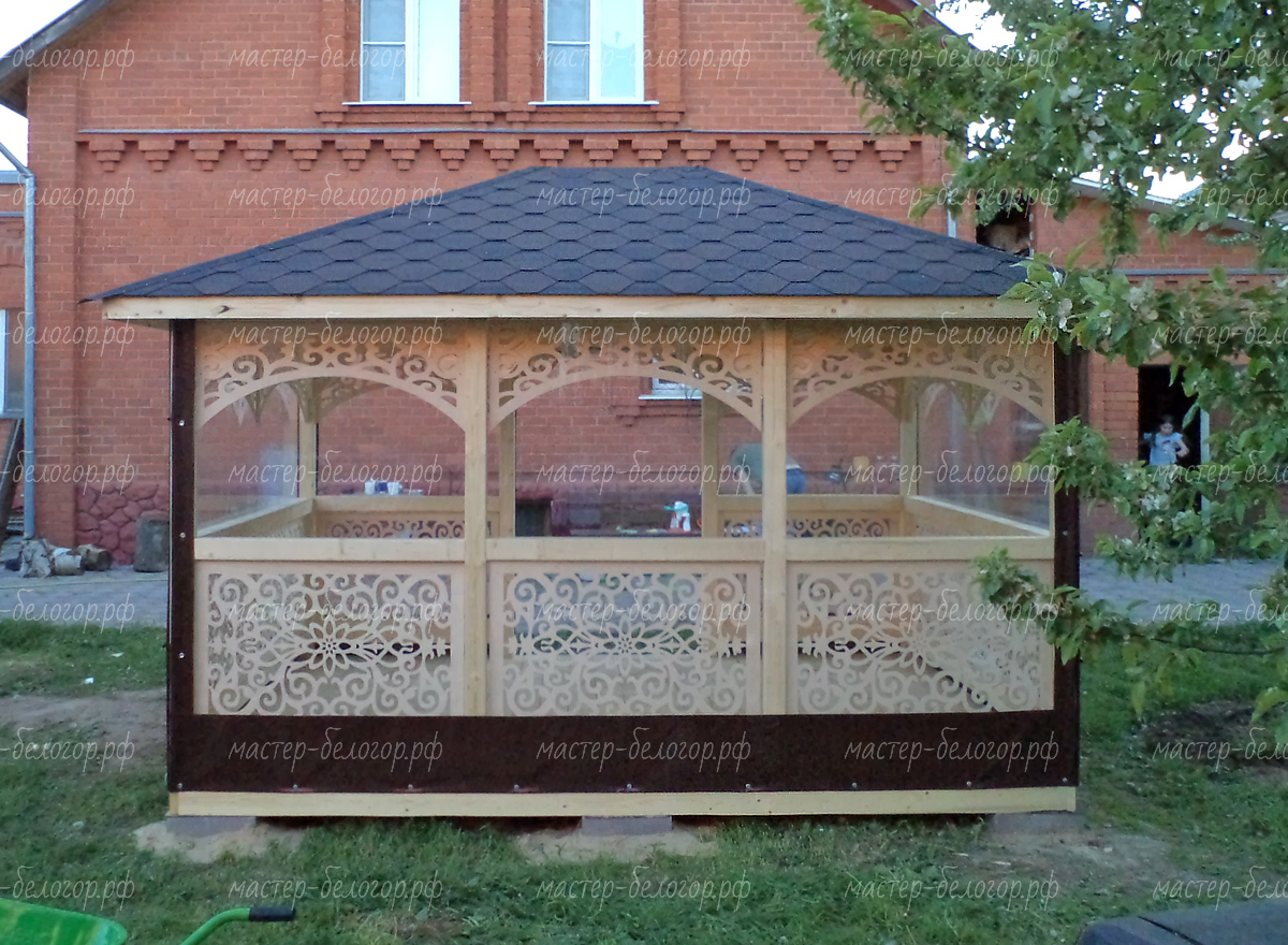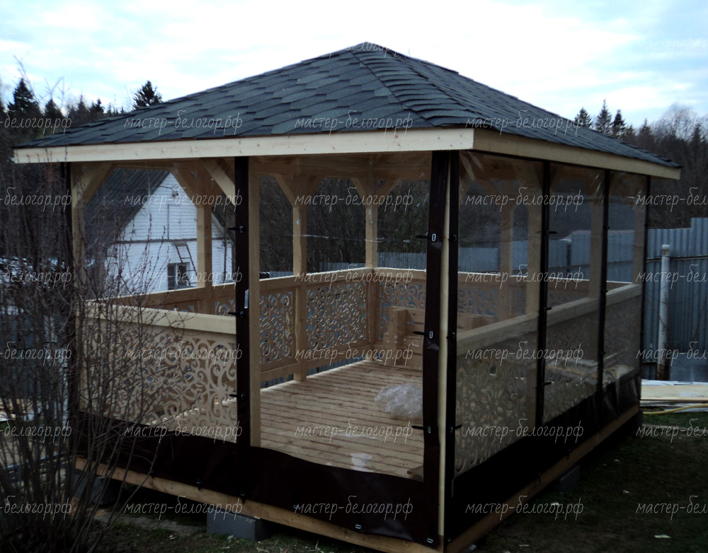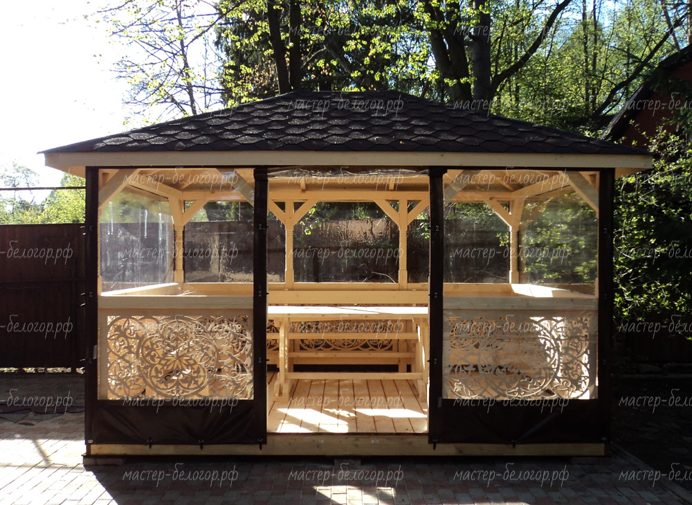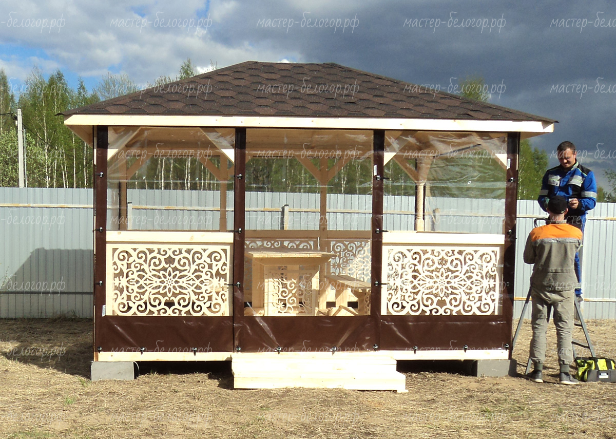 Крыша-ондулин,металлопрофиль или мягкая кровля(в зависимости от модели беседки).Цвет на выбор:красный,коричневый,зеленый.