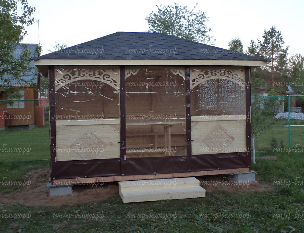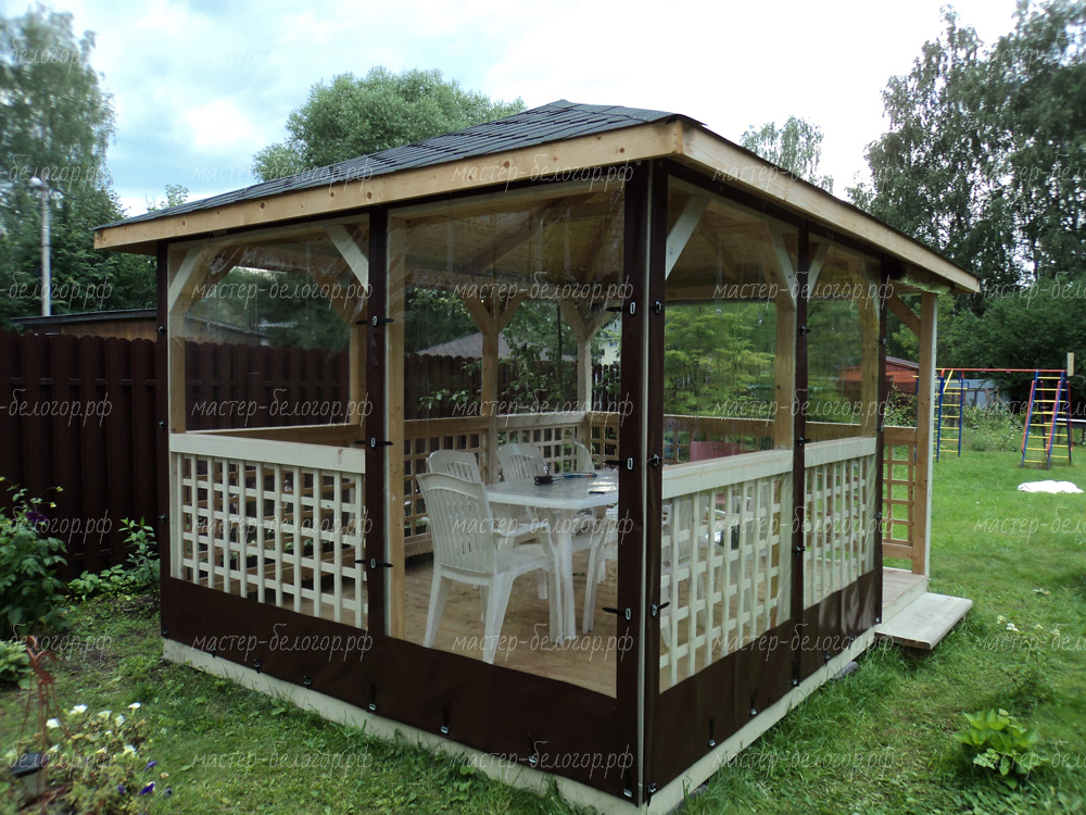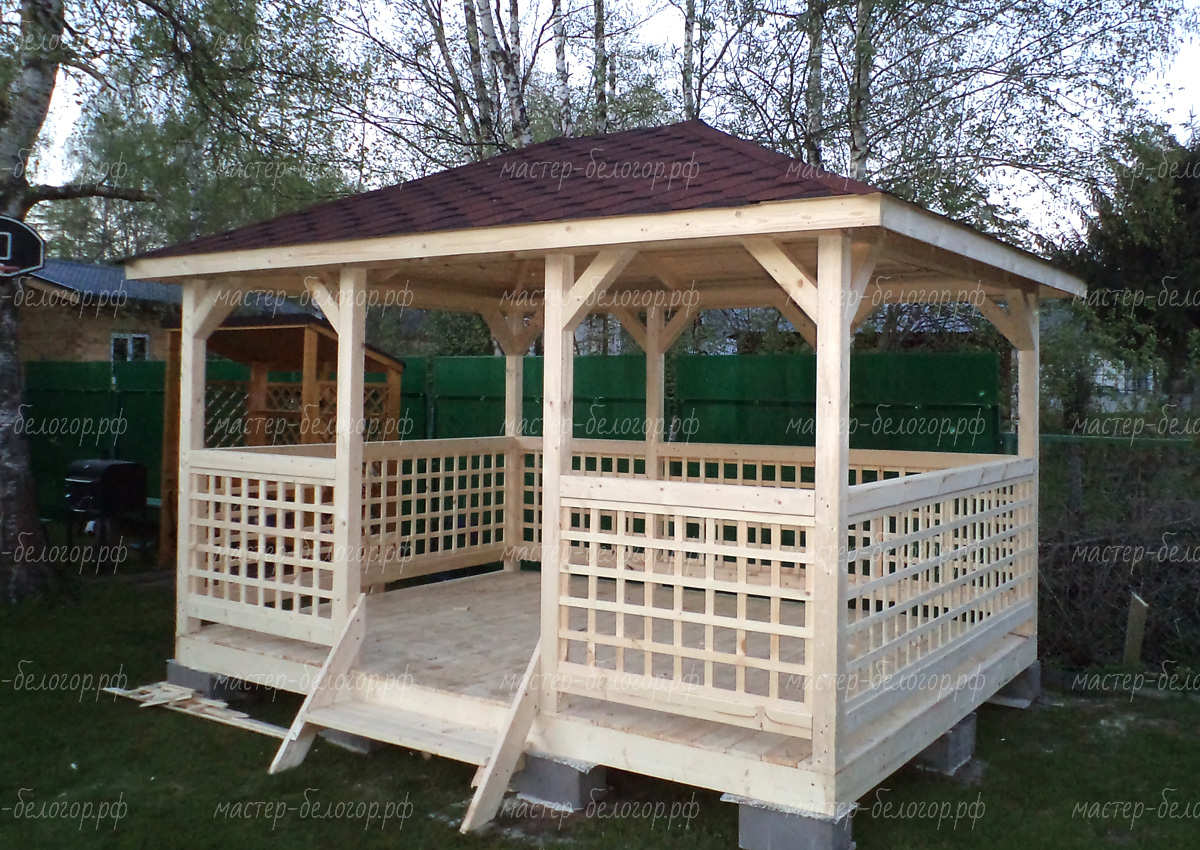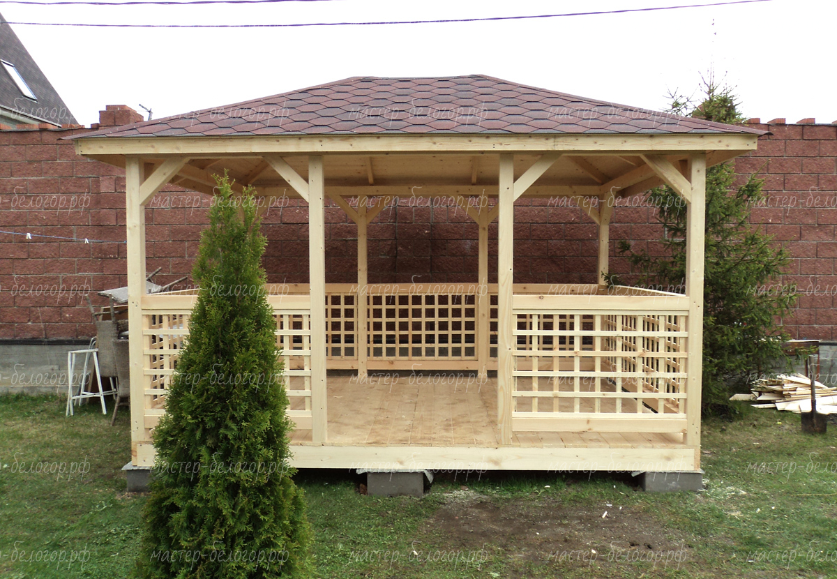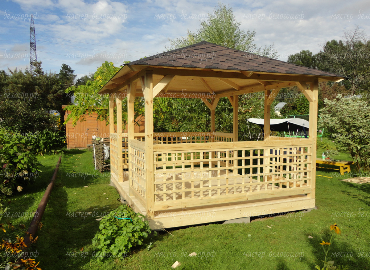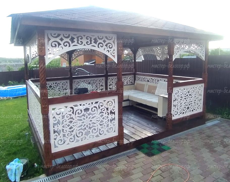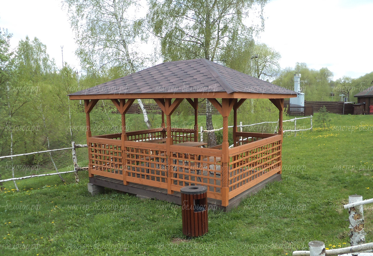 Крыша-ондулин,металлопрофиль или мягкая кровля(в зависимости от модели беседки).Цвет на выбор:красный,коричневый,зеленый.