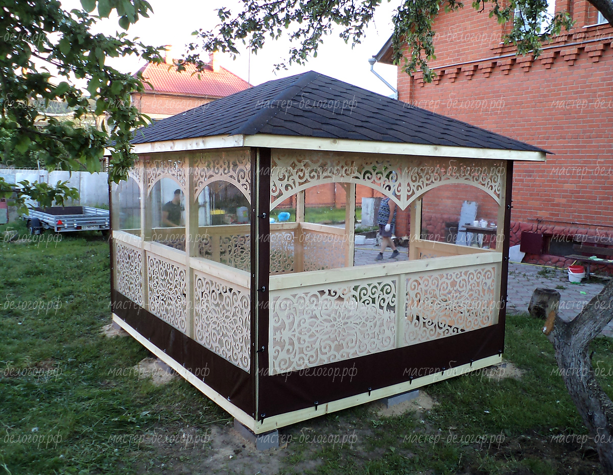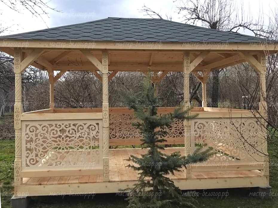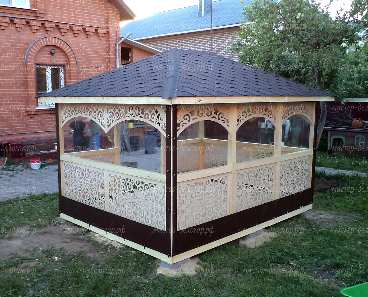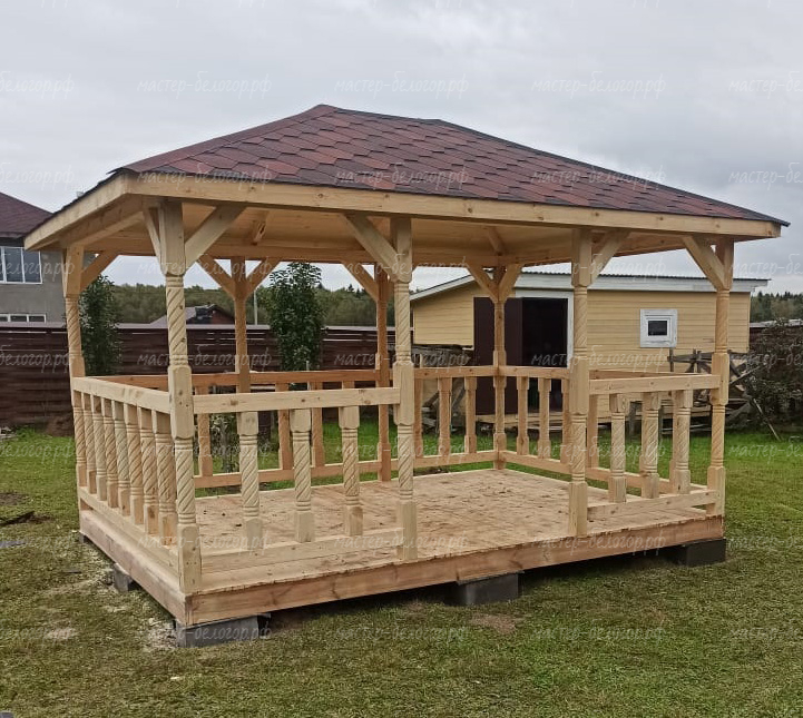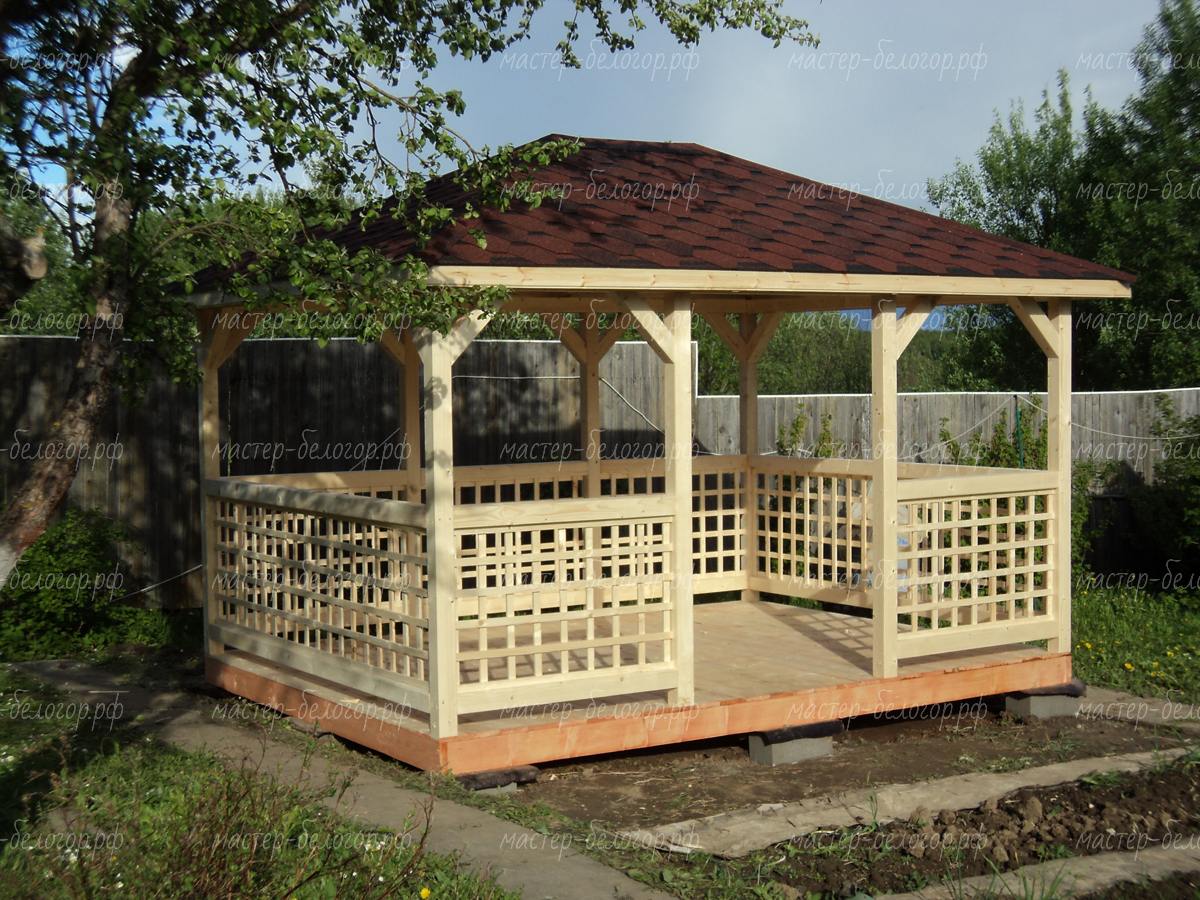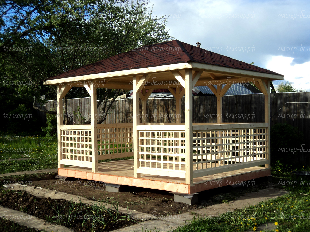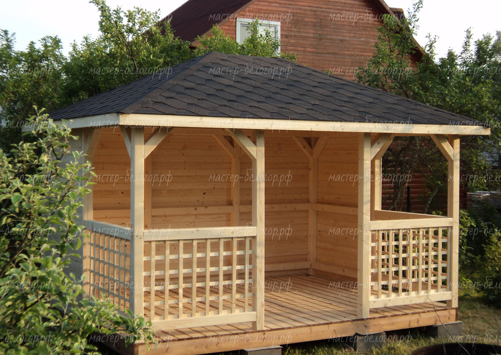 Крыша-ондулин,металлопрофиль или мягкая кровля(в зависимости от модели беседки).Цвет на выбор:красный,коричневый,зеленый.