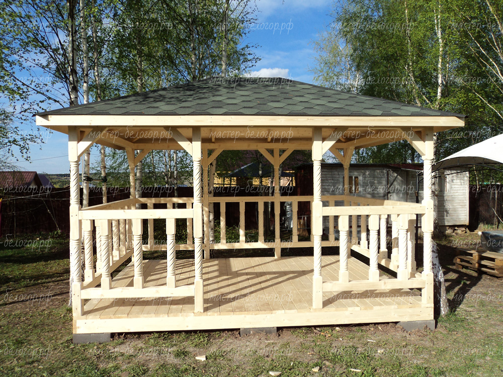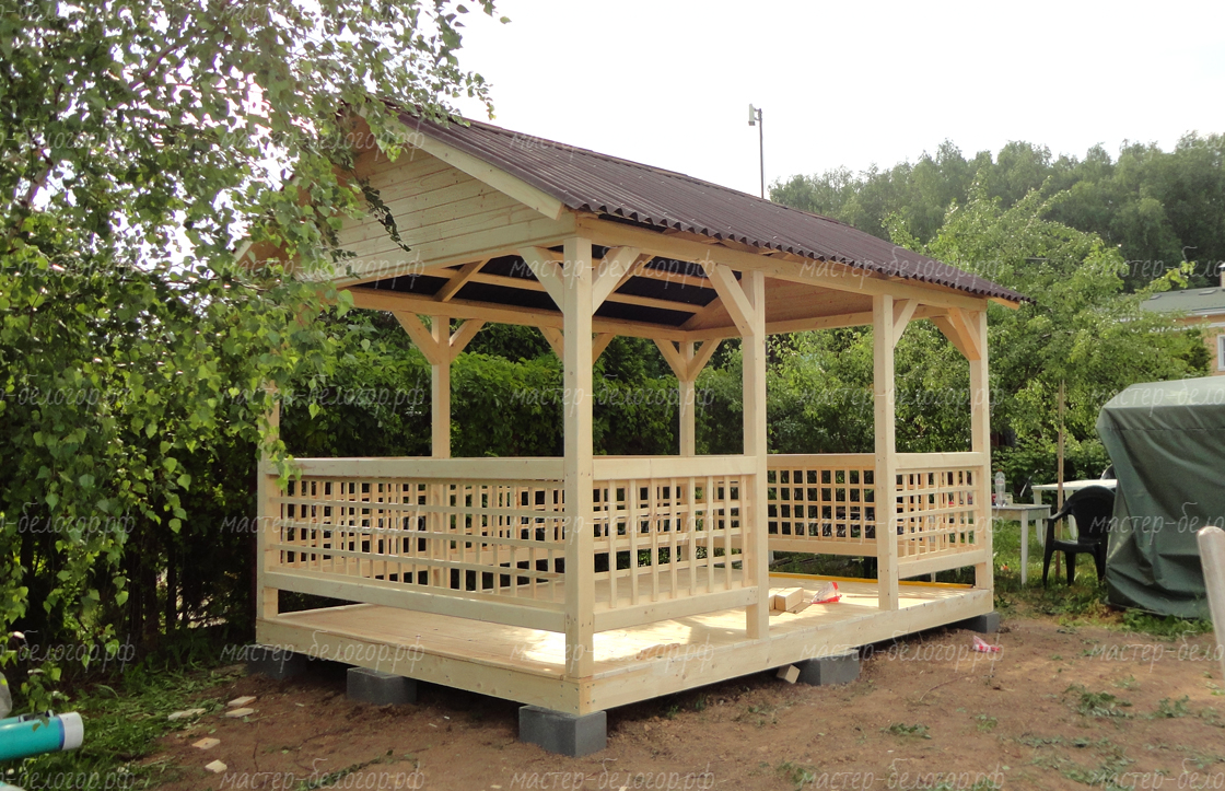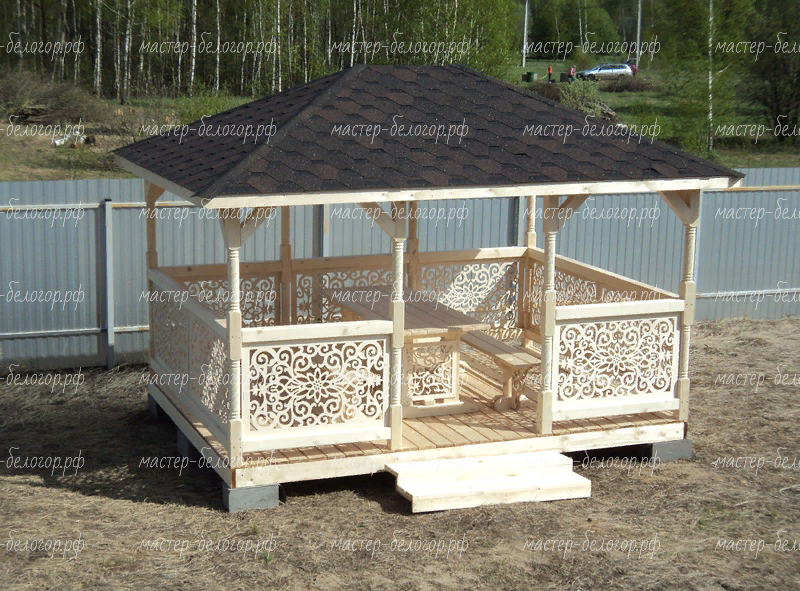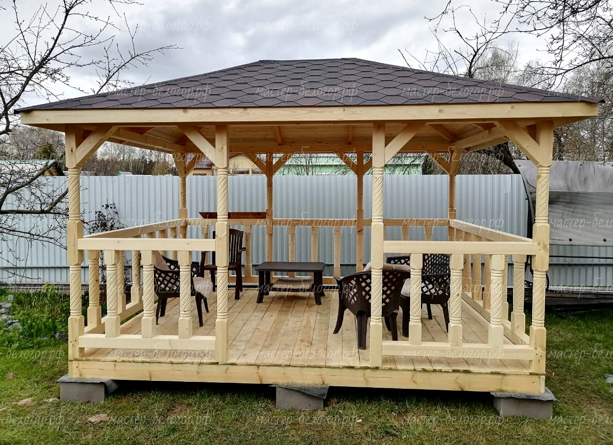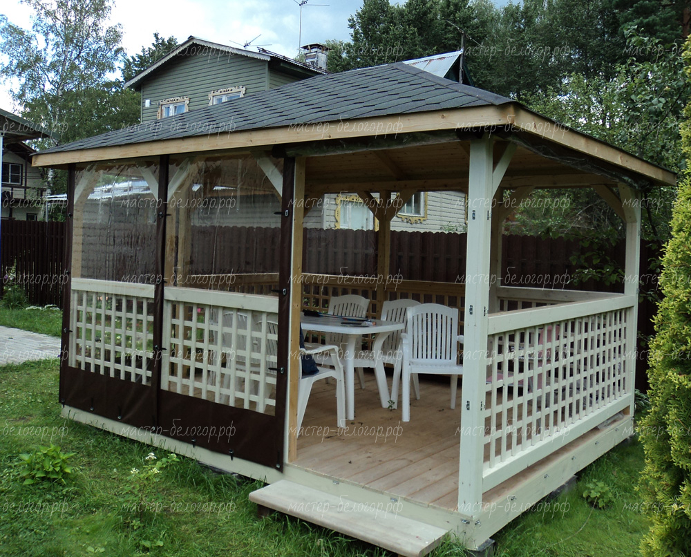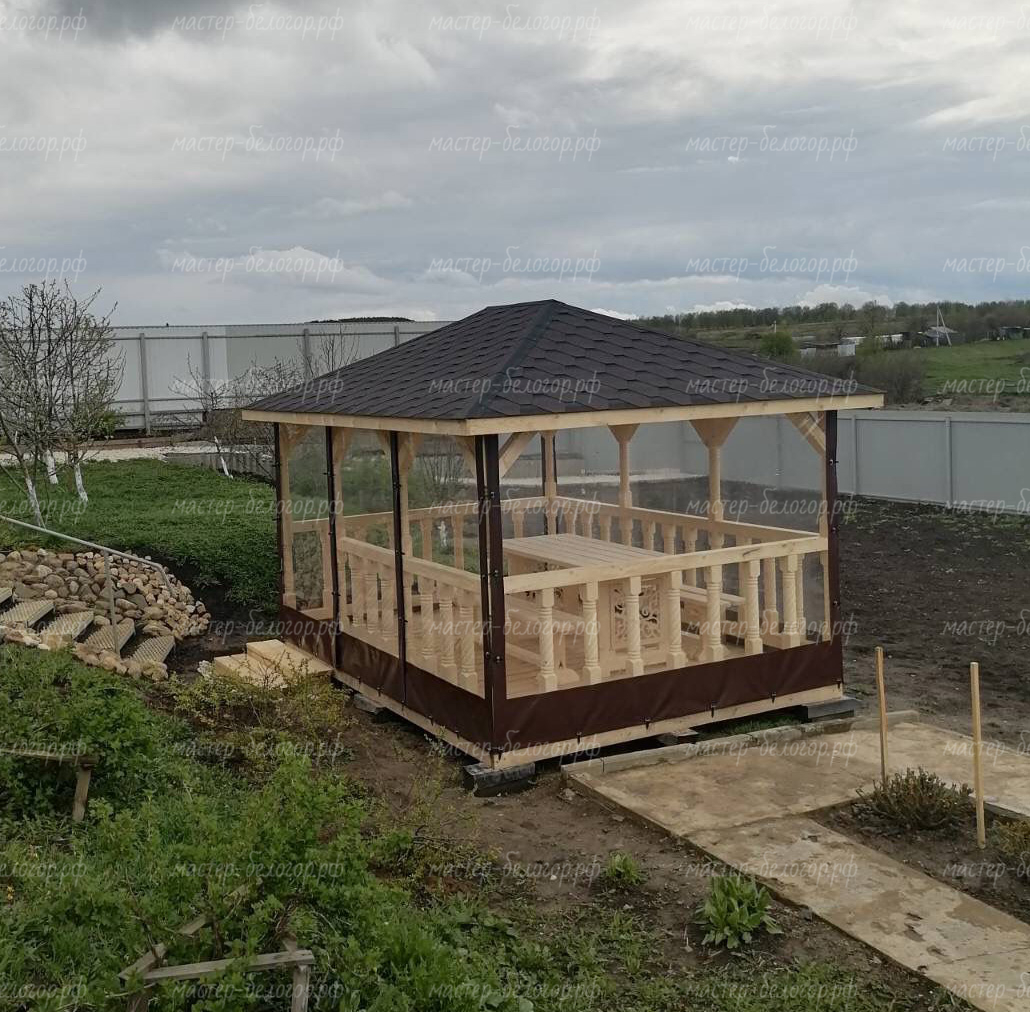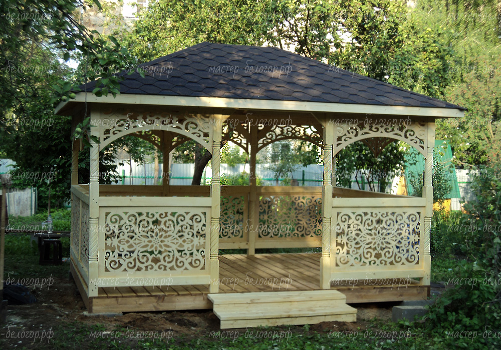 Крыша-ондулин,металлопрофиль или мягкая кровля(в зависимости от модели беседки).Цвет на выбор:красный,коричневый,зеленый.