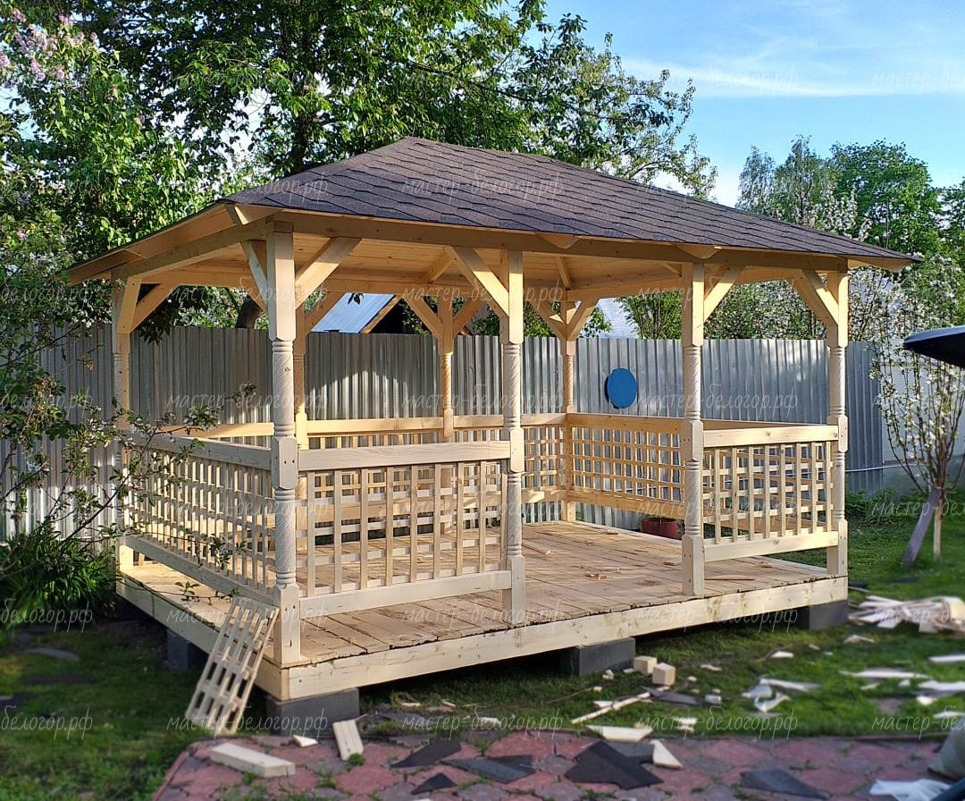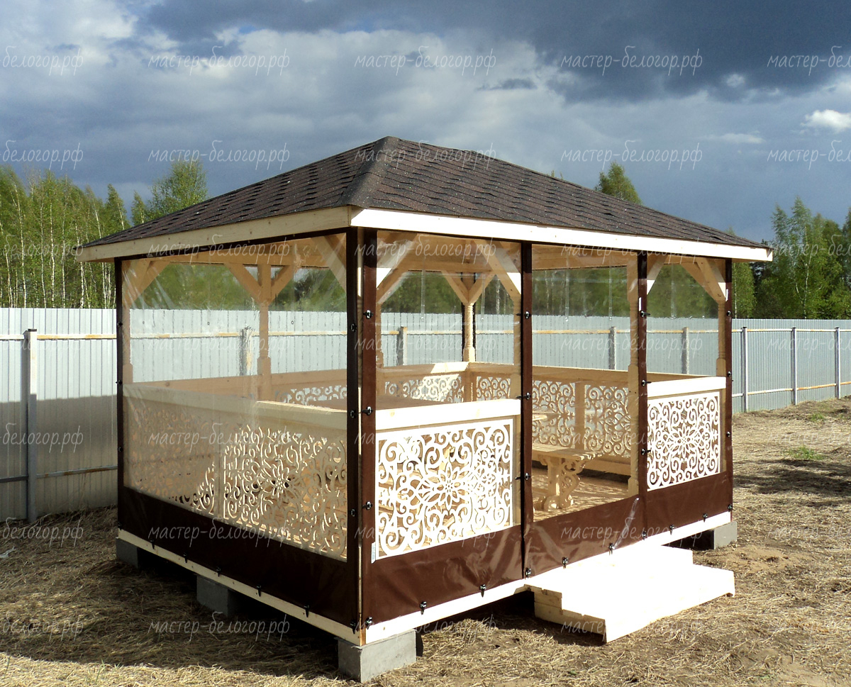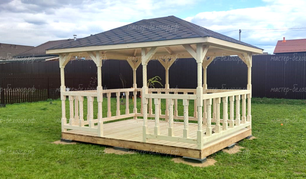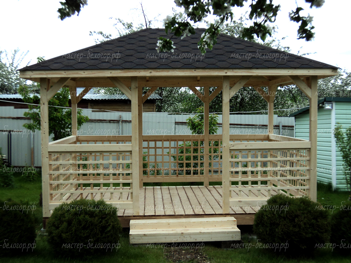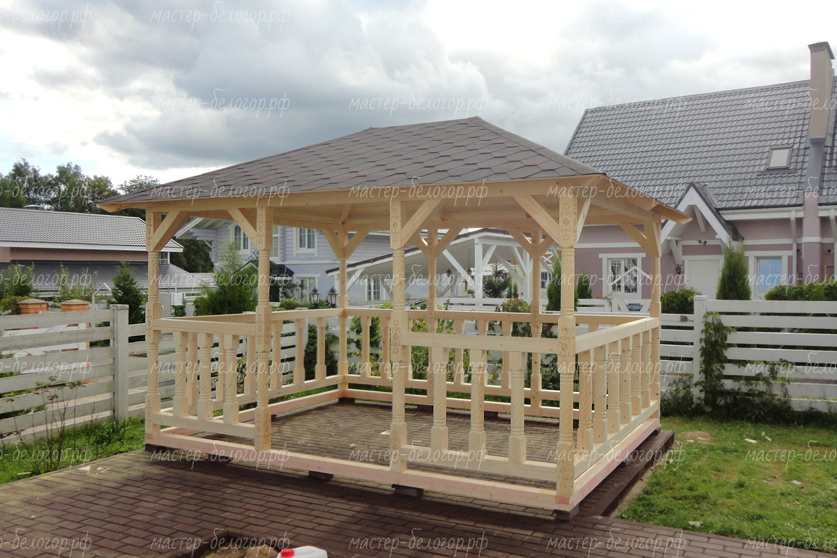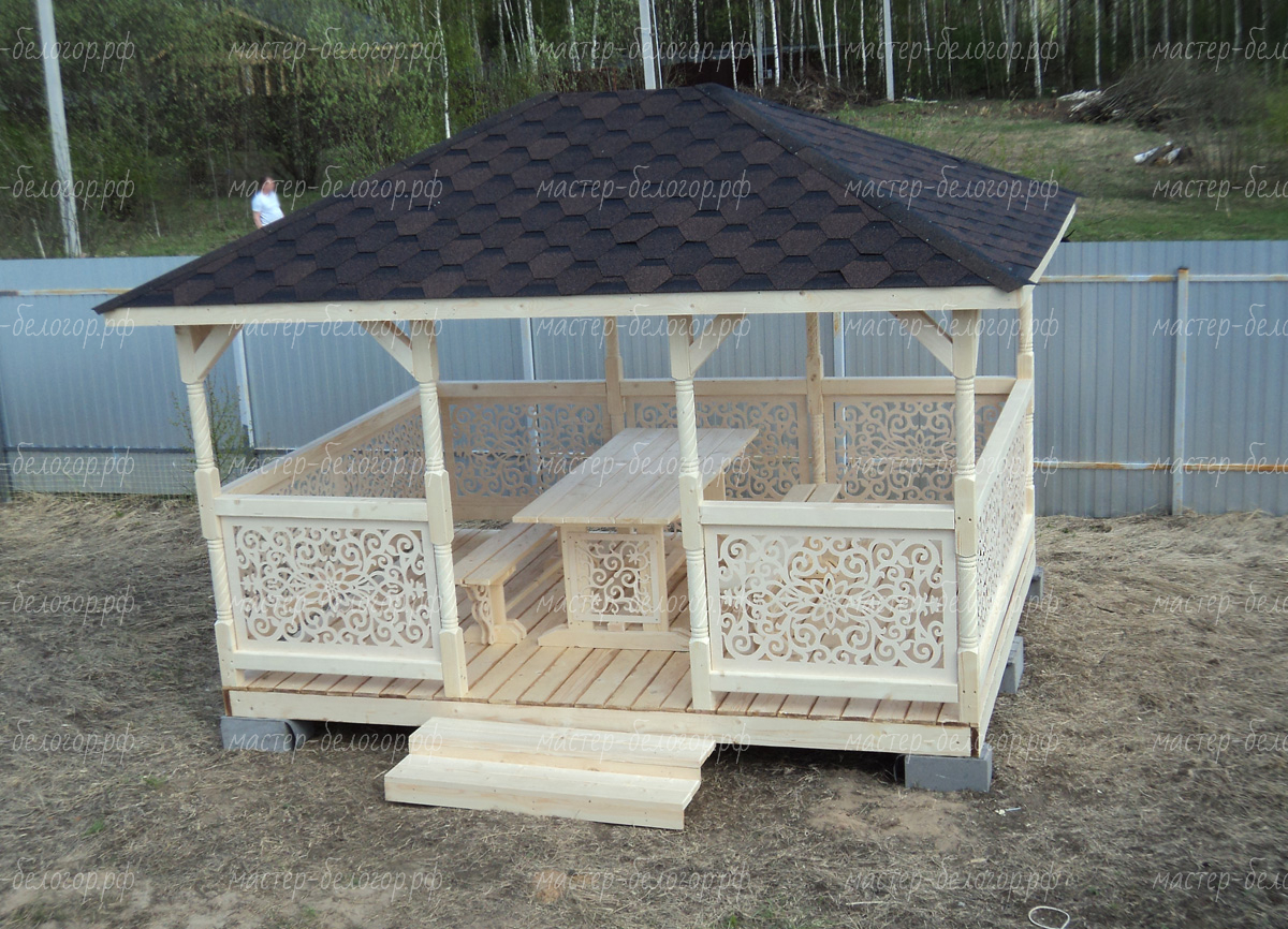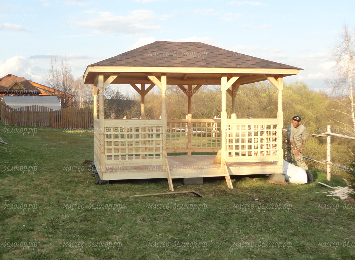 Крыша-ондулин,металлопрофиль или мягкая кровля(в зависимости от модели беседки).Цвет на выбор:красный,коричневый,зеленый.