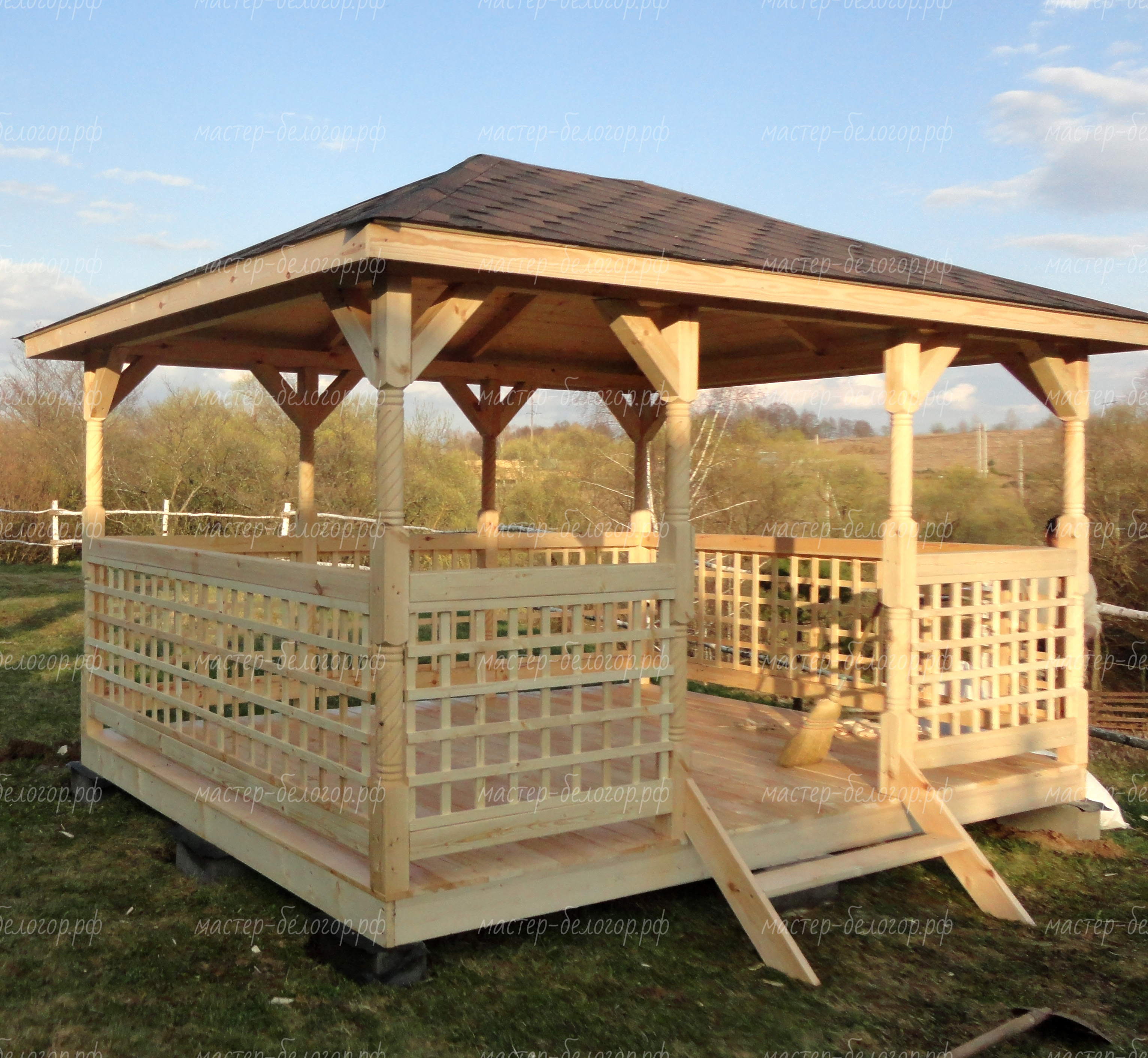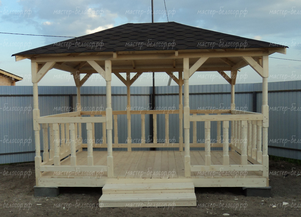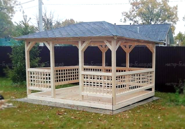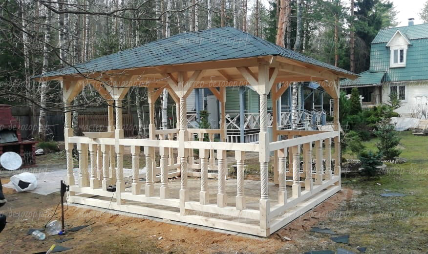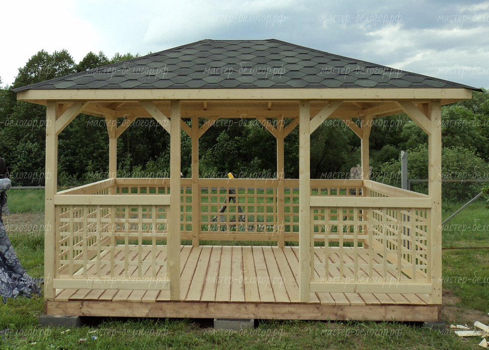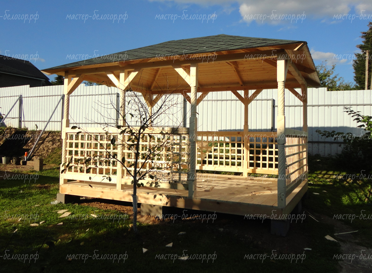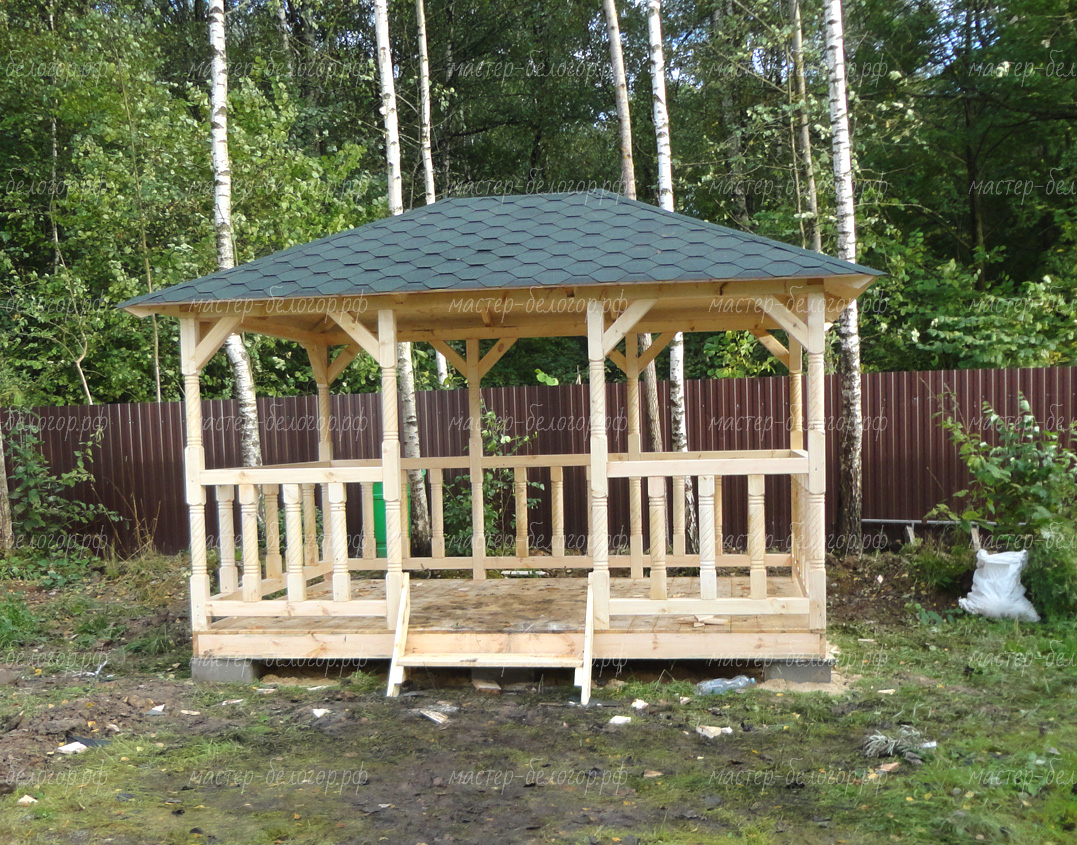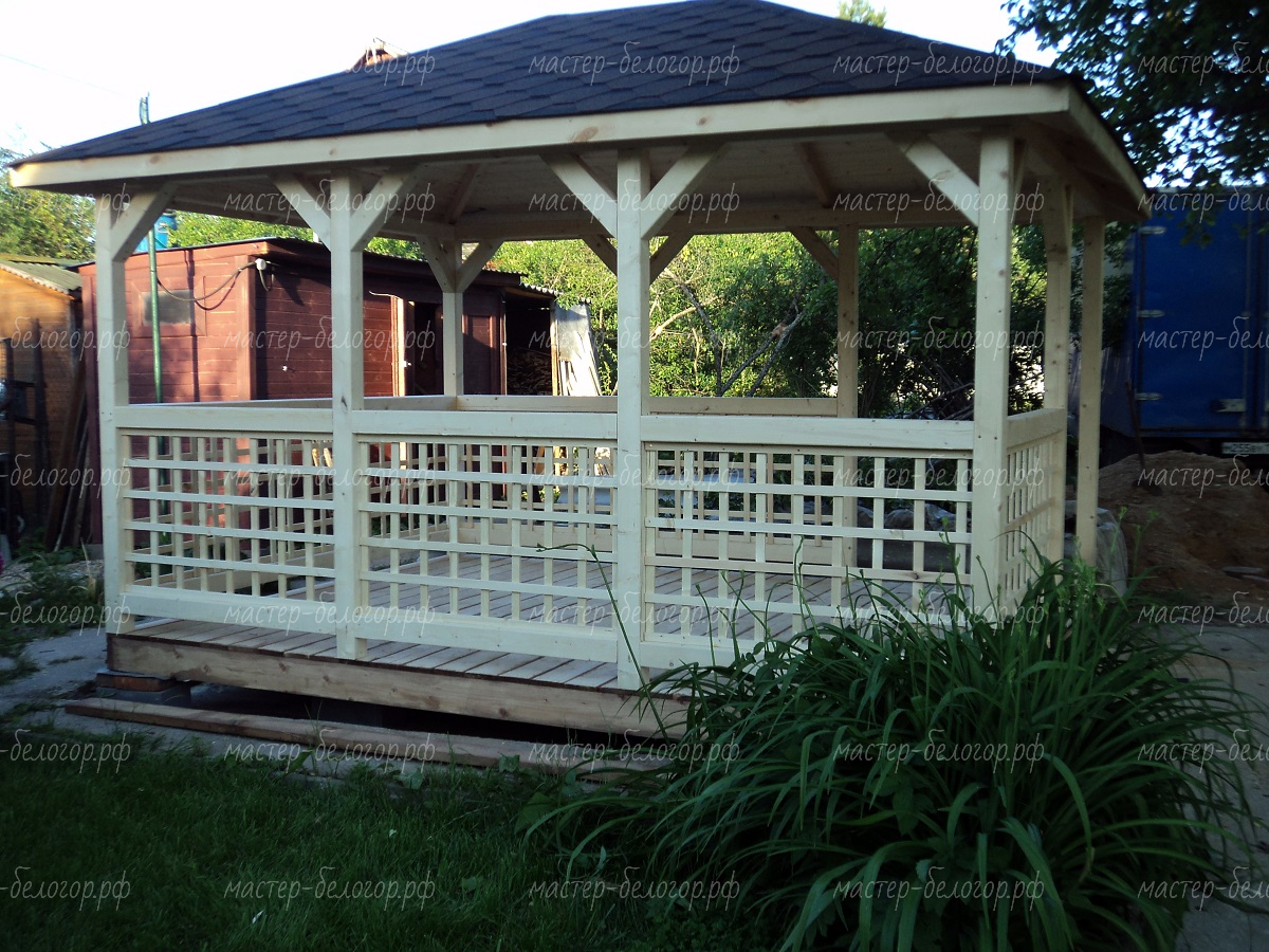 Крыша-ондулин,металлопрофиль или мягкая кровля(в зависимости от модели беседки).Цвет на выбор:красный,коричневый,зеленый.