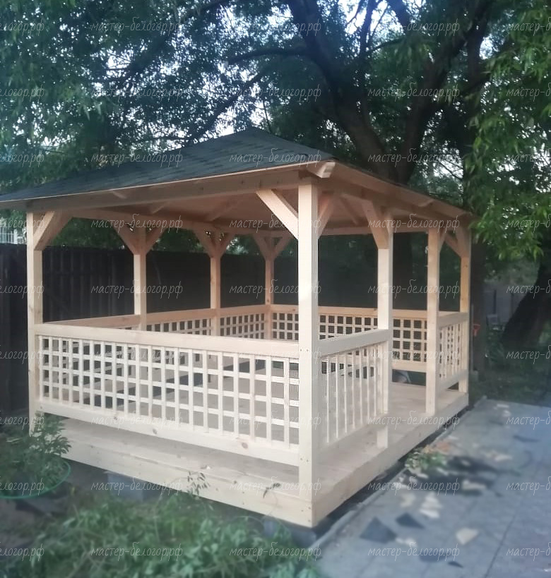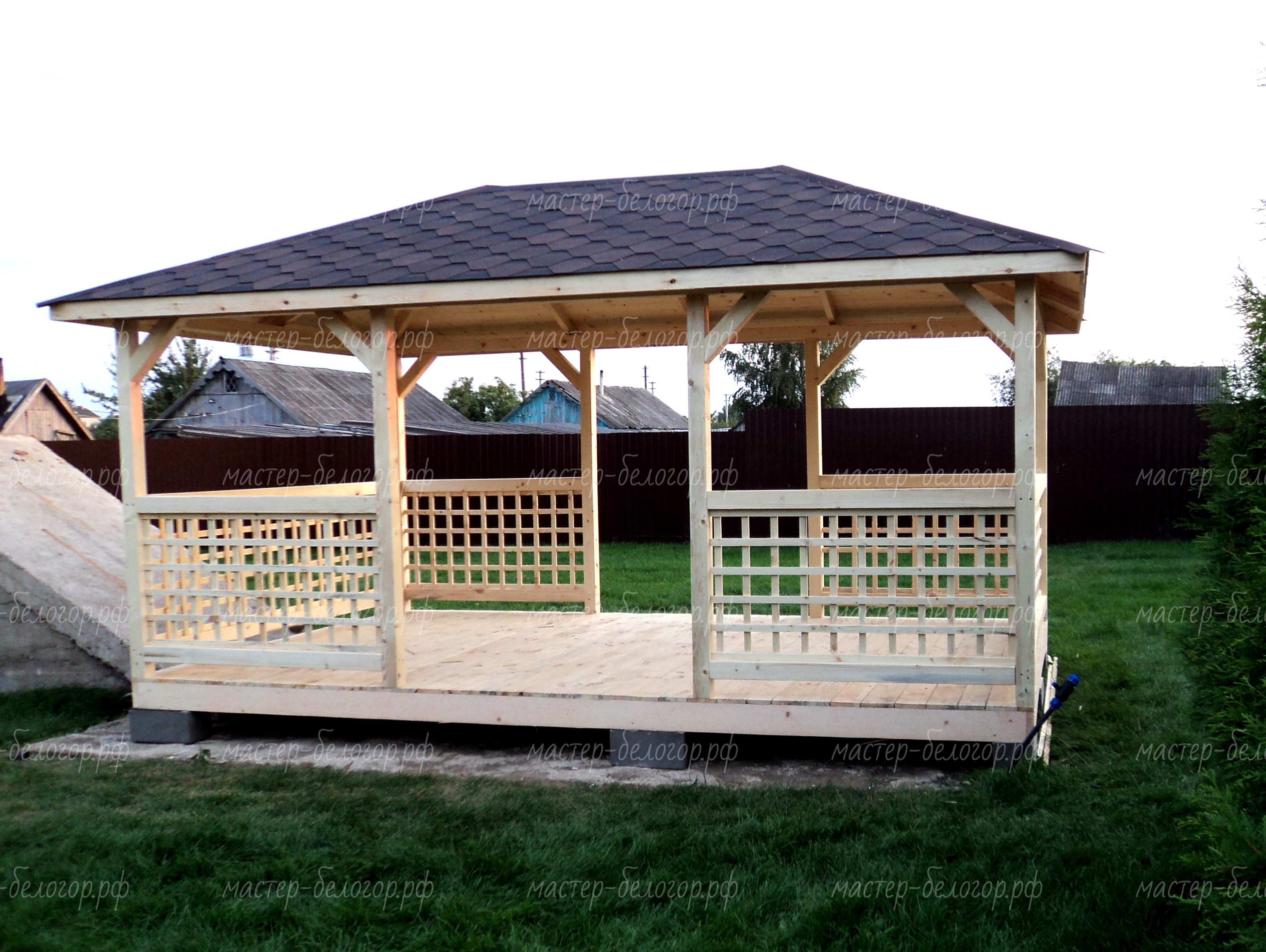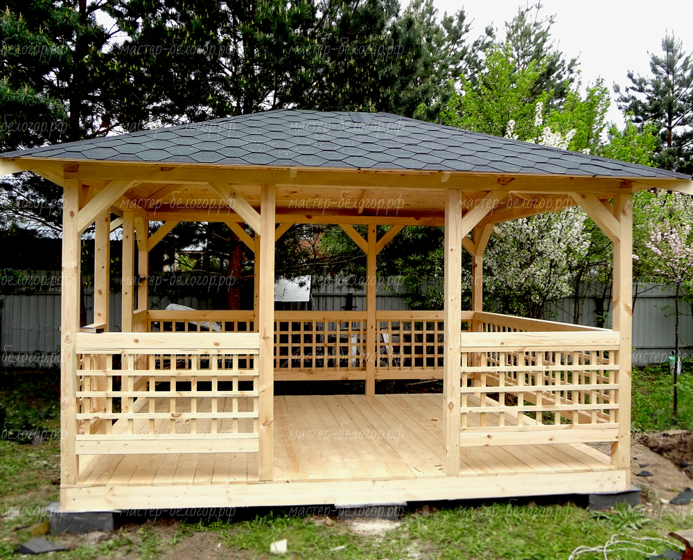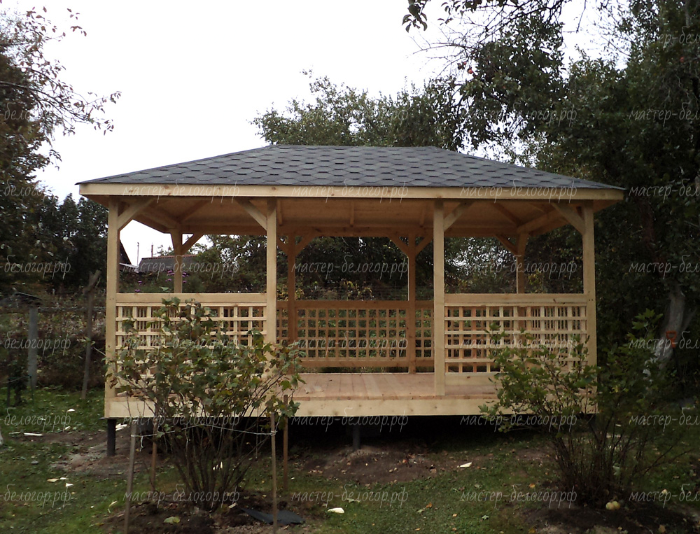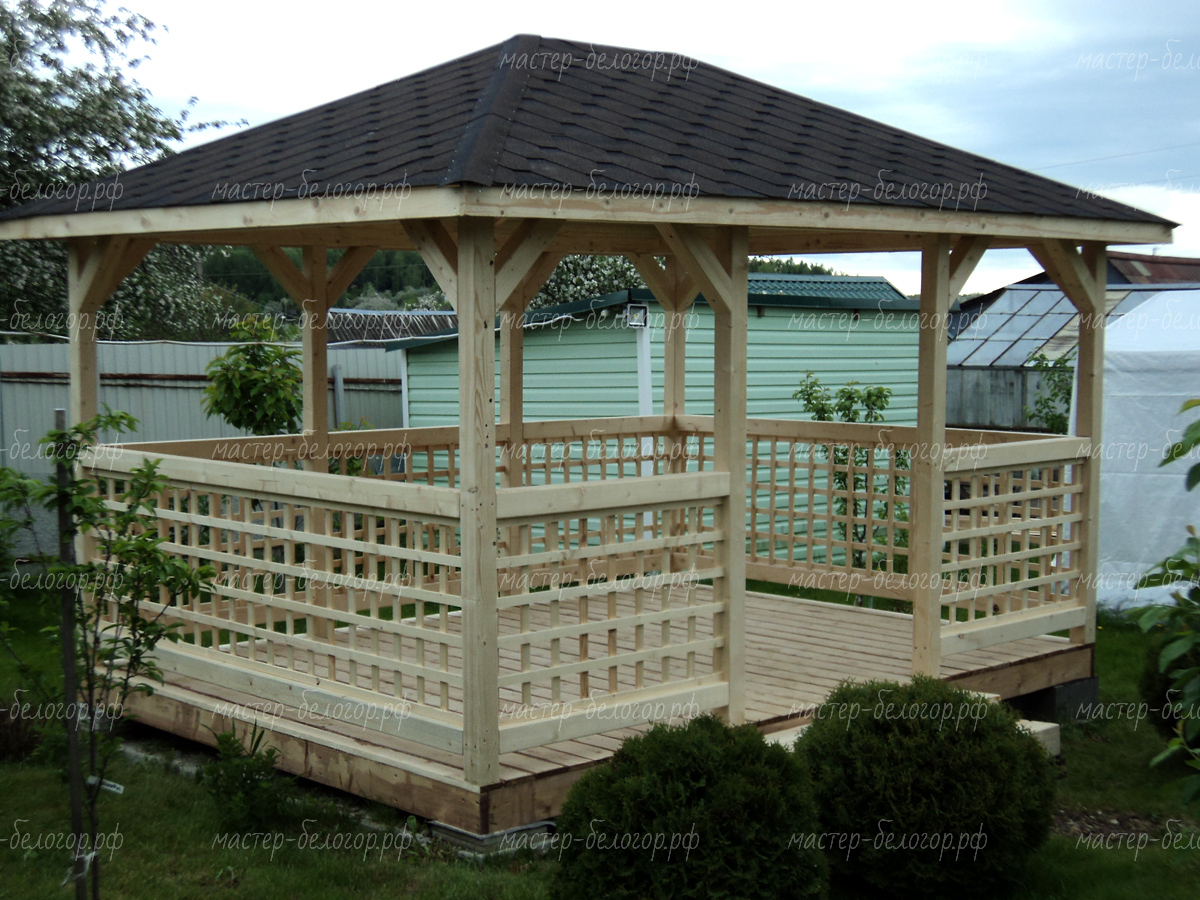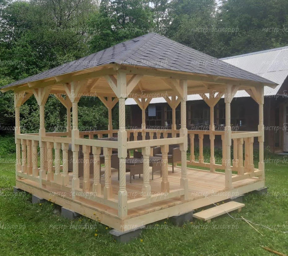 Крыша-ондулин,металлопрофиль или мягкая кровля(в зависимости от модели беседки).Цвет на выбор:красный,коричневый,зеленый.