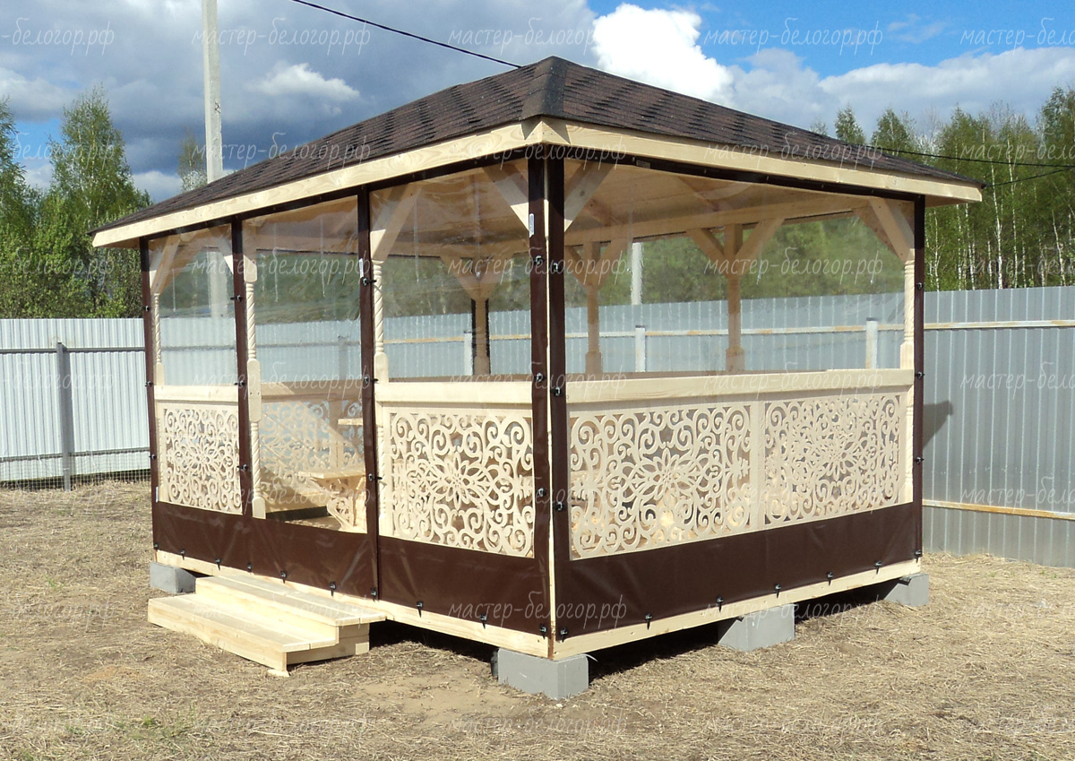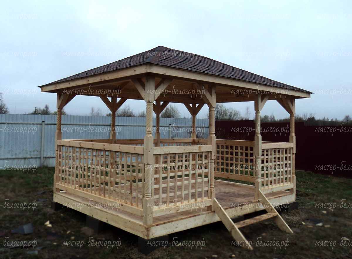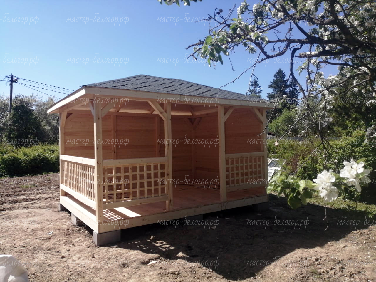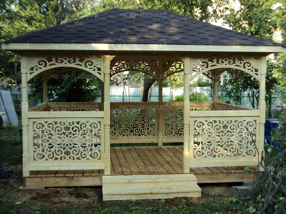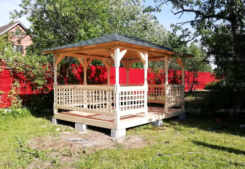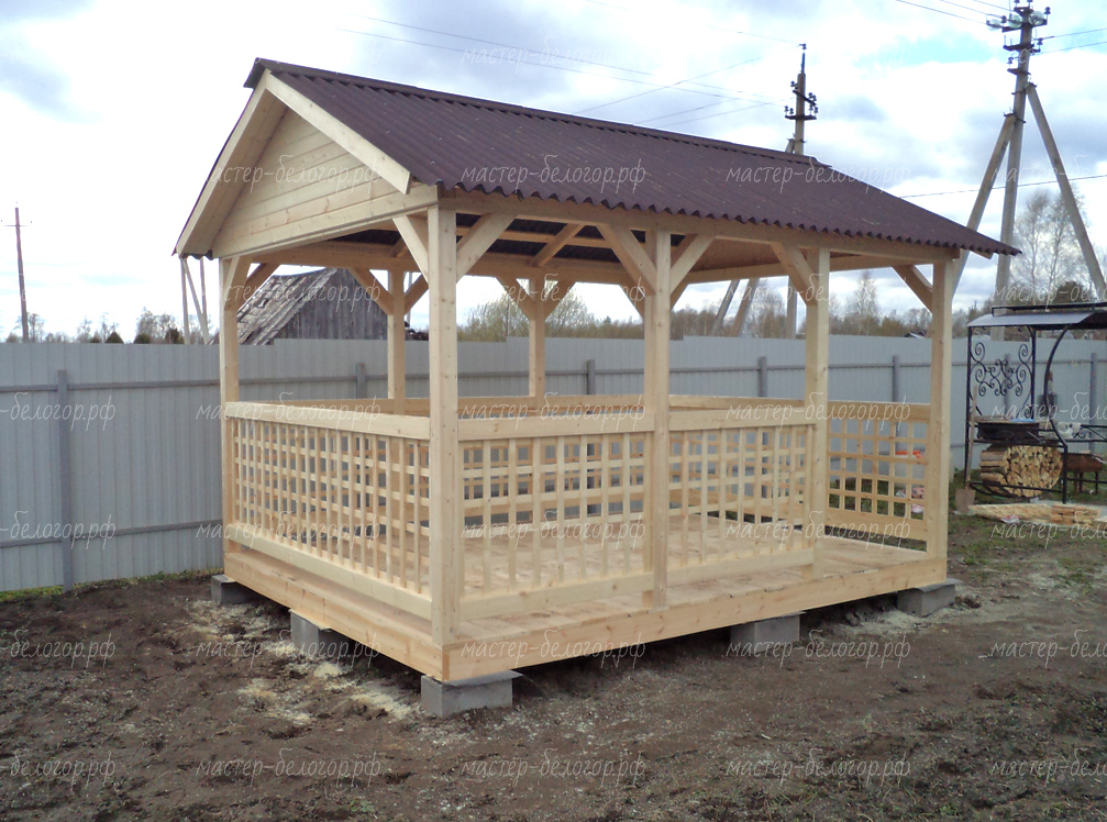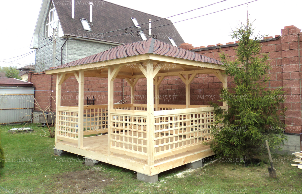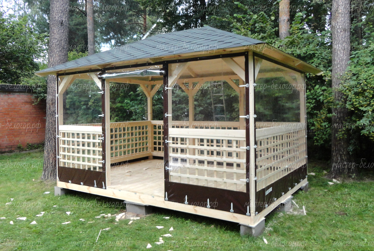Крыша-ондулин,металлопрофиль или мягкая кровля(в зависимости от модели беседки).Цвет на выбор:красный,коричневый,зеленый.