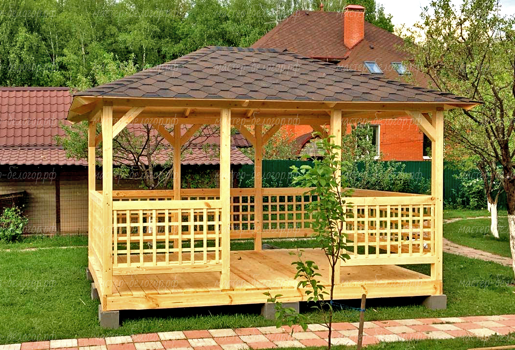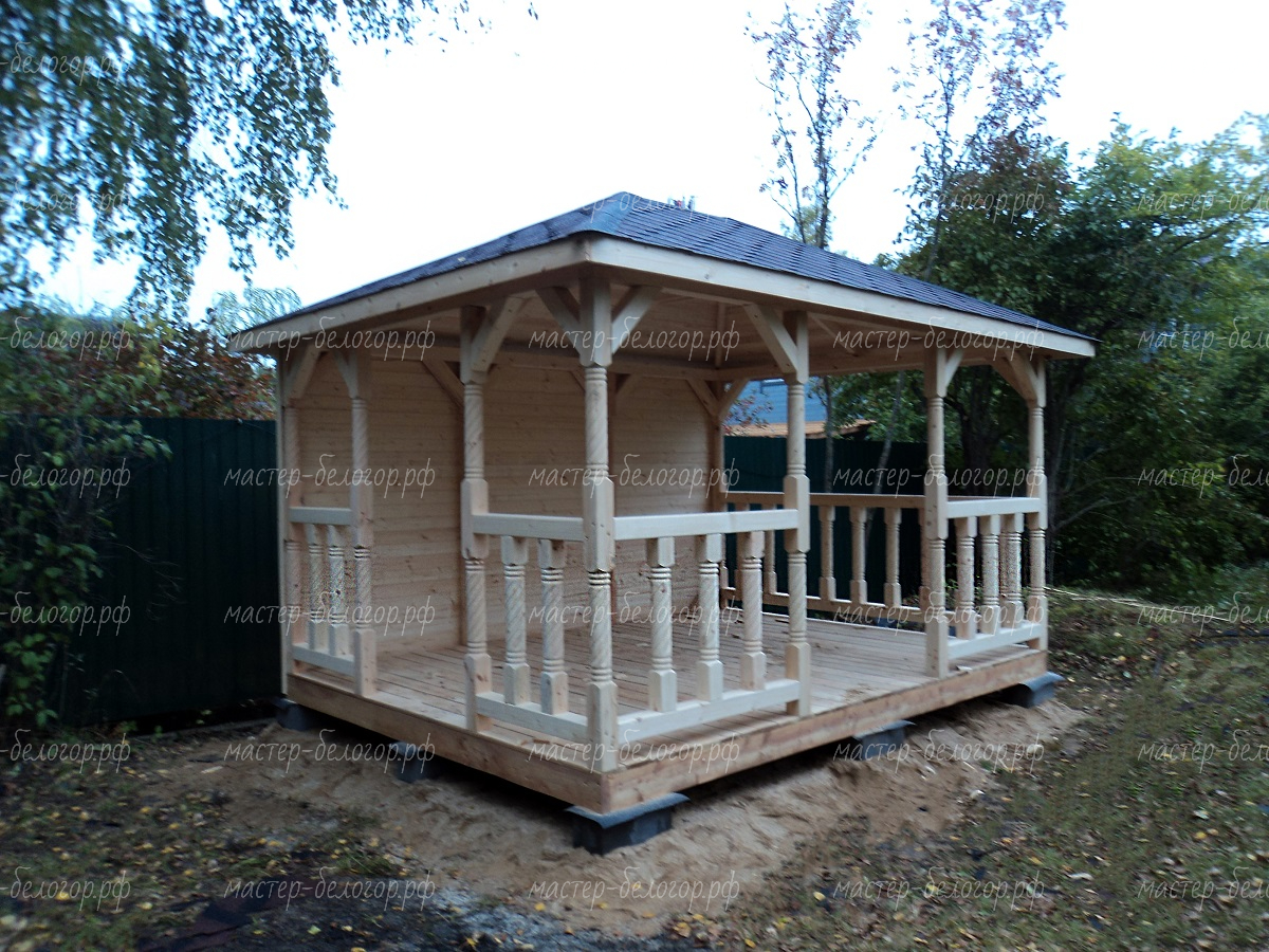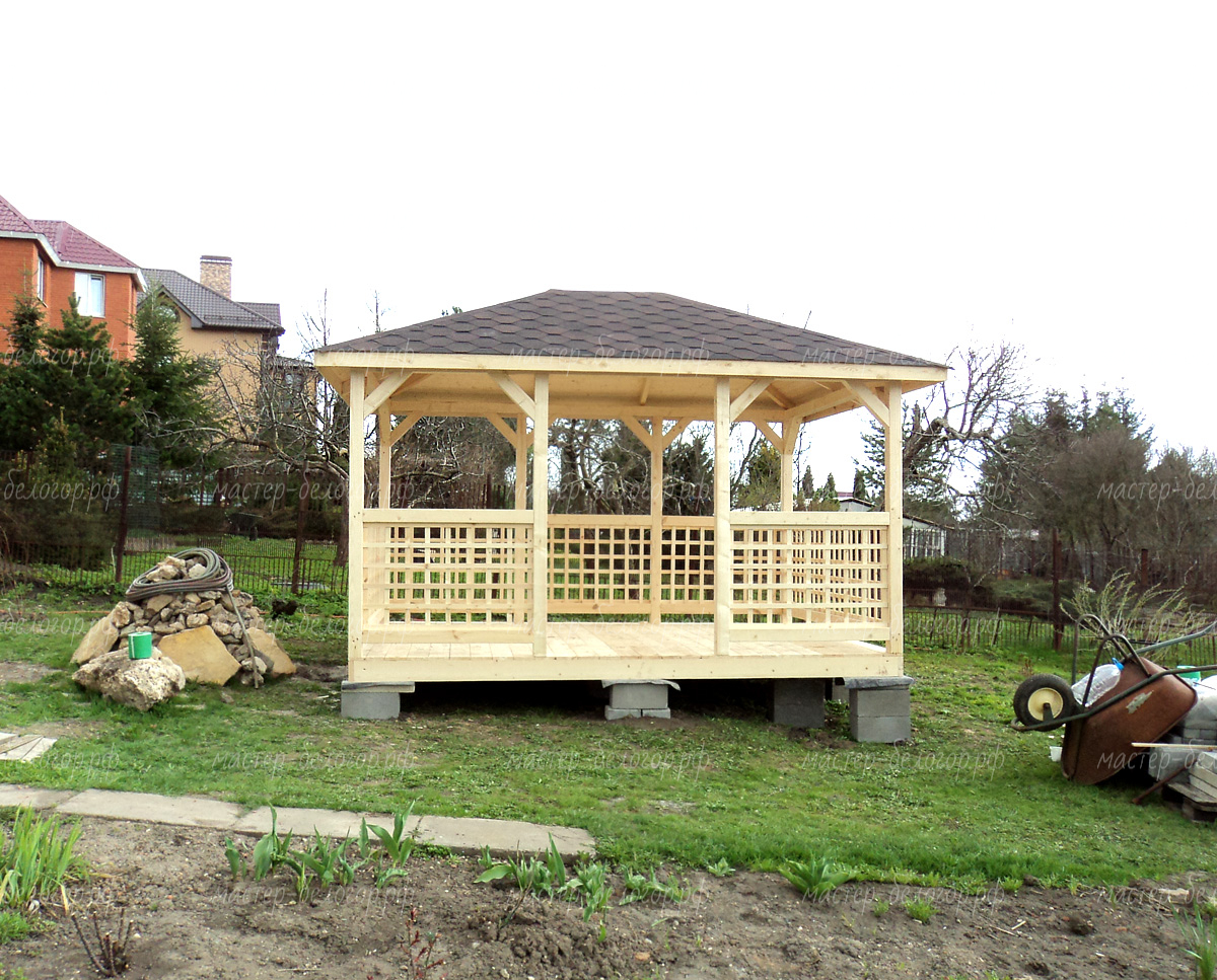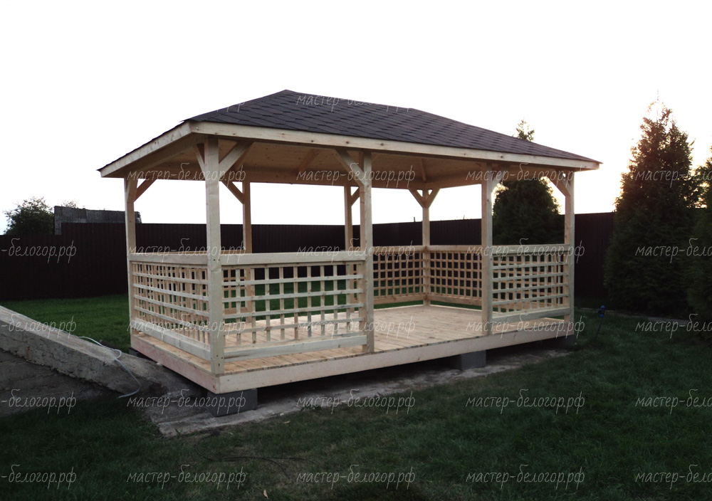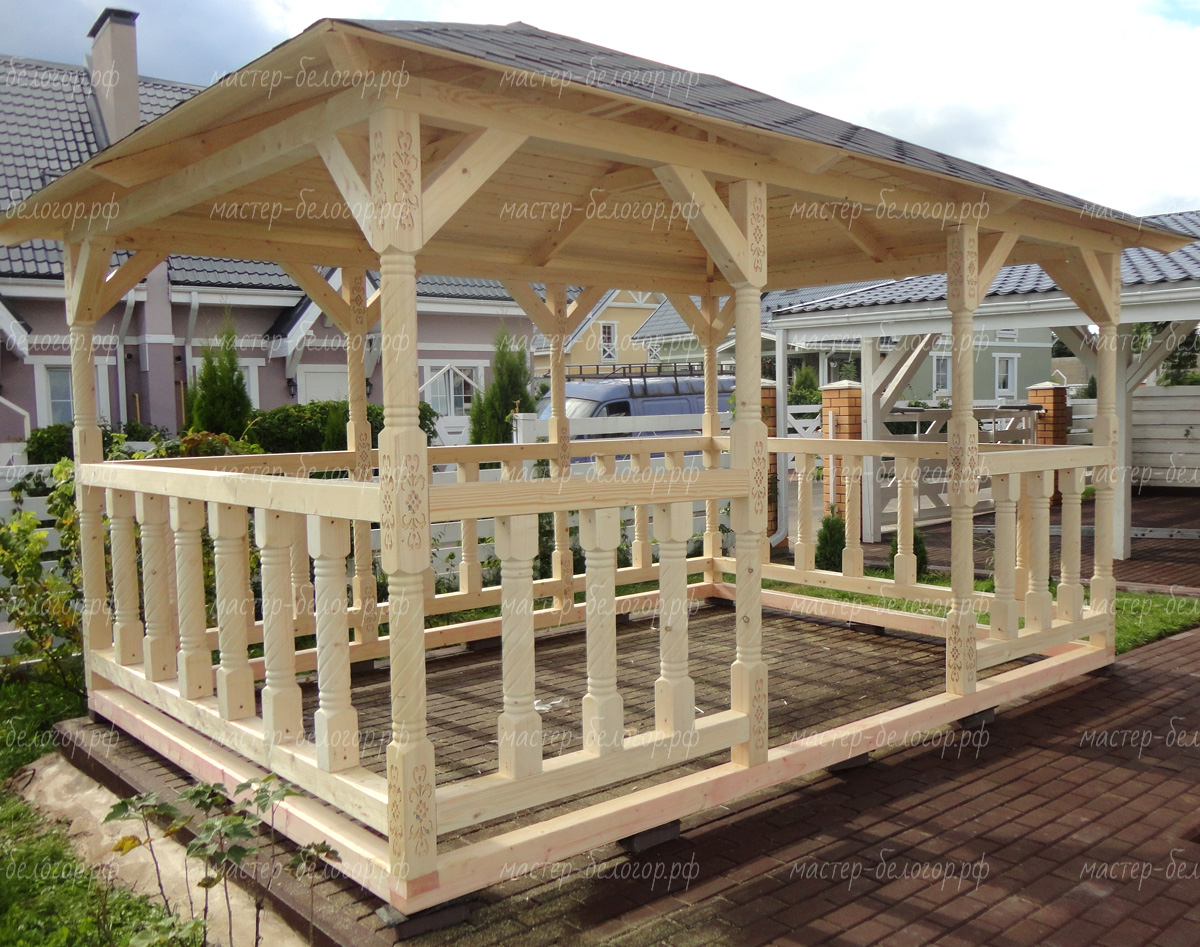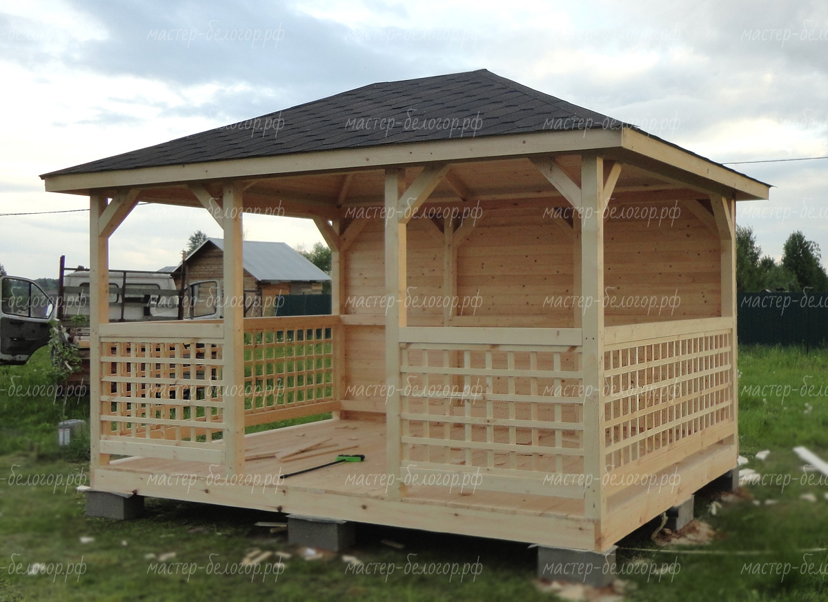 Крыша-ондулин,металлопрофиль или мягкая кровля(в зависимости от модели беседки).Цвет на выбор:красный,коричневый,зеленый.