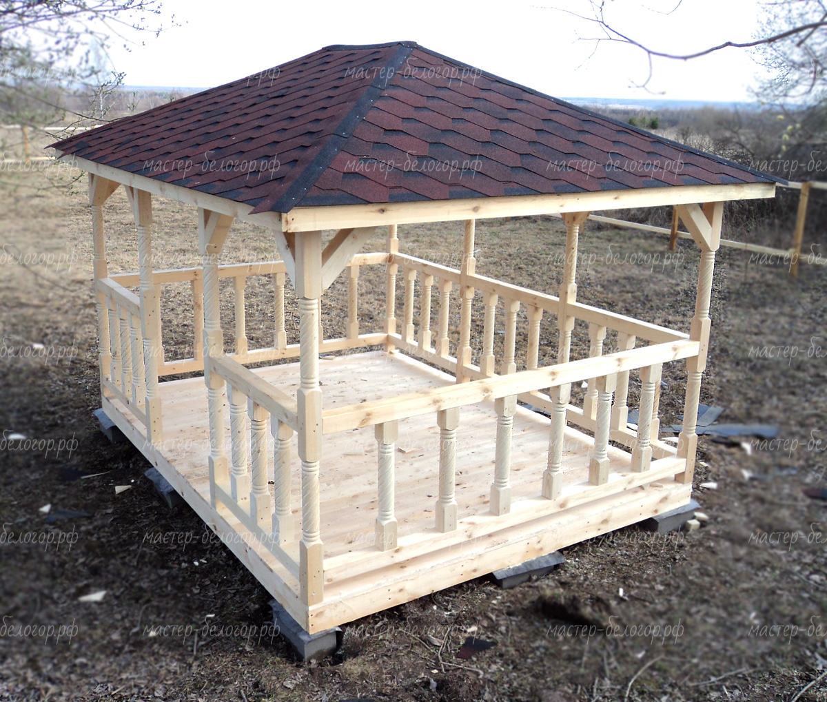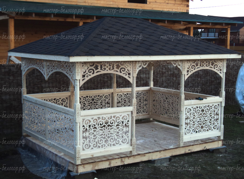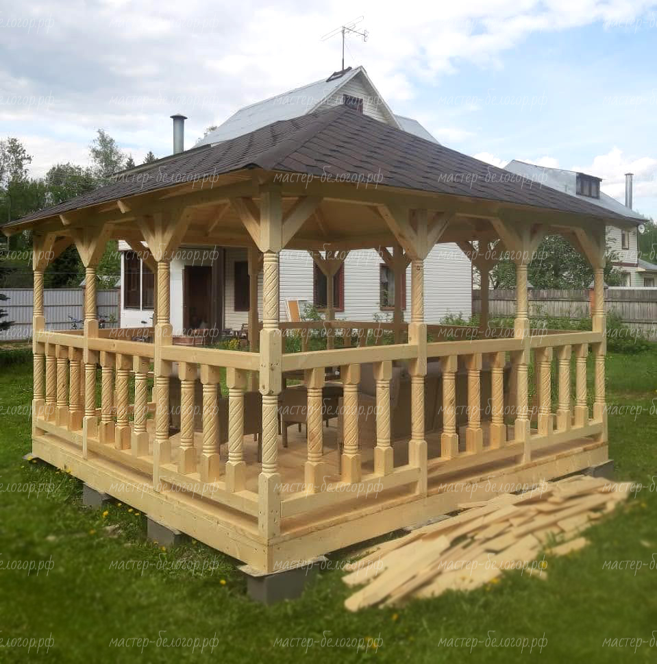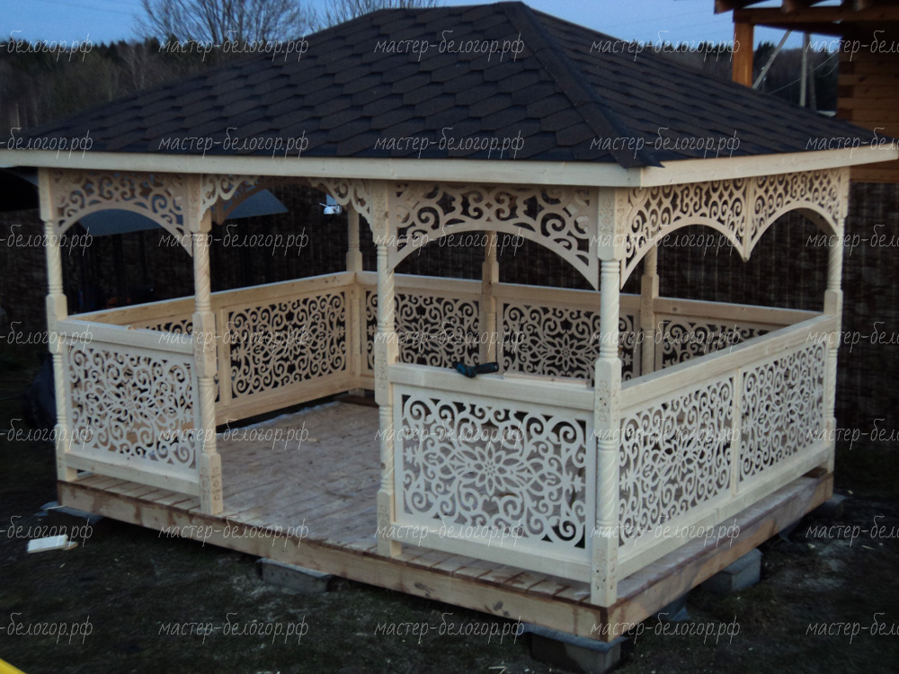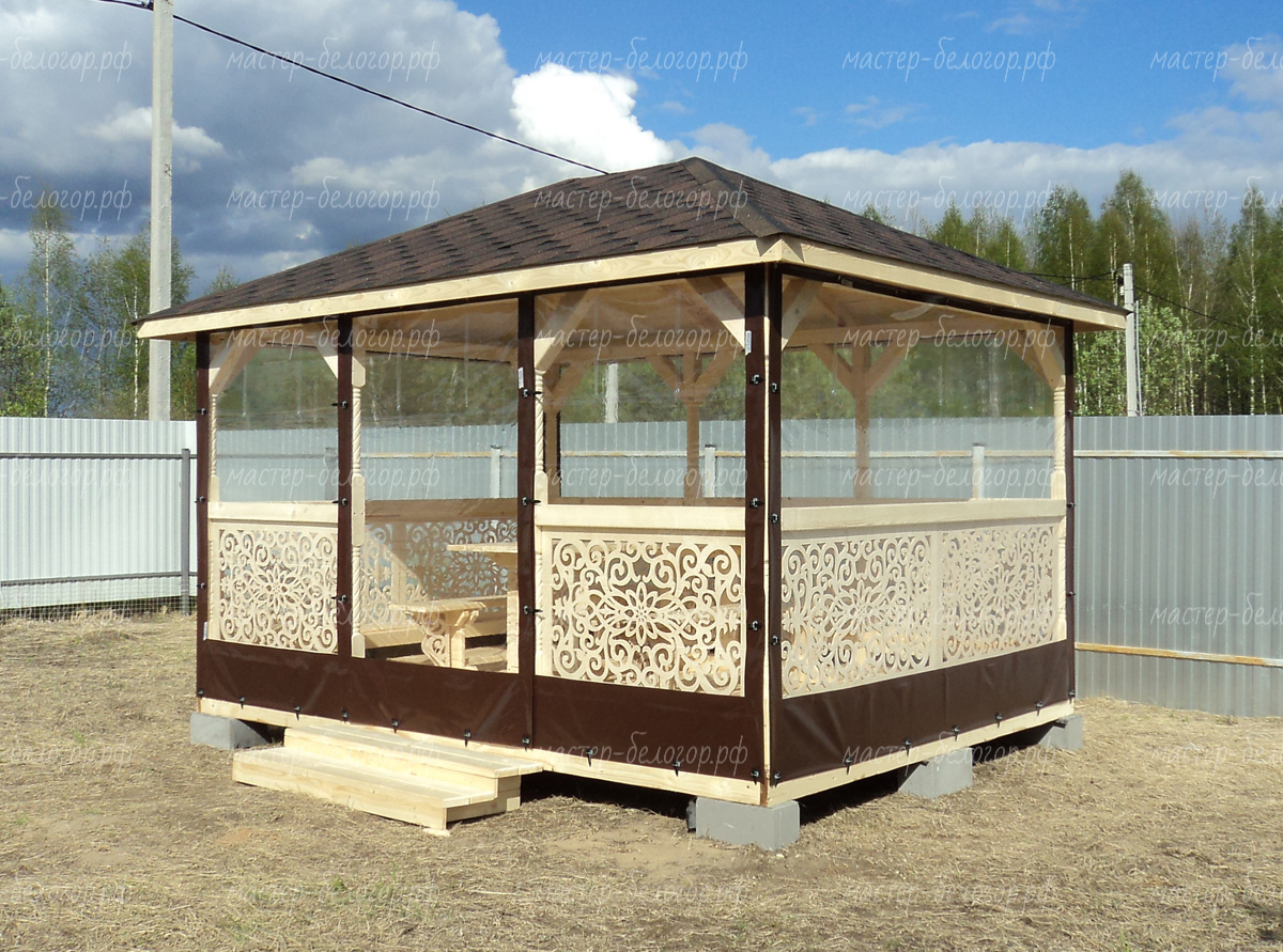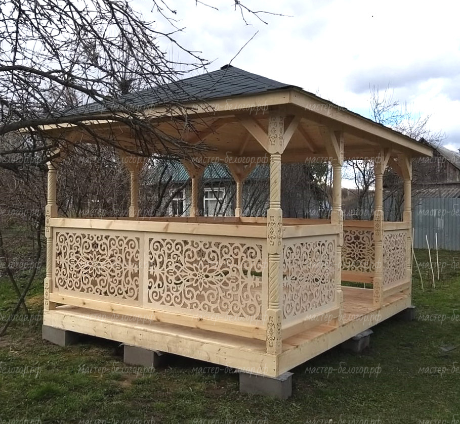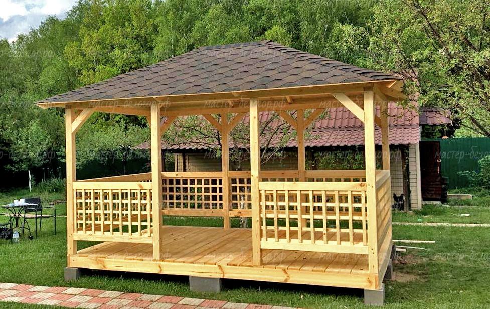 Крыша-ондулин,металлопрофиль или мягкая кровля(в зависимости от модели беседки).Цвет на выбор:красный,коричневый,зеленый.