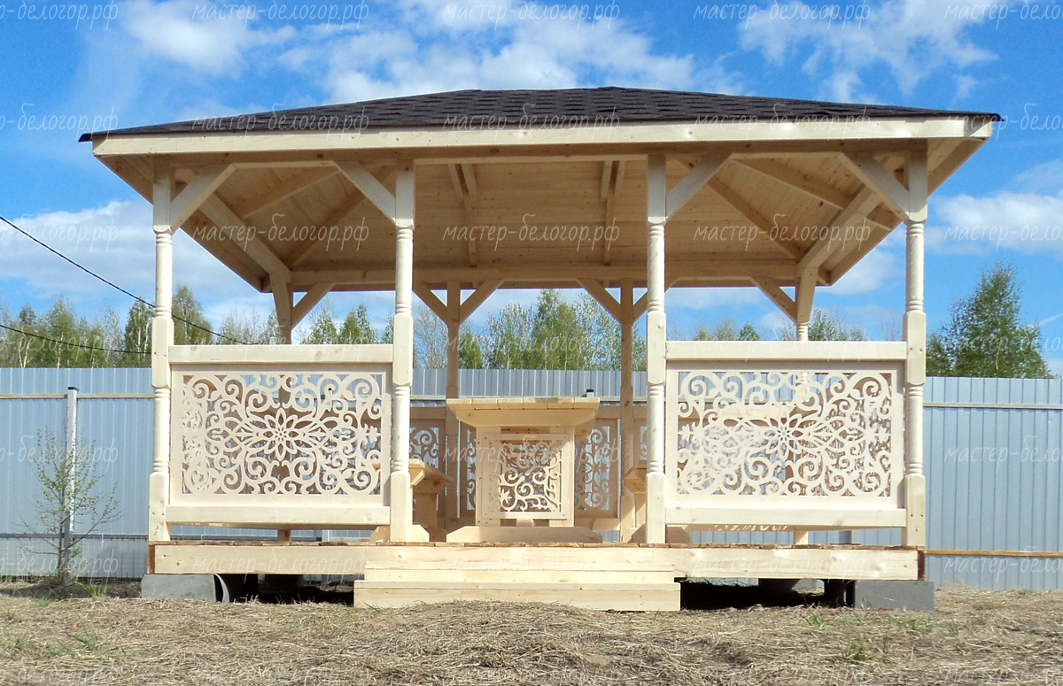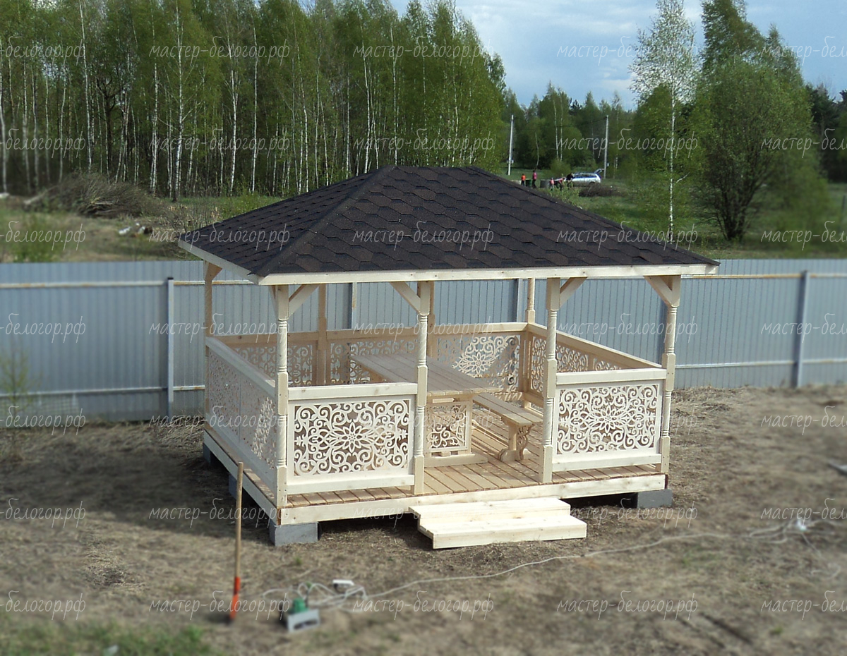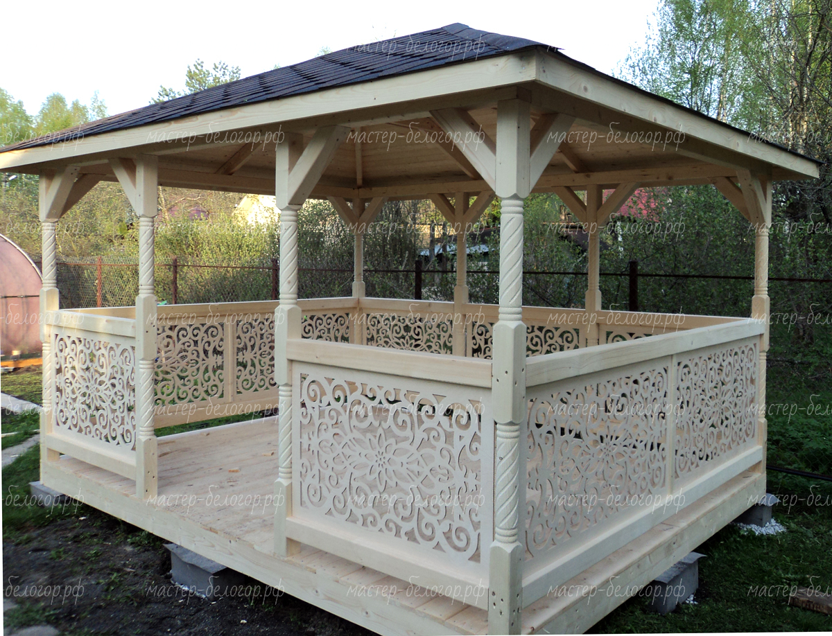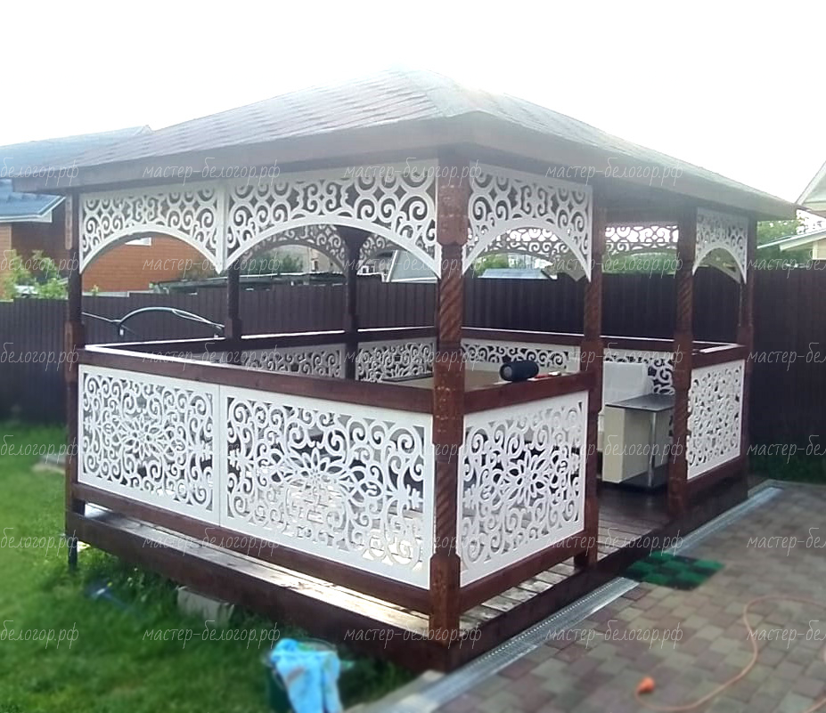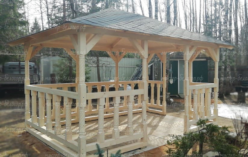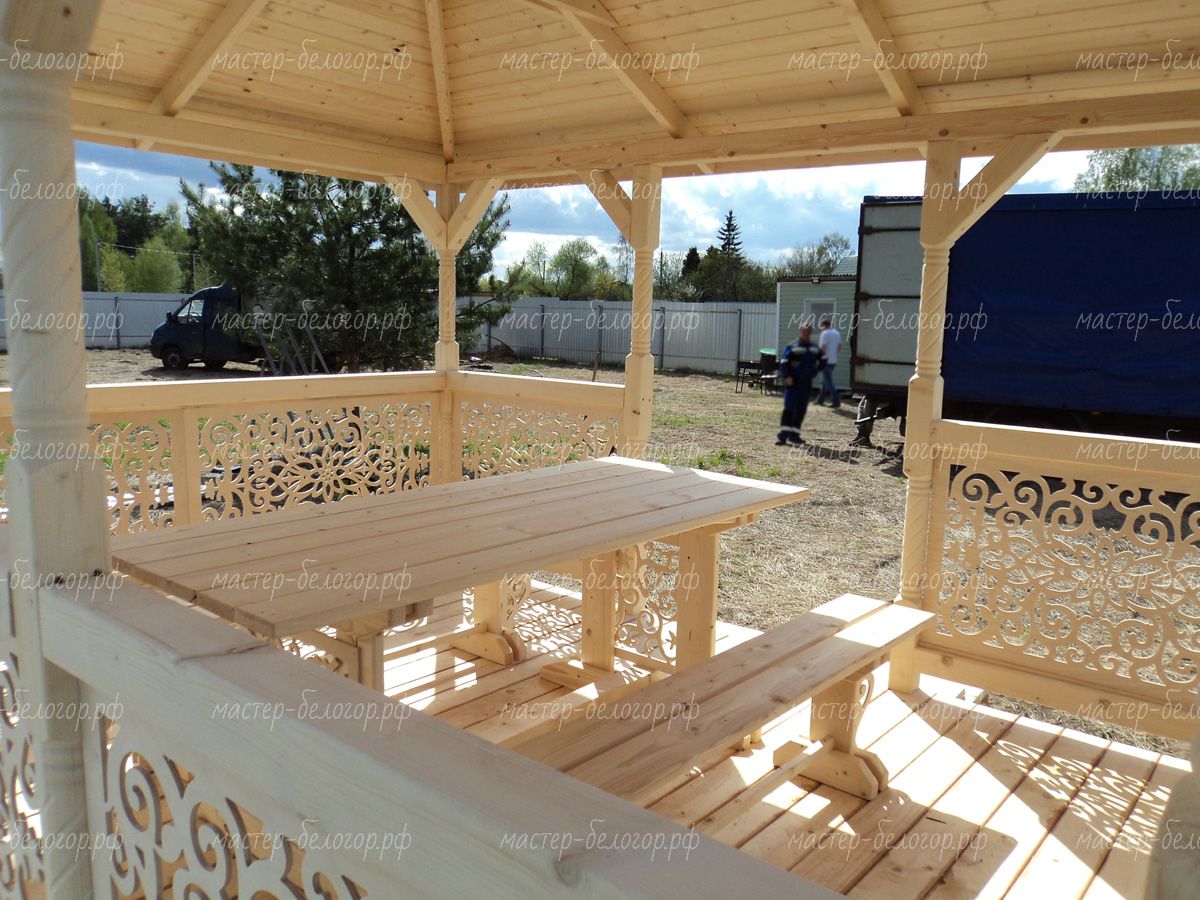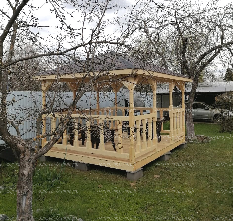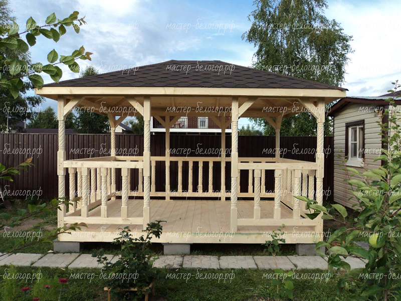 Крыша-ондулин,металлопрофиль или мягкая кровля(в зависимости от модели беседки).Цвет на выбор:красный,коричневый,зеленый.