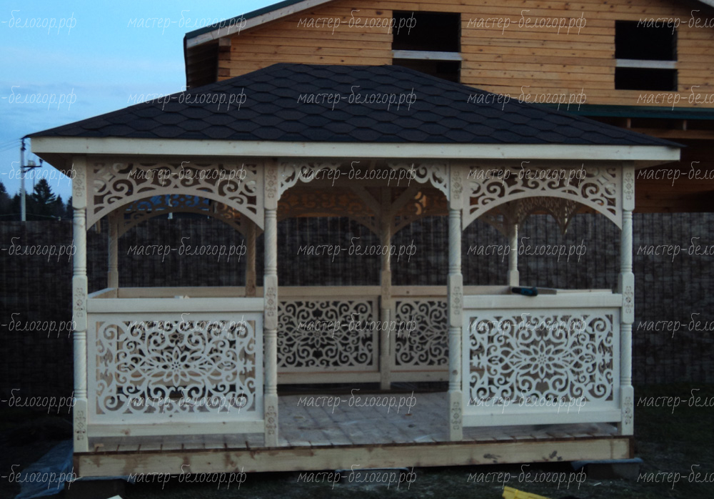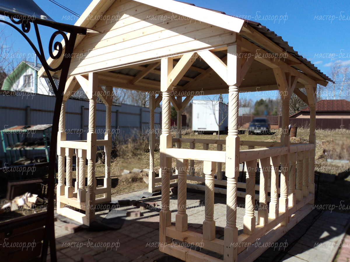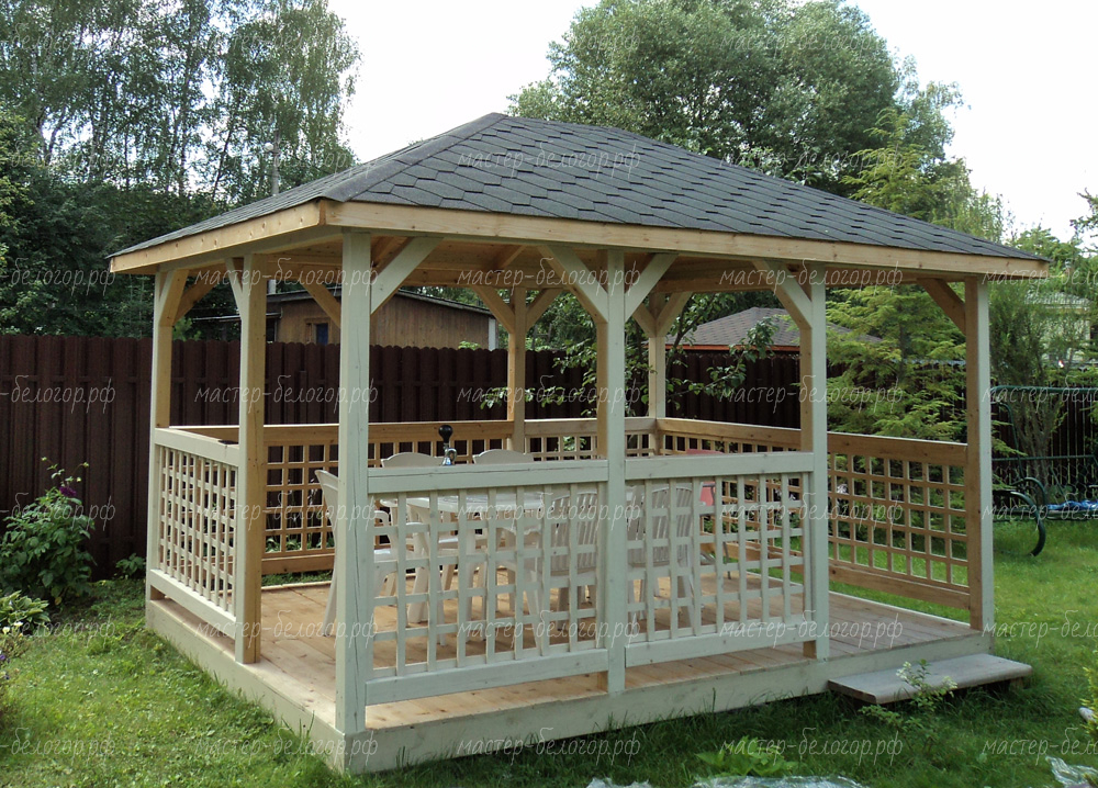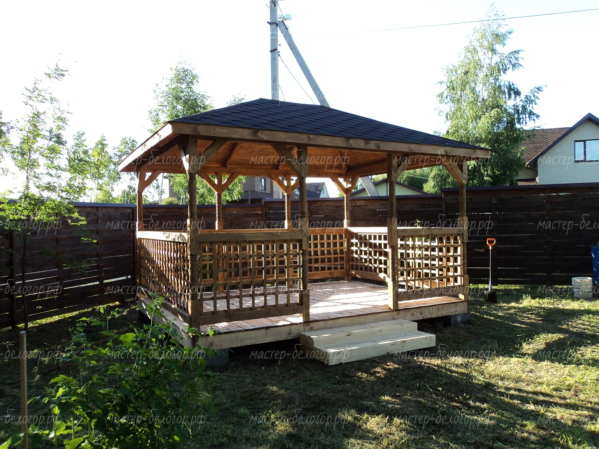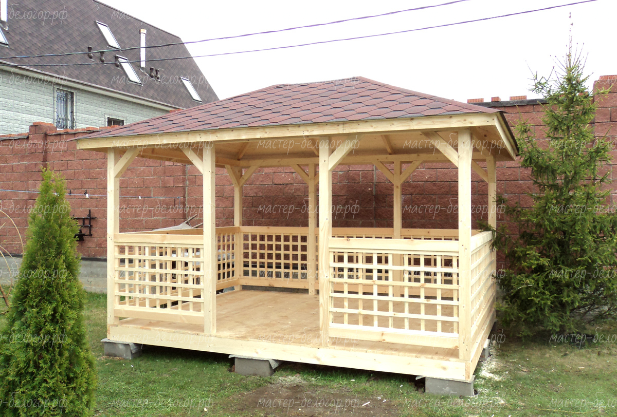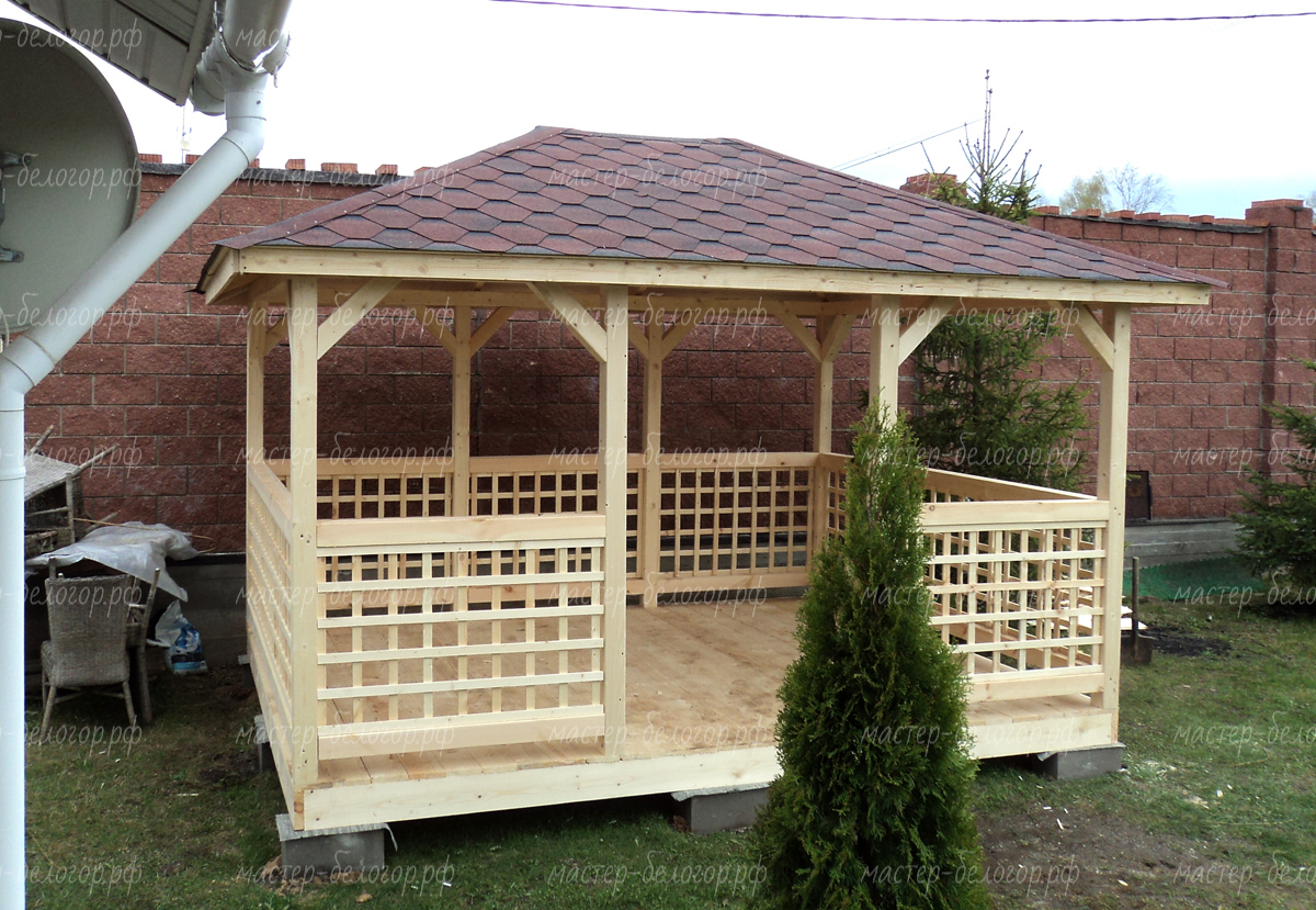 Крыша-ондулин,металлопрофиль или мягкая кровля(в зависимости от модели беседки).Цвет на выбор:красный,коричневый,зеленый.