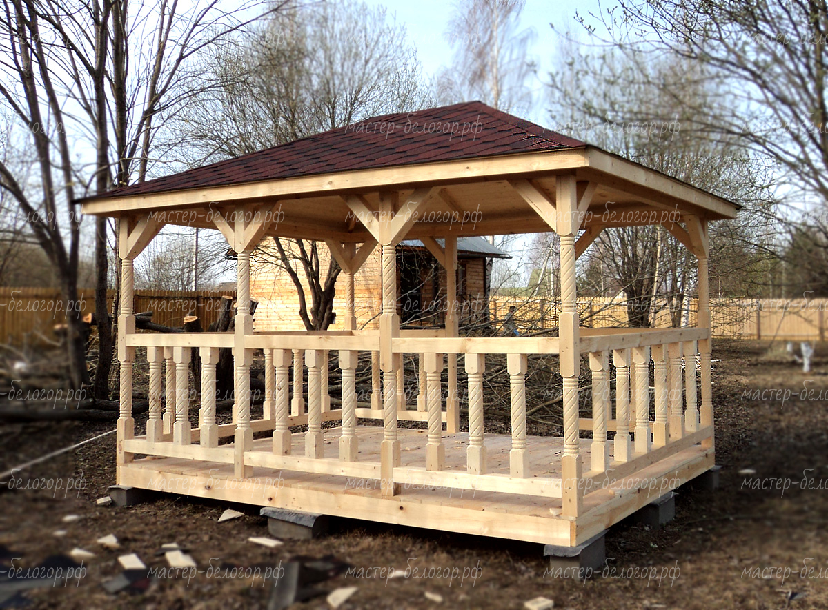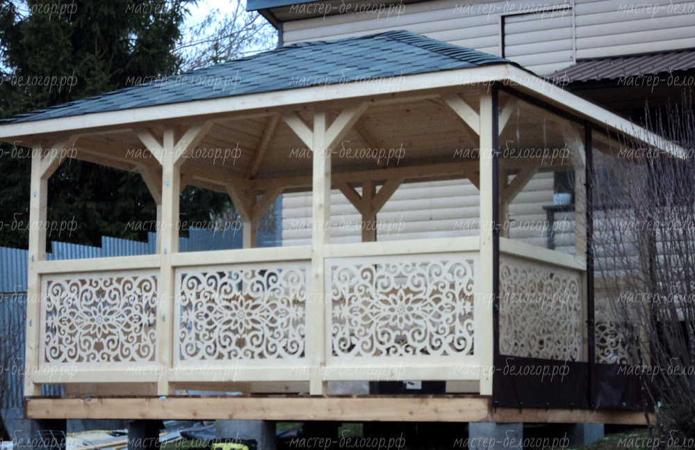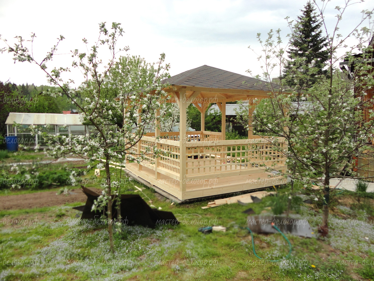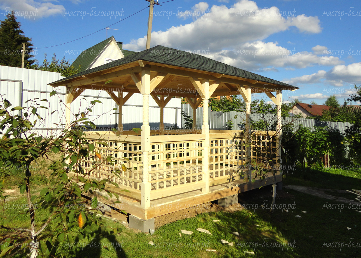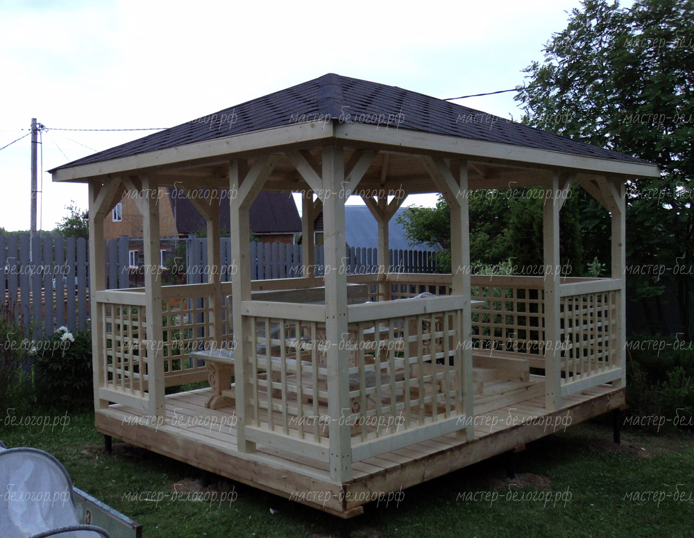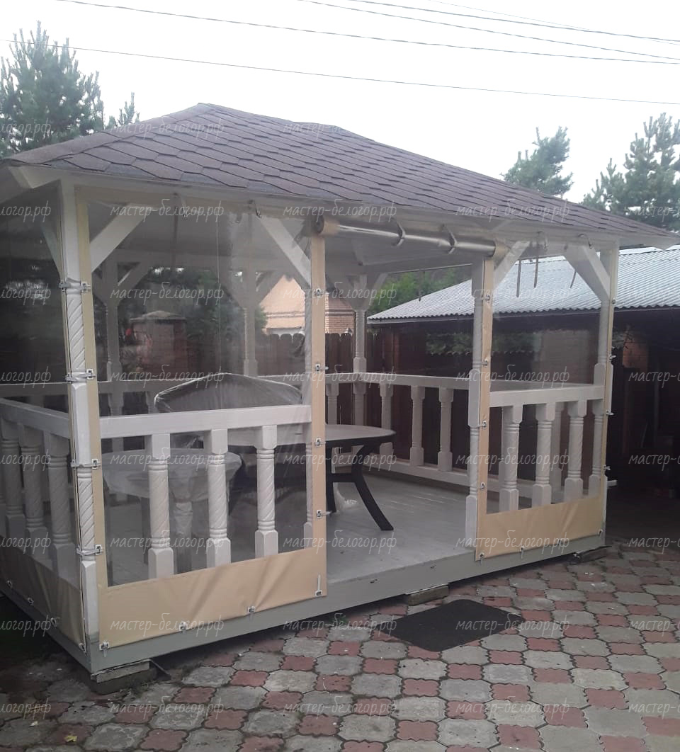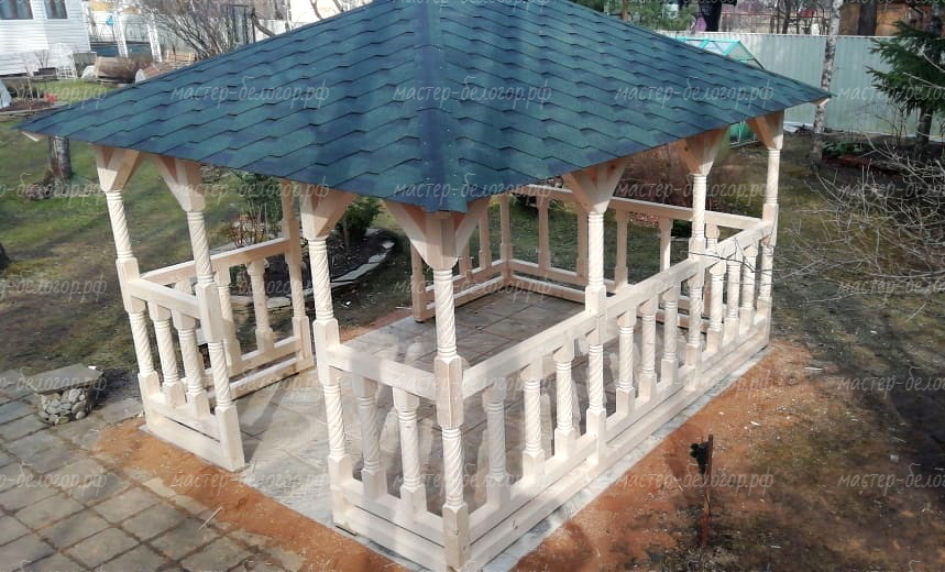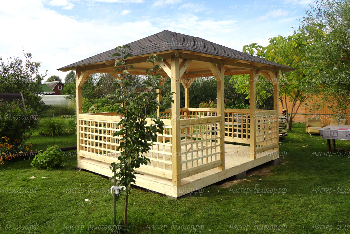 Крыша-ондулин,металлопрофиль или мягкая кровля(в зависимости от модели беседки).Цвет на выбор:красный,коричневый,зеленый.