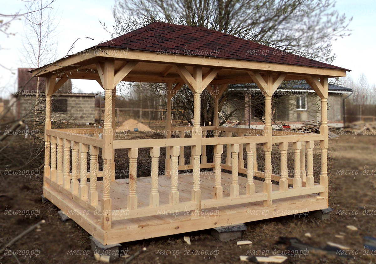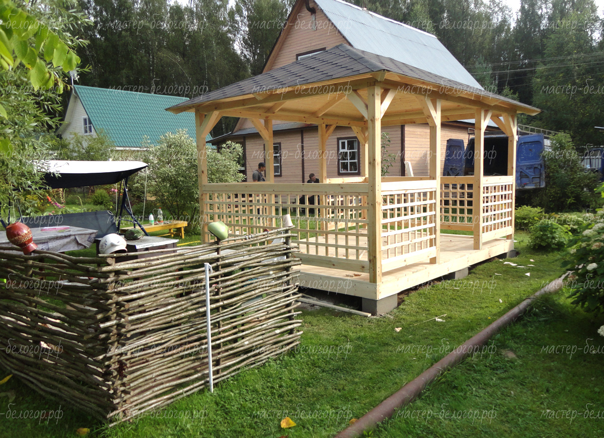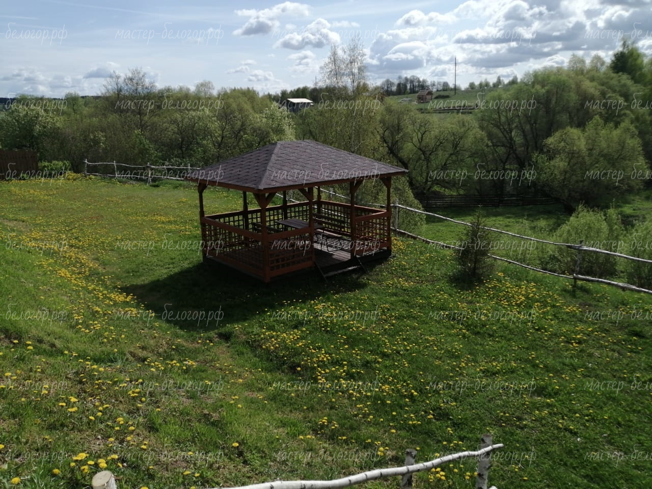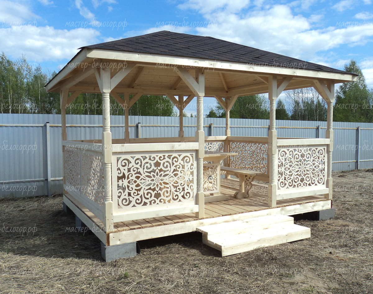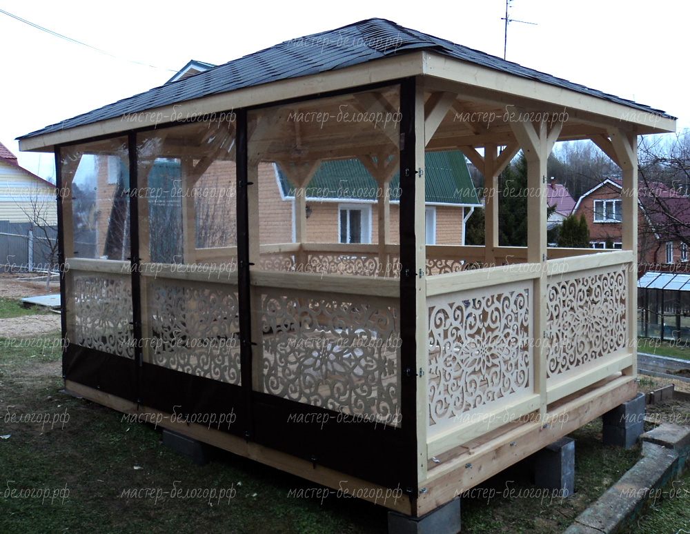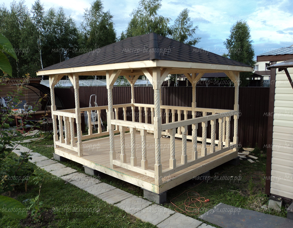 Крыша-ондулин,металлопрофиль или мягкая кровля(в зависимости от модели беседки).Цвет на выбор:красный,коричневый,зеленый.