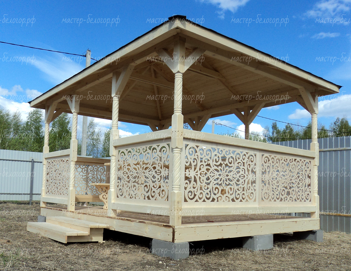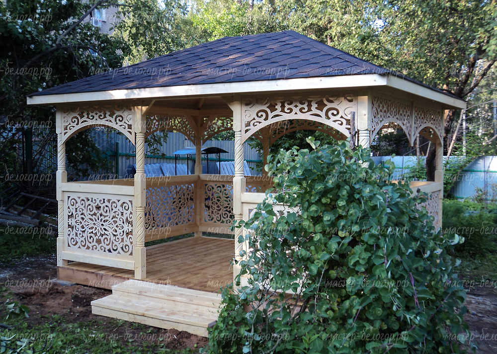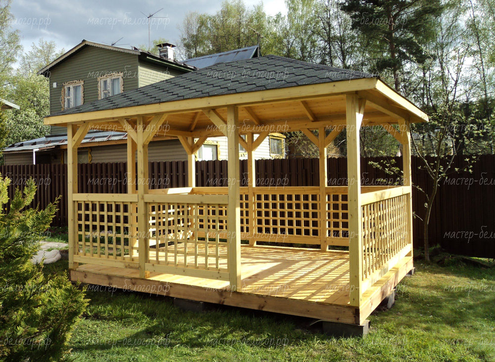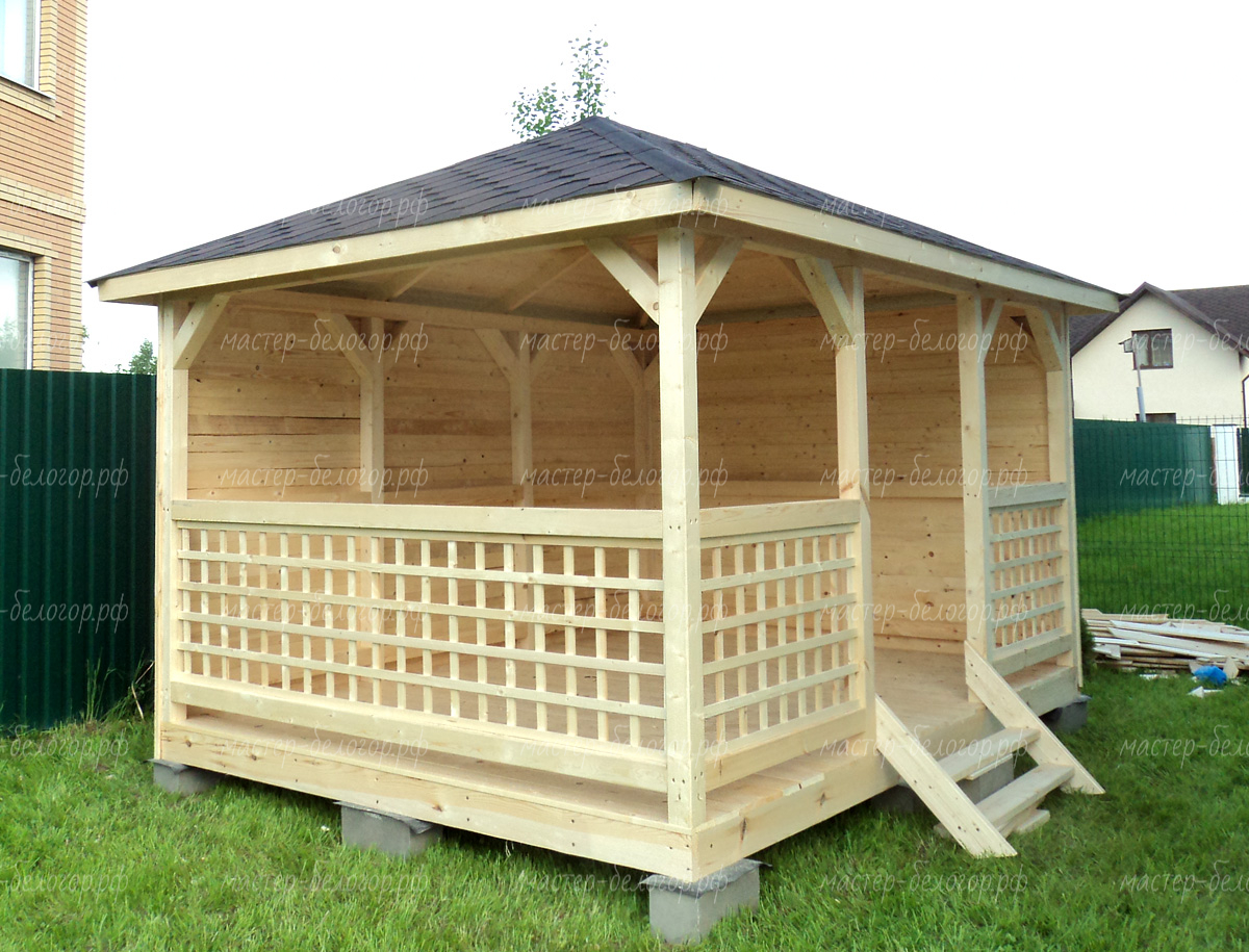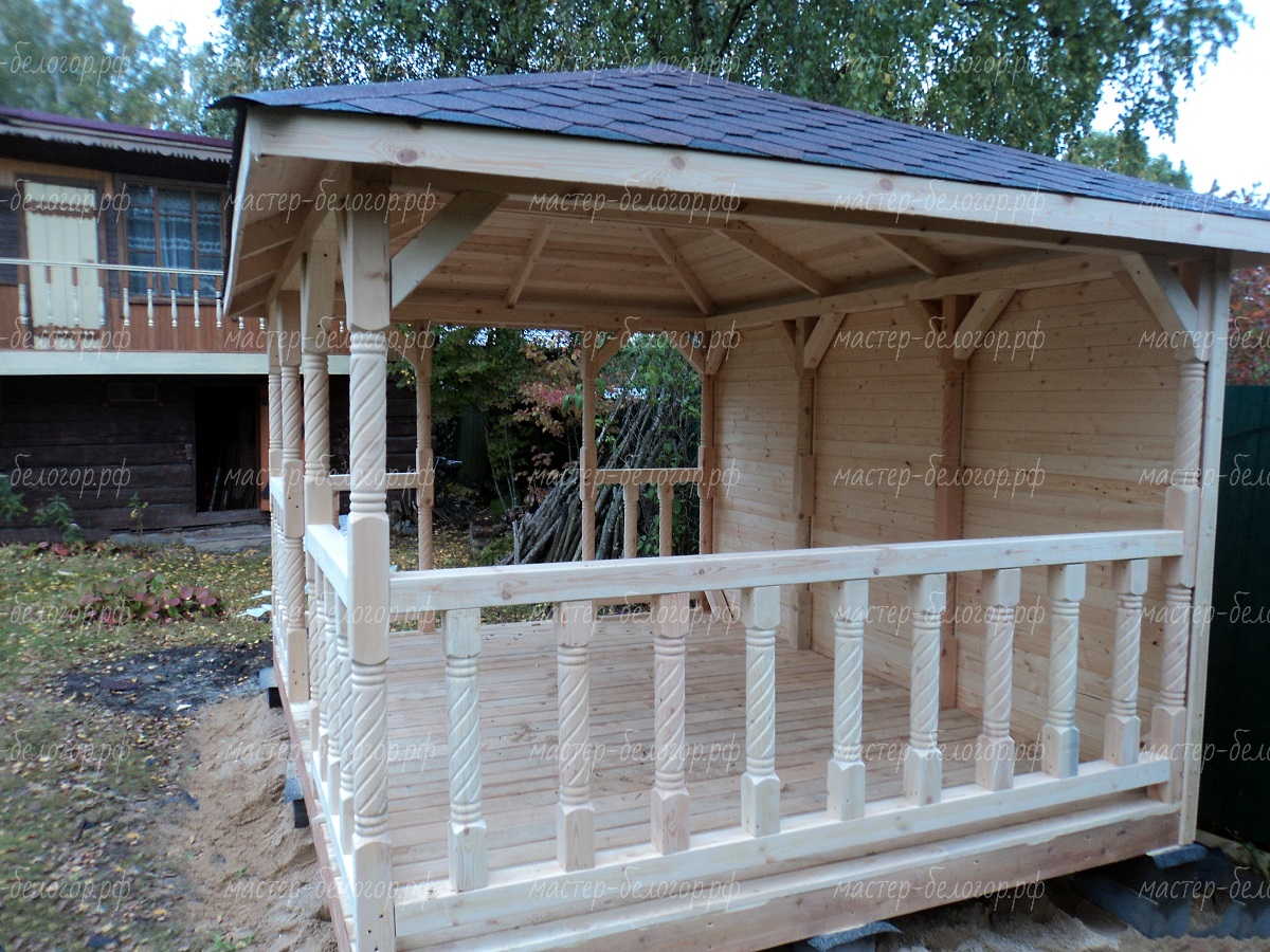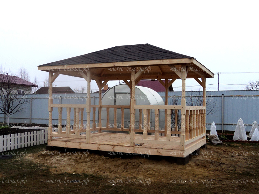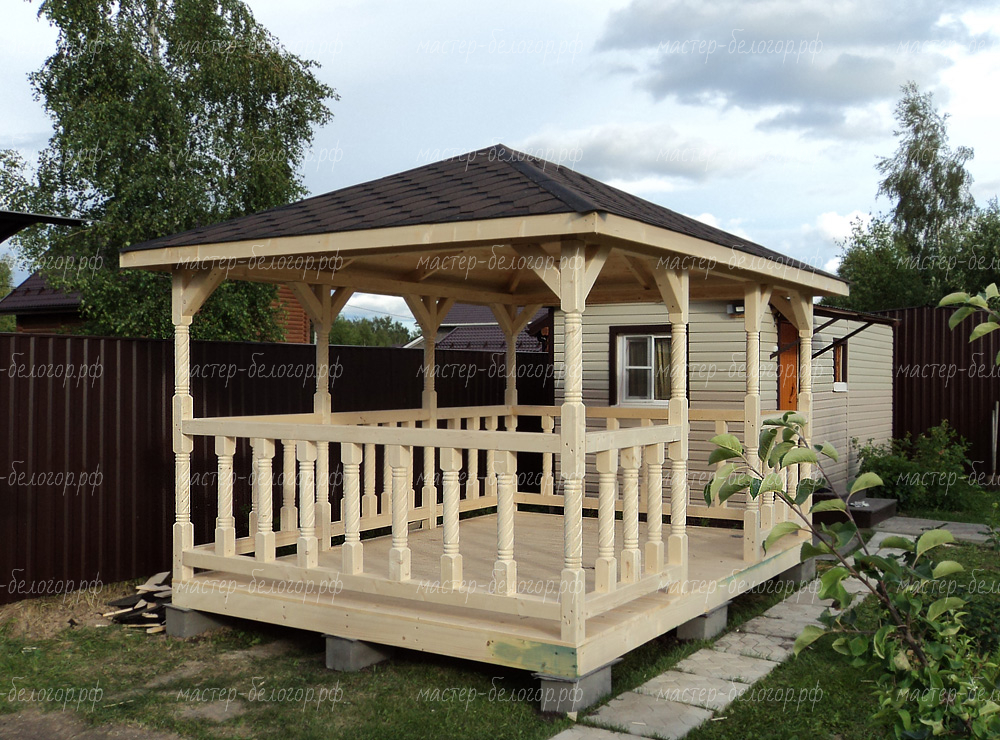 Крыша-ондулин,металлопрофиль или мягкая кровля(в зависимости от модели беседки).Цвет на выбор:красный,коричневый,зеленый.