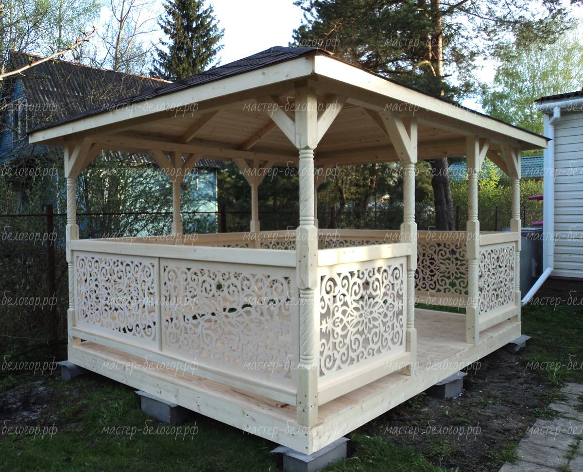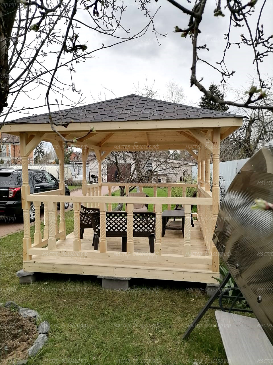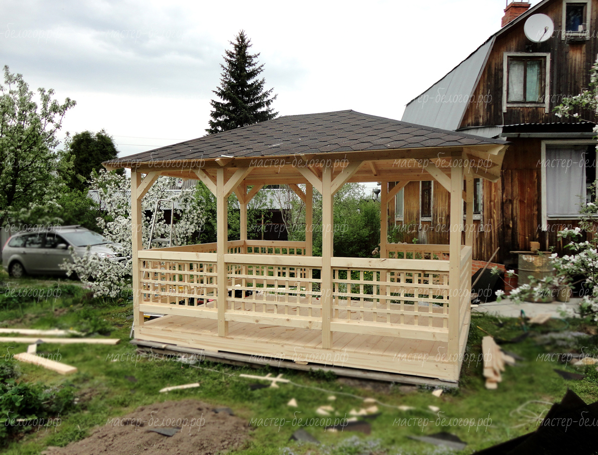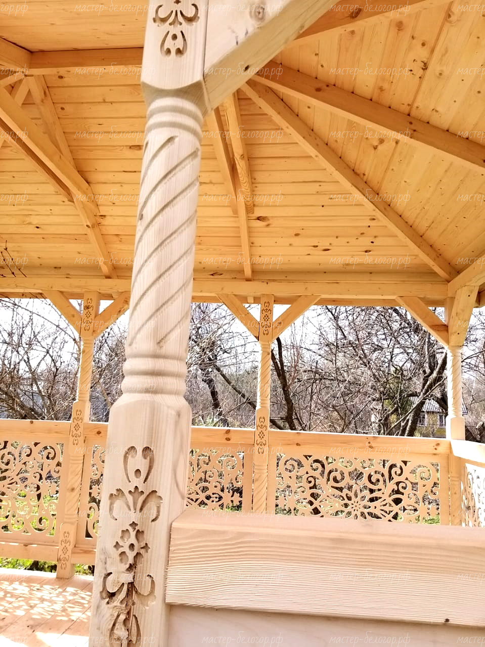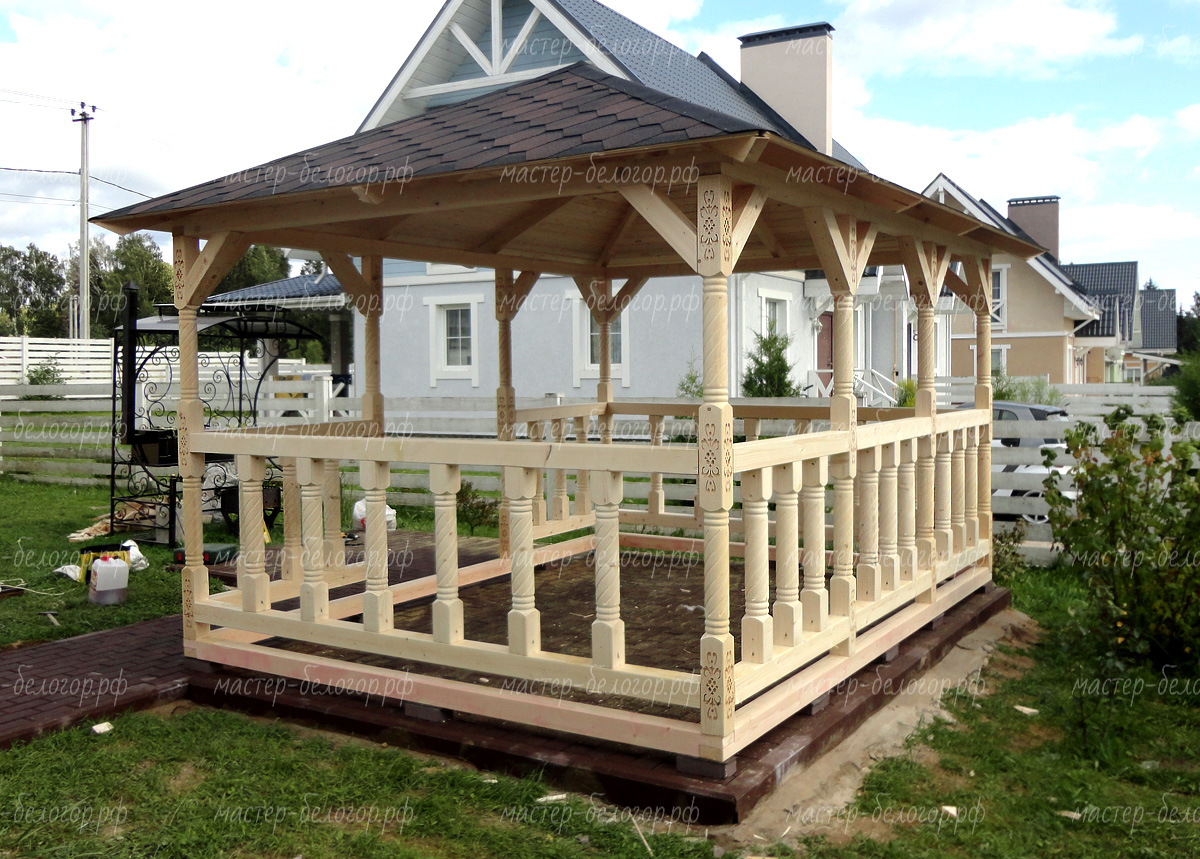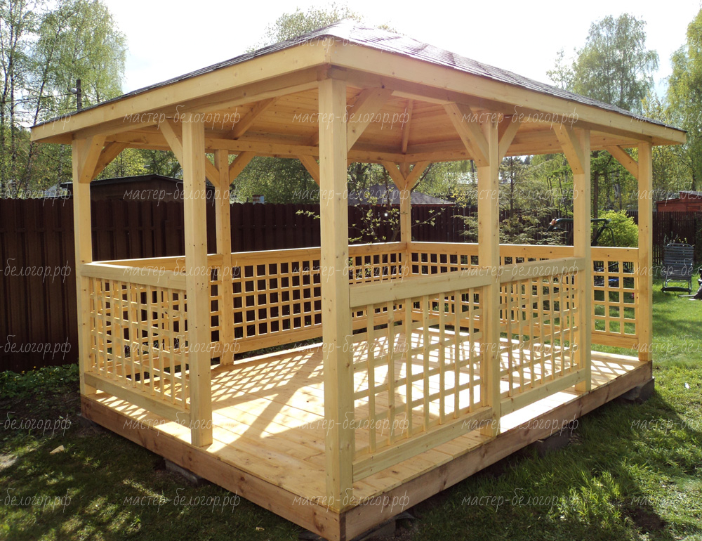 Крыша-ондулин,металлопрофиль или мягкая кровля(в зависимости от модели беседки).Цвет на выбор:красный,коричневый,зеленый.