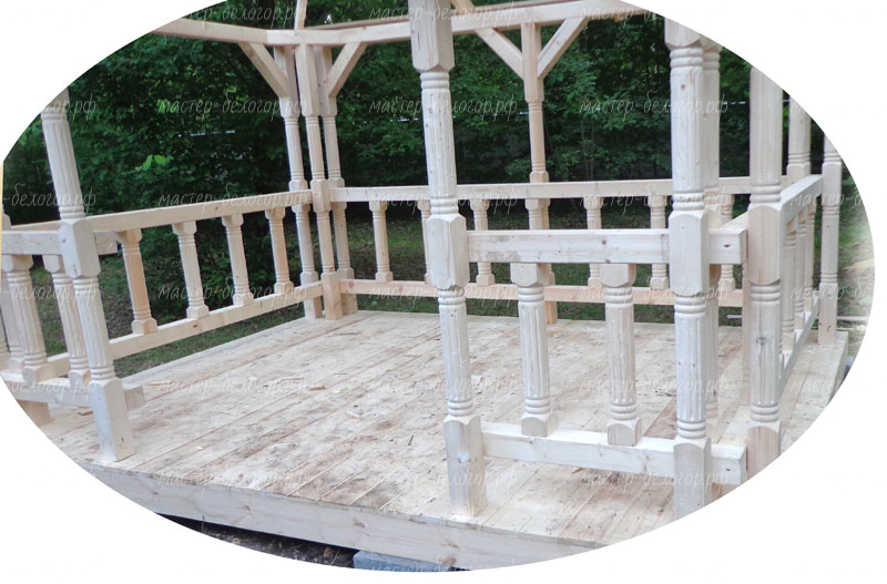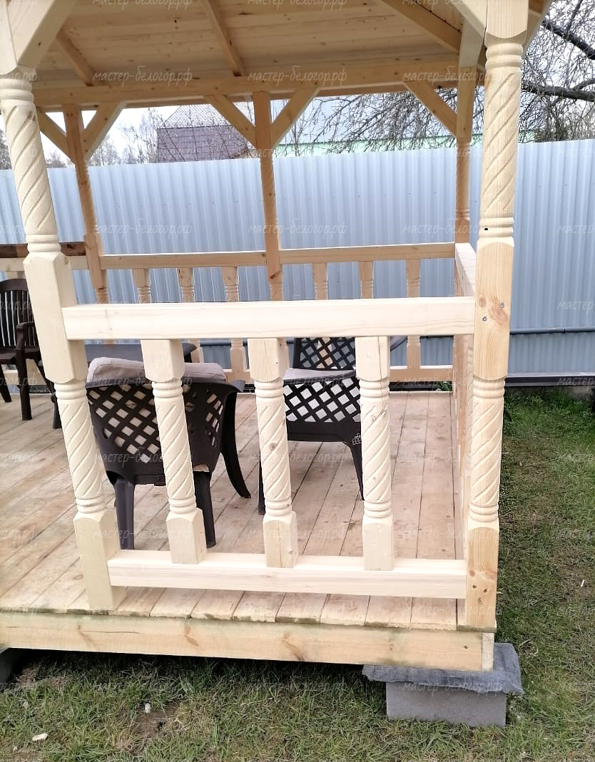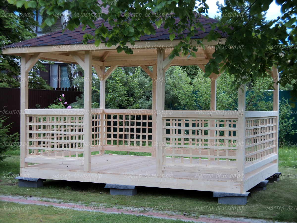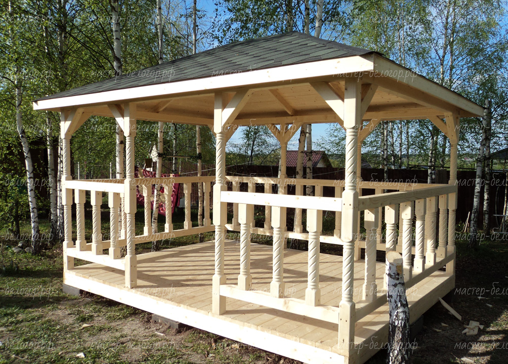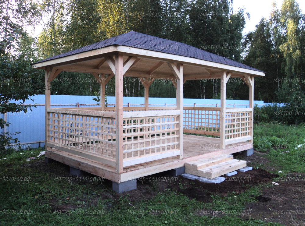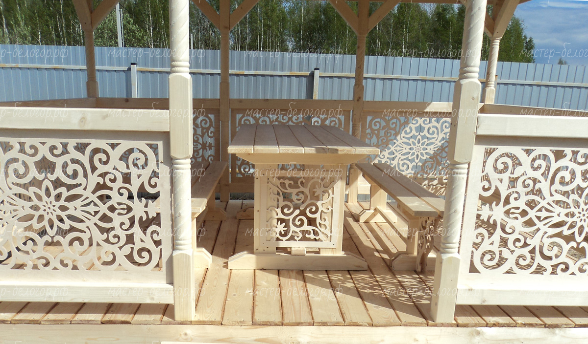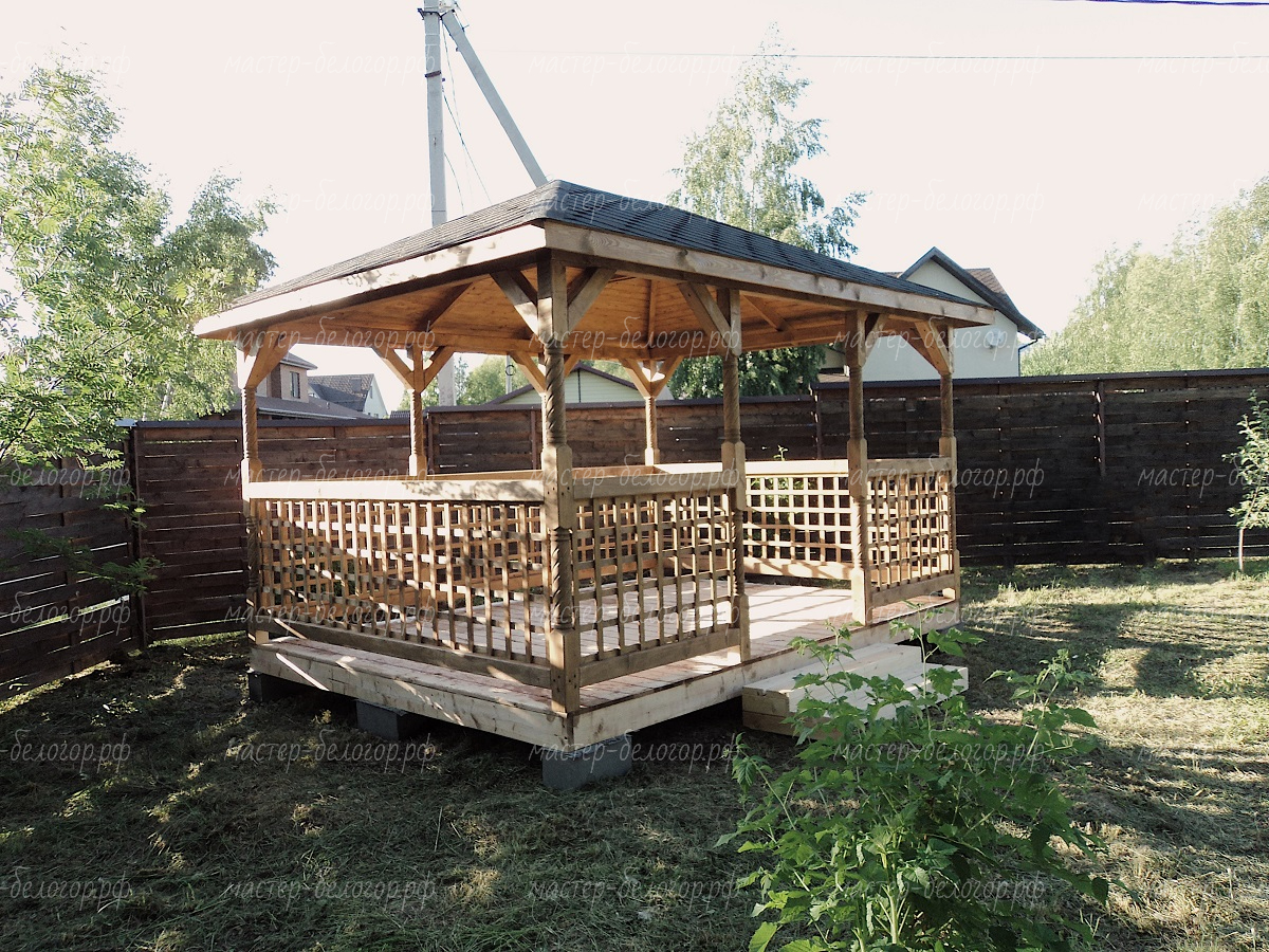 Крыша-ондулин,металлопрофиль или мягкая кровля(в зависимости от модели беседки).Цвет на выбор:красный,коричневый,зеленый.