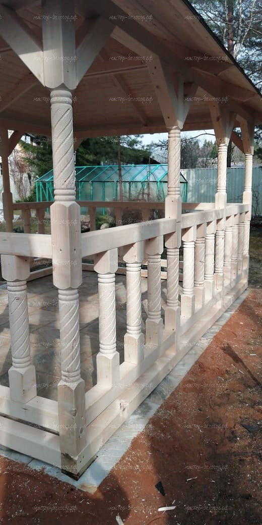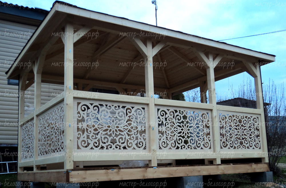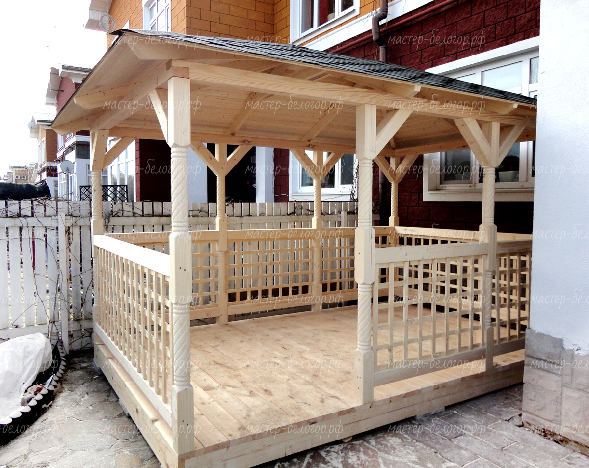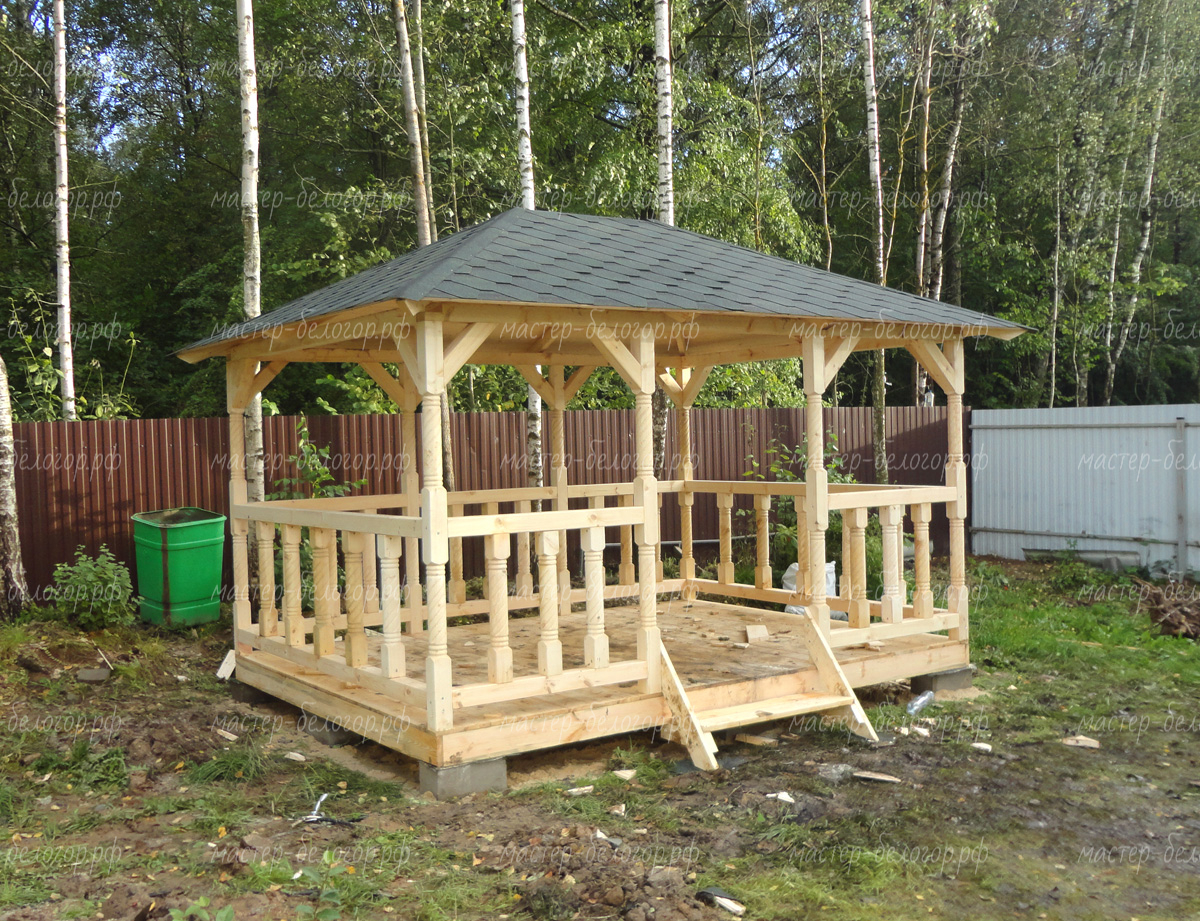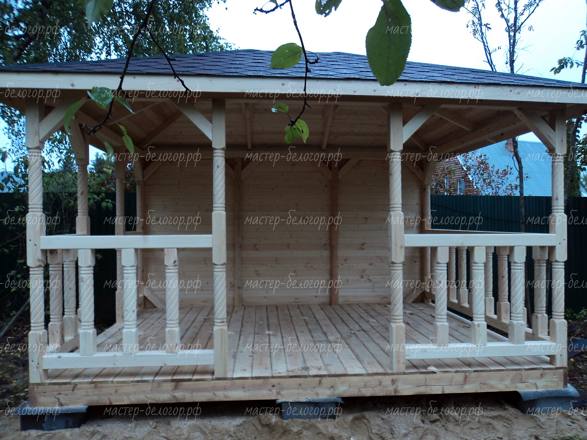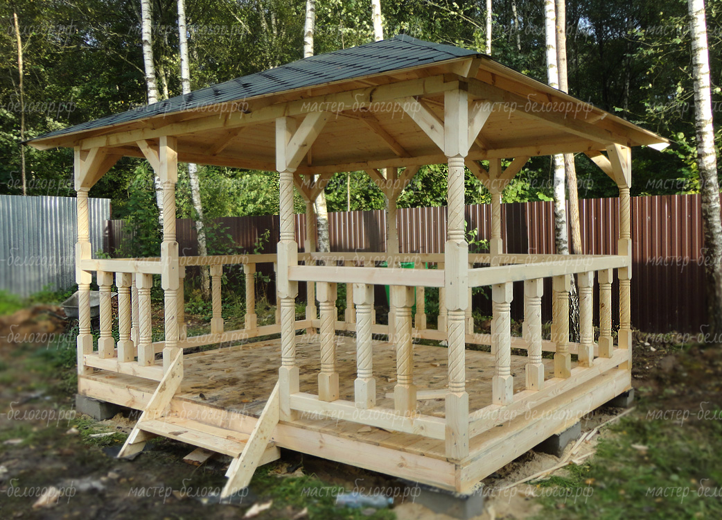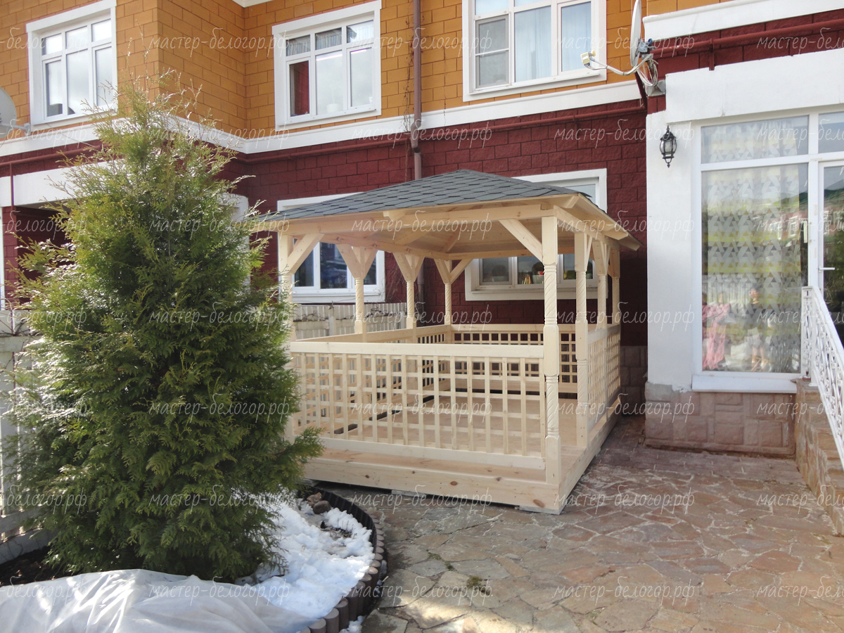 Крыша-ондулин,металлопрофиль или мягкая кровля(в зависимости от модели беседки).Цвет на выбор:красный,коричневый,зеленый.